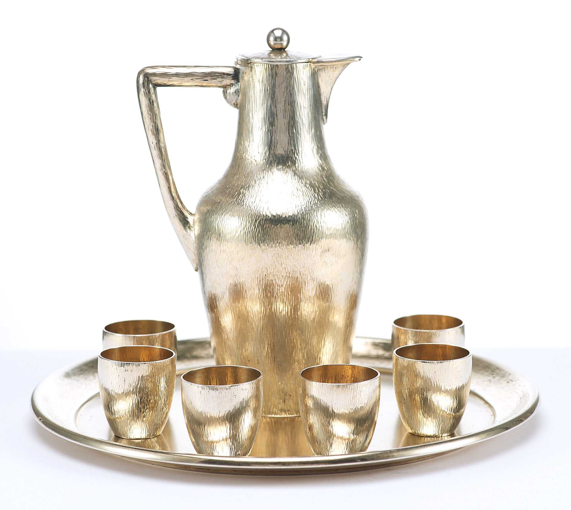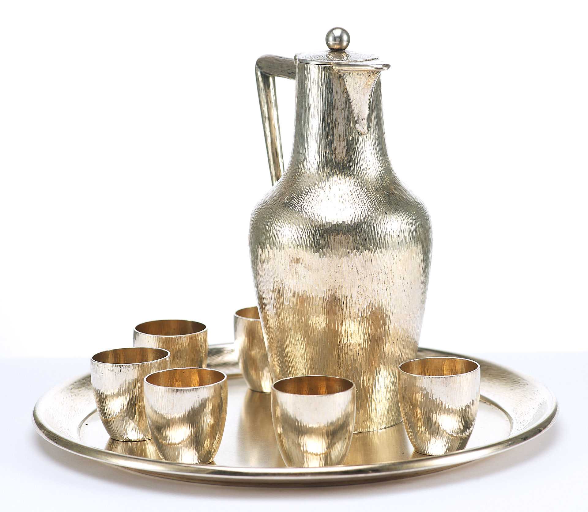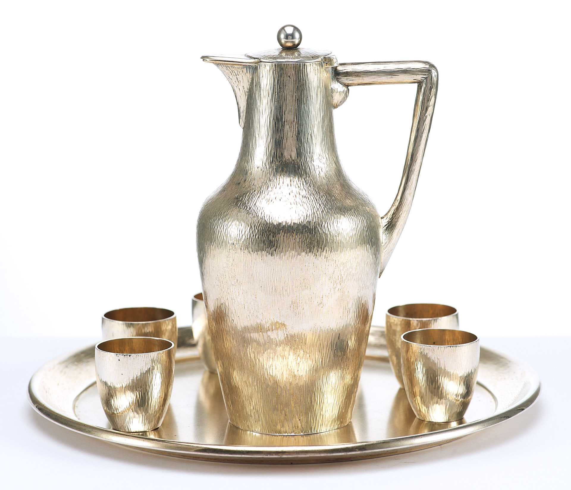 Представлен серебряный набор для ликера, состоящий из кувшинчика, шести стопок и подноса. Набор выполнен в сдержанной форме, тяготеющей к стилю ар-деко. Клейма: