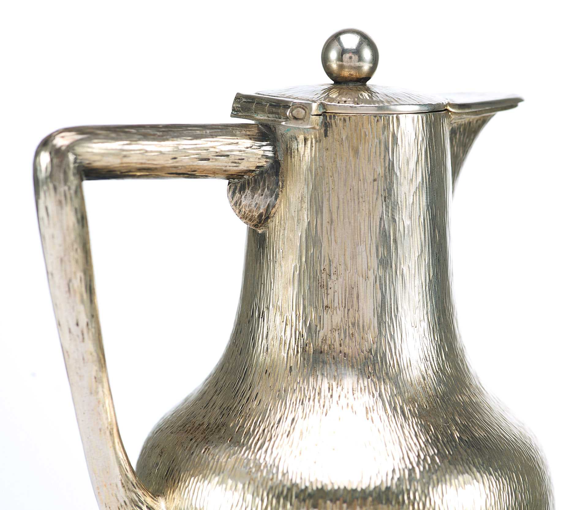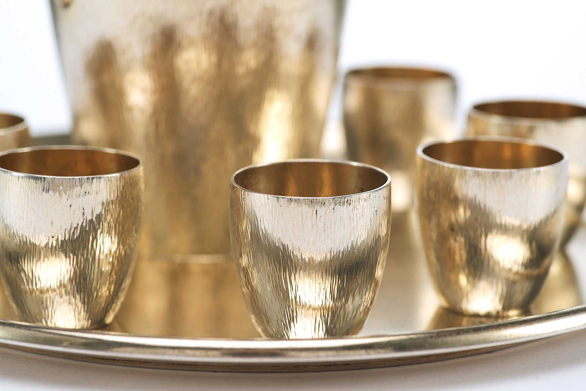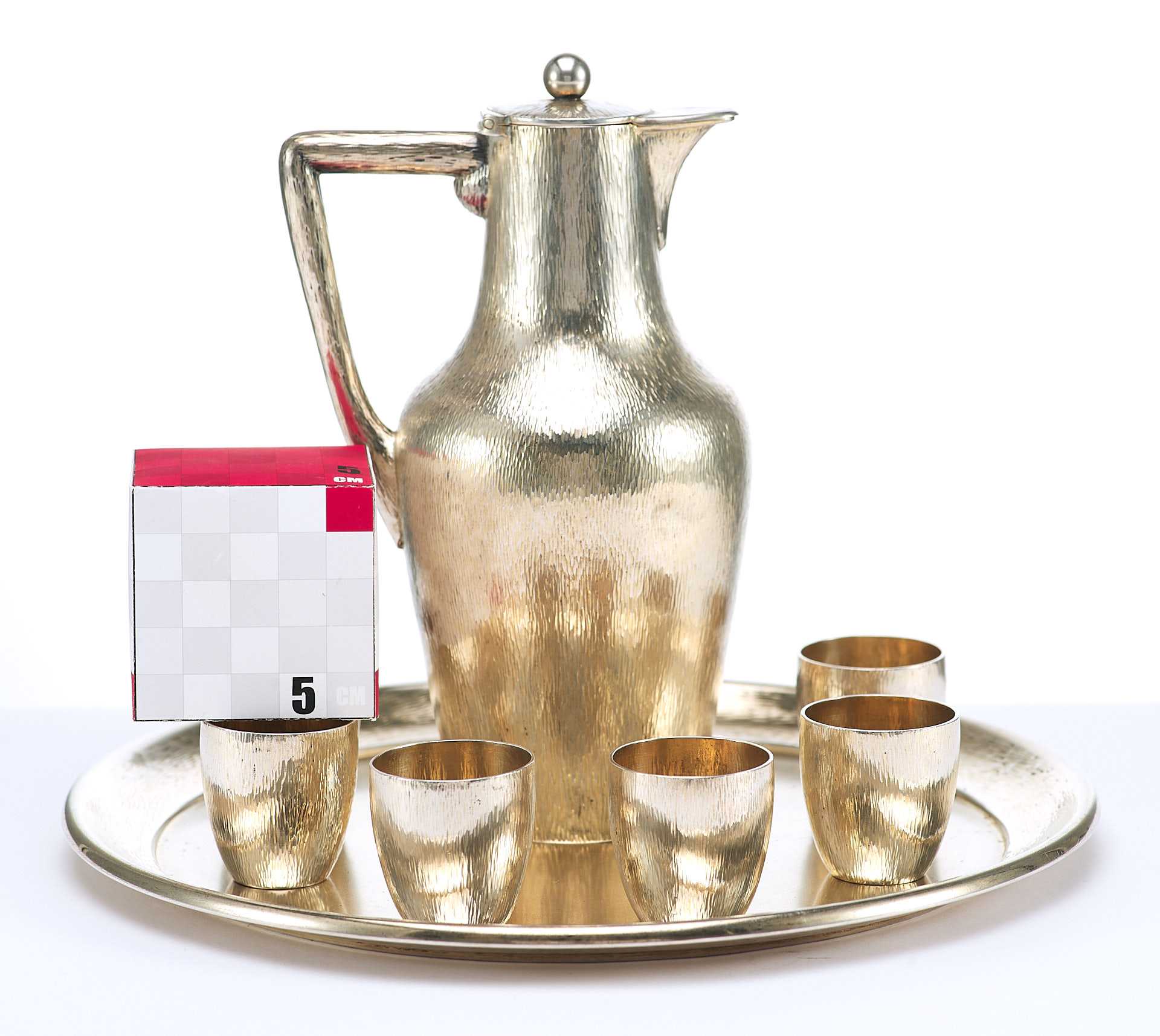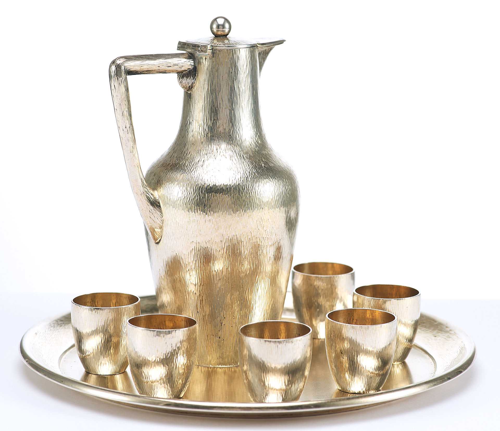 Представлен серебряный набор для ликера, состоящий из кувшинчика, шести стопок и подноса. Набор выполнен в сдержанной форме, тяготеющей к стилю ар-деко. Клейма: