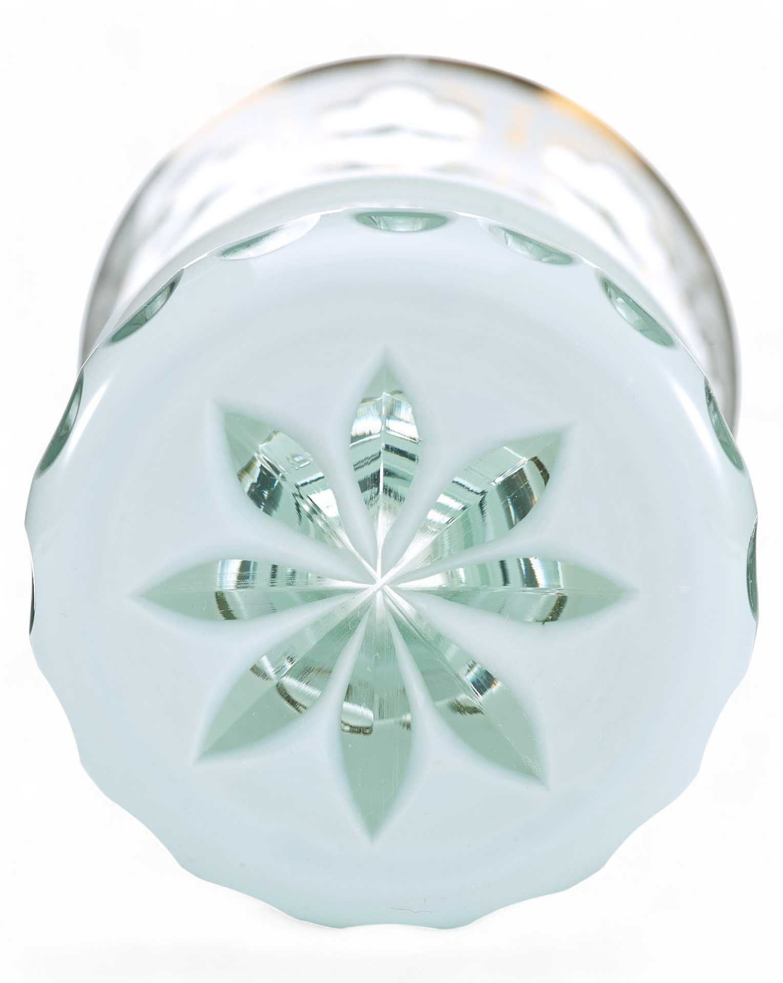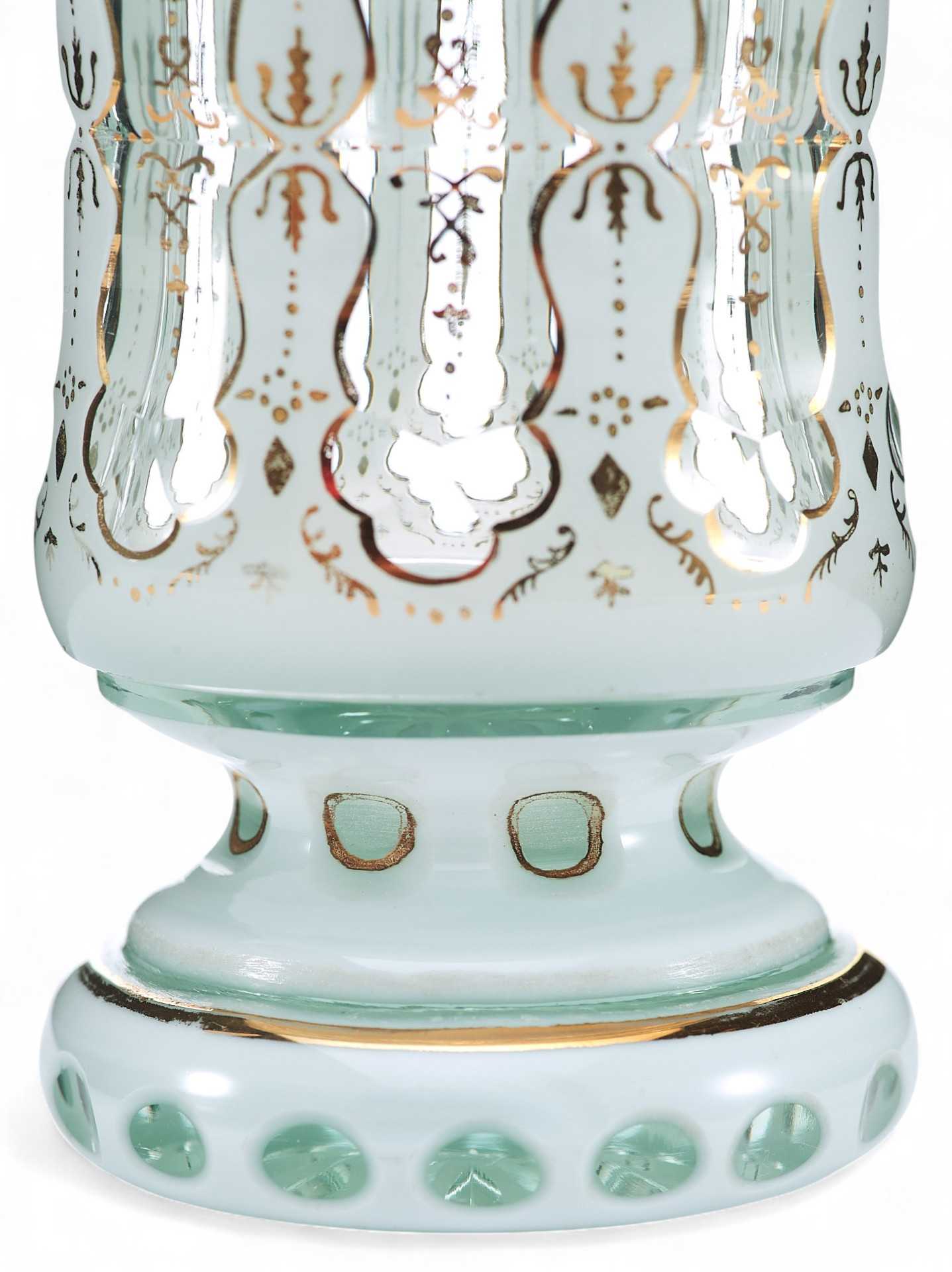 Тулово цилиндрическое, ножка короткая, основание круглое. Тулово декорировано вертикальными фигурными прорезями, обнажающими внутренние слои многослойного стекла: молочное, бесцветное. На ножке, основании прорезы в виде кругов. По краю слива золотая отводка. Тулово декорировано мелким растительным орнаментом.
