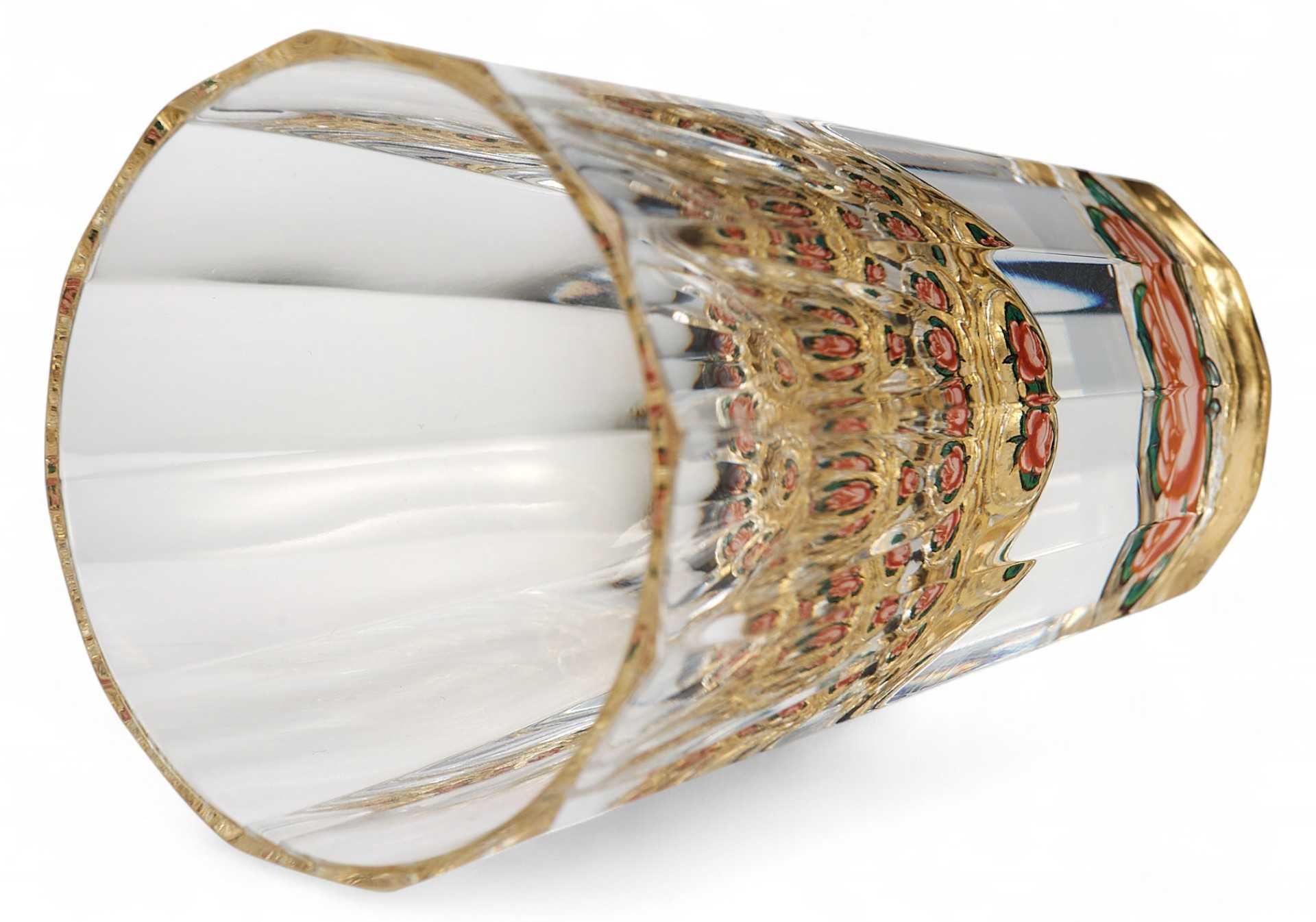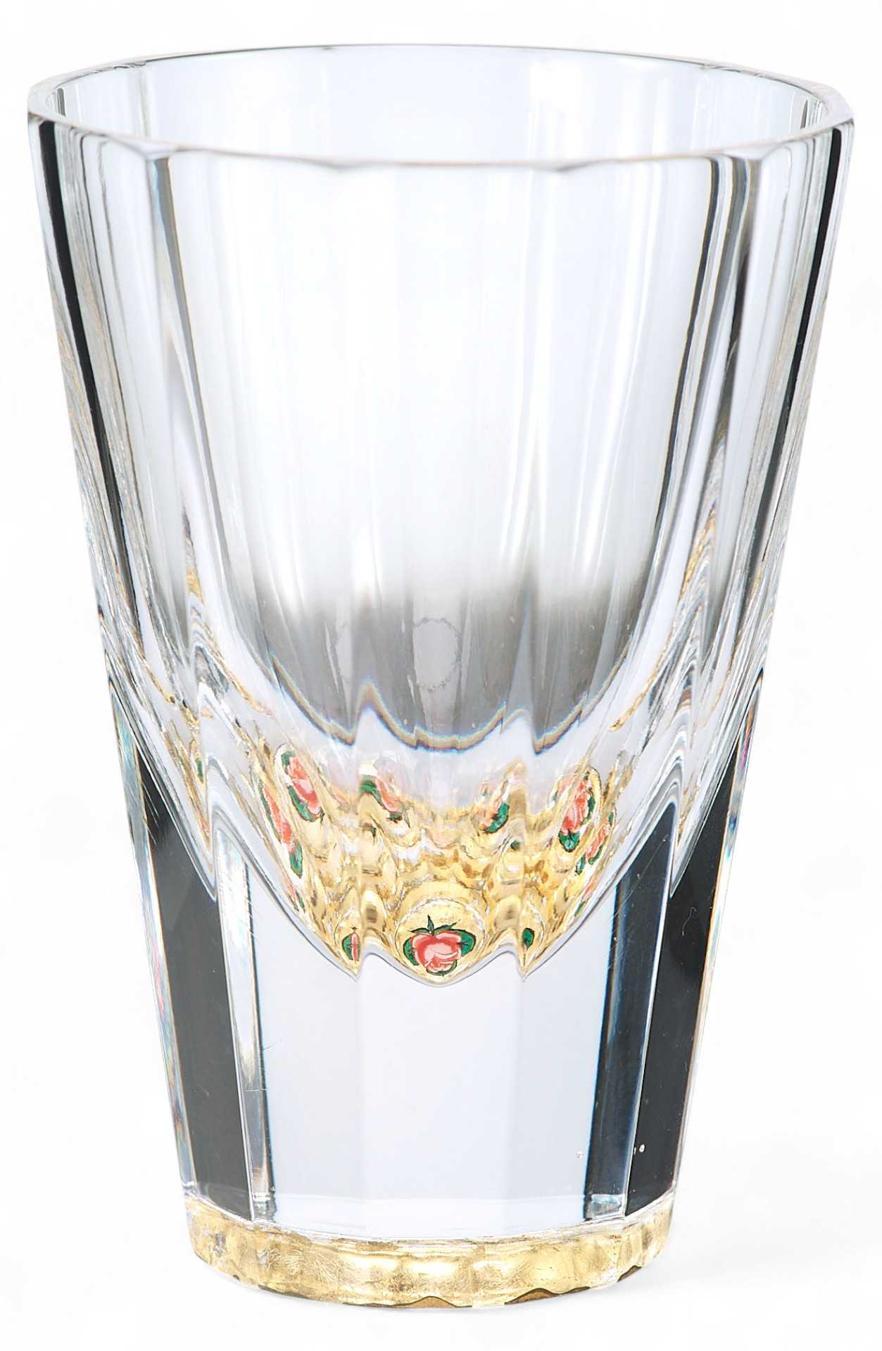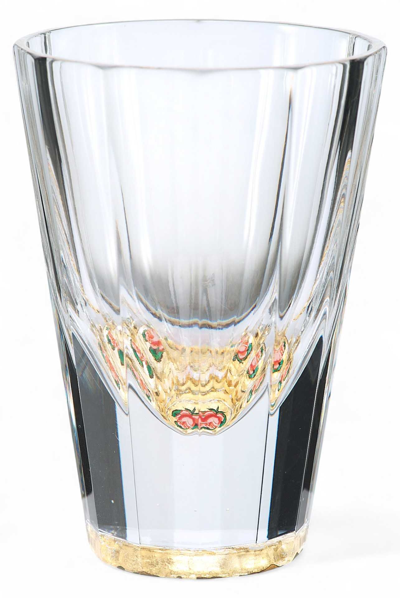 Тулово конусовидное, огранено. Дно плоское. На дне в круге изображение розовых бутонов. Основание стакана покрыто золочением. При этом среди разнообразных изобразительных мотивов, украшавших подобные предметы, наибольшей популярностью пользовались цветочные букеты, в которых, например, роза означала любовь и расположение, а незабудка - долгую память. В целом подобный мотив расшифровывался как “незабвенная любовь”. Нередко они служили дорогим подарком, о чем свидетельствует декоративное изображение-символ, их дарили на память друзьям и родным и