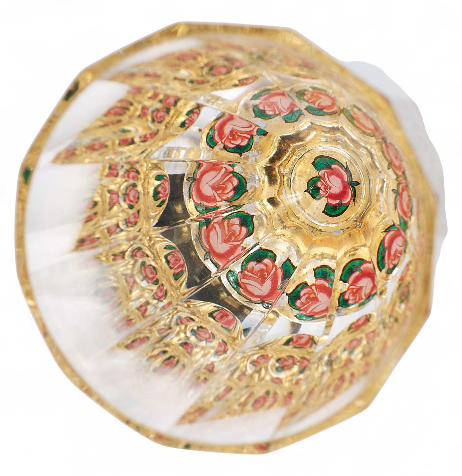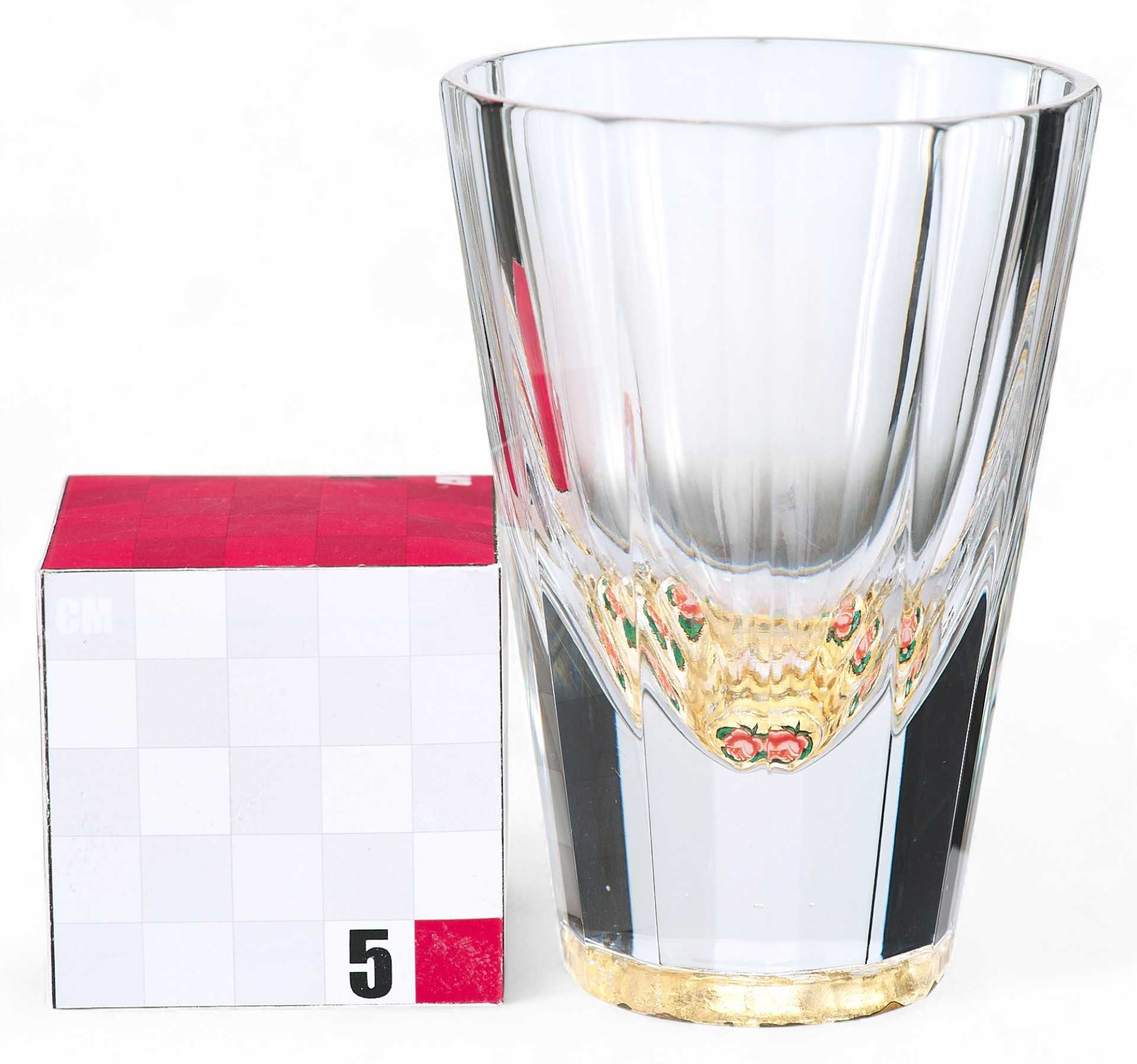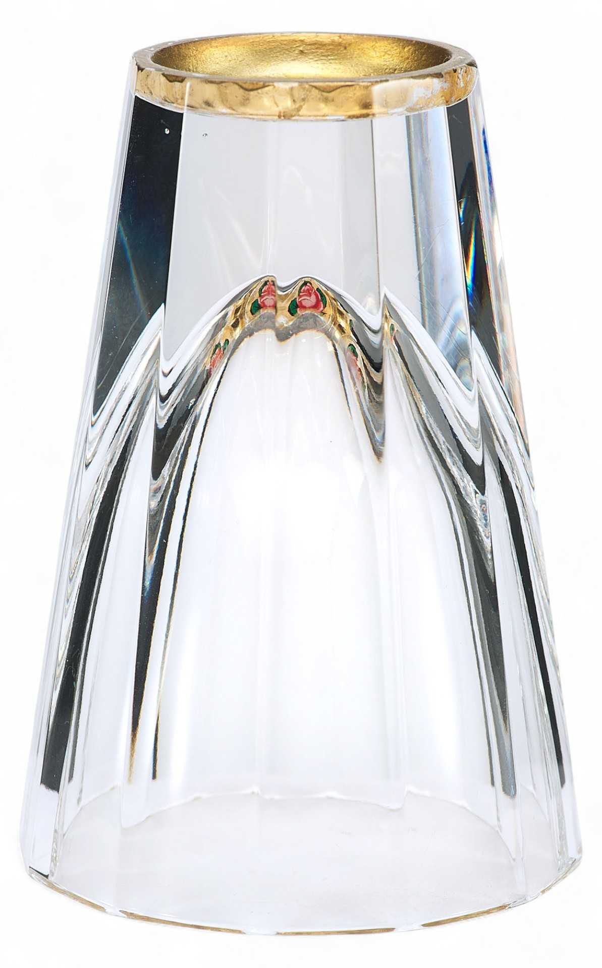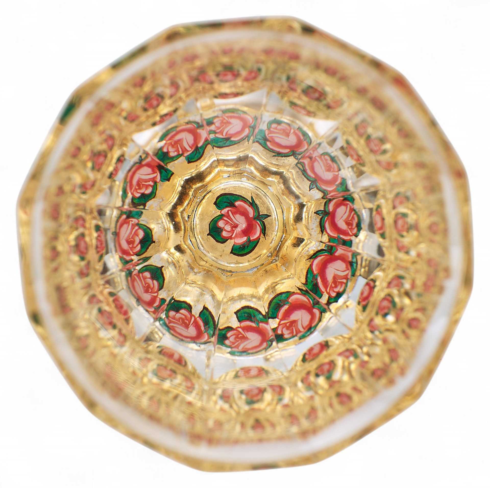Тулово конусовидное, огранено. Дно плоское. На дне в круге изображение розовых бутонов. Основание стакана покрыто золочением. При этом среди разнообразных изобразительных мотивов, украшавших подобные предметы, наибольшей популярностью пользовались цветочные букеты, в которых, например, роза означала любовь и расположение, а незабудка - долгую память. В целом подобный мотив расшифровывался как “незабвенная любовь”. Нередко они служили дорогим подарком, о чем свидетельствует декоративное изображение-символ, их дарили на память друзьям и родным и