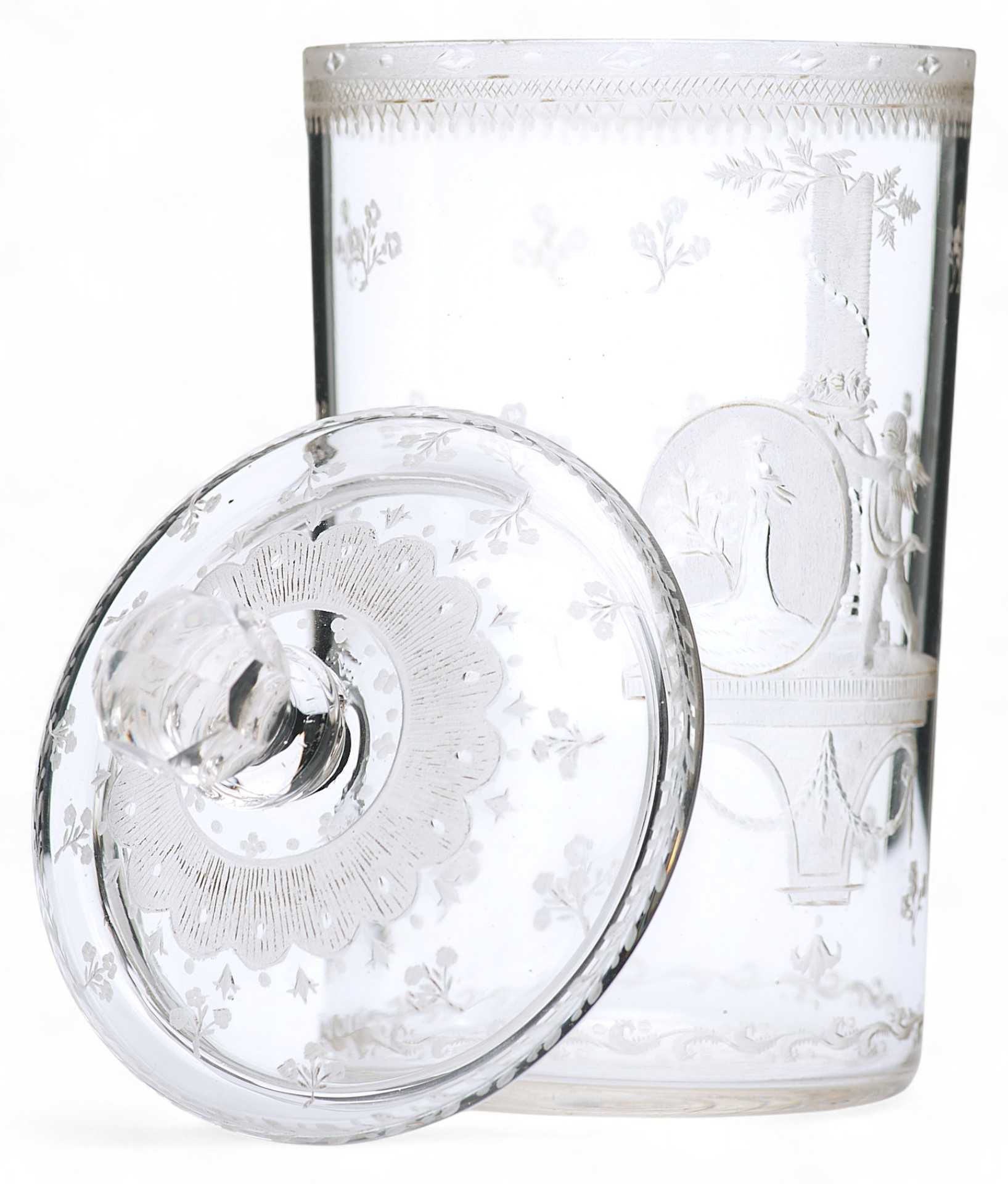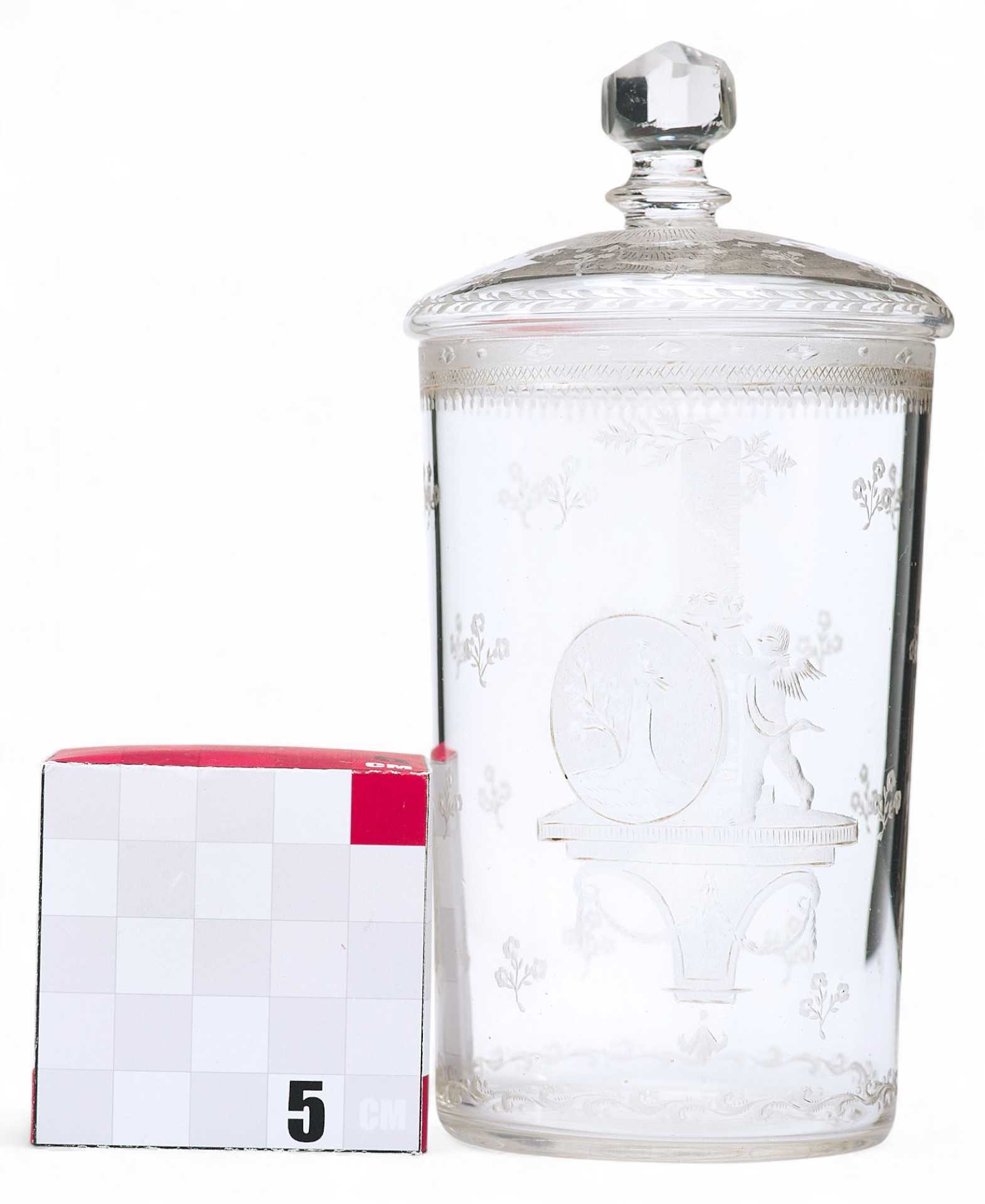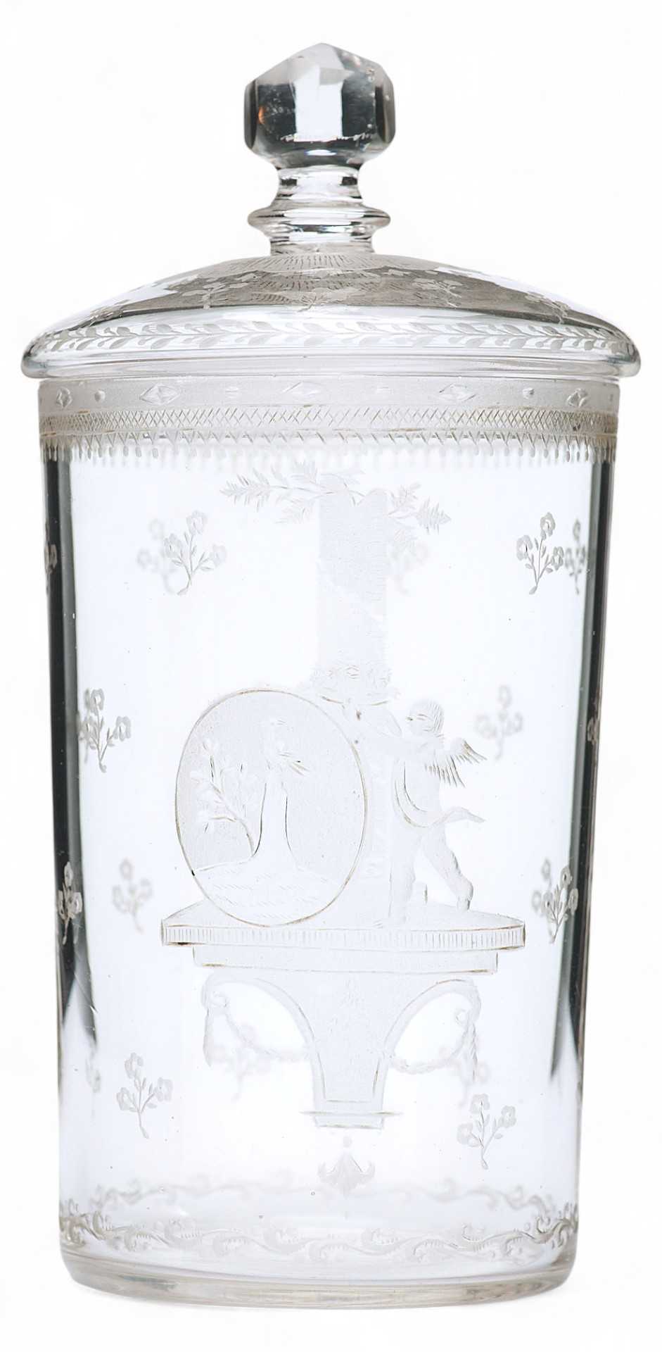 Представлен прозрачный стакан с крышкой, украшенный матовой гравировкой в стиле ампир. На стенках изображены медальоны с купидонами и гирляндами цветов. Богемия - историческая область Чехии, в которой около четырех столетий назад появилось производство стеклянной посуды. Сначала местные стеклодувы использовали венецианское стекло, но оно не подходило для резьбы из-за своей непрочности. В итоге мастерами было создано стекло большей плотности