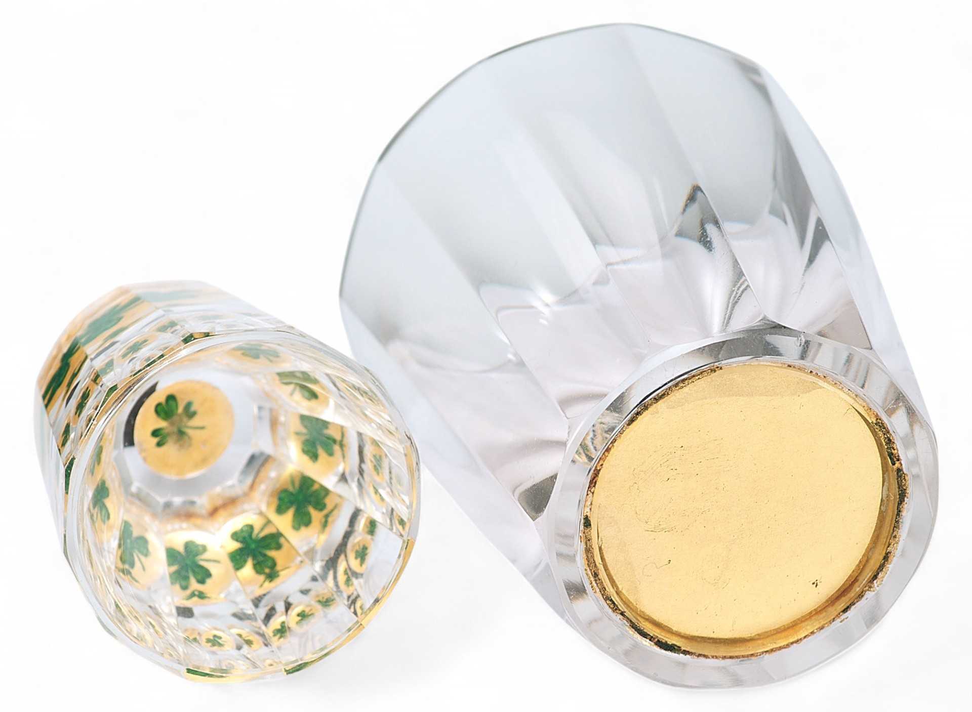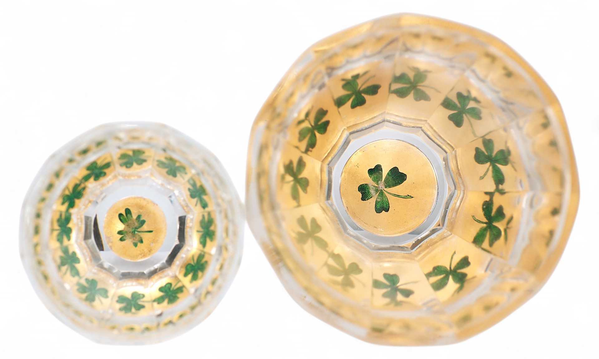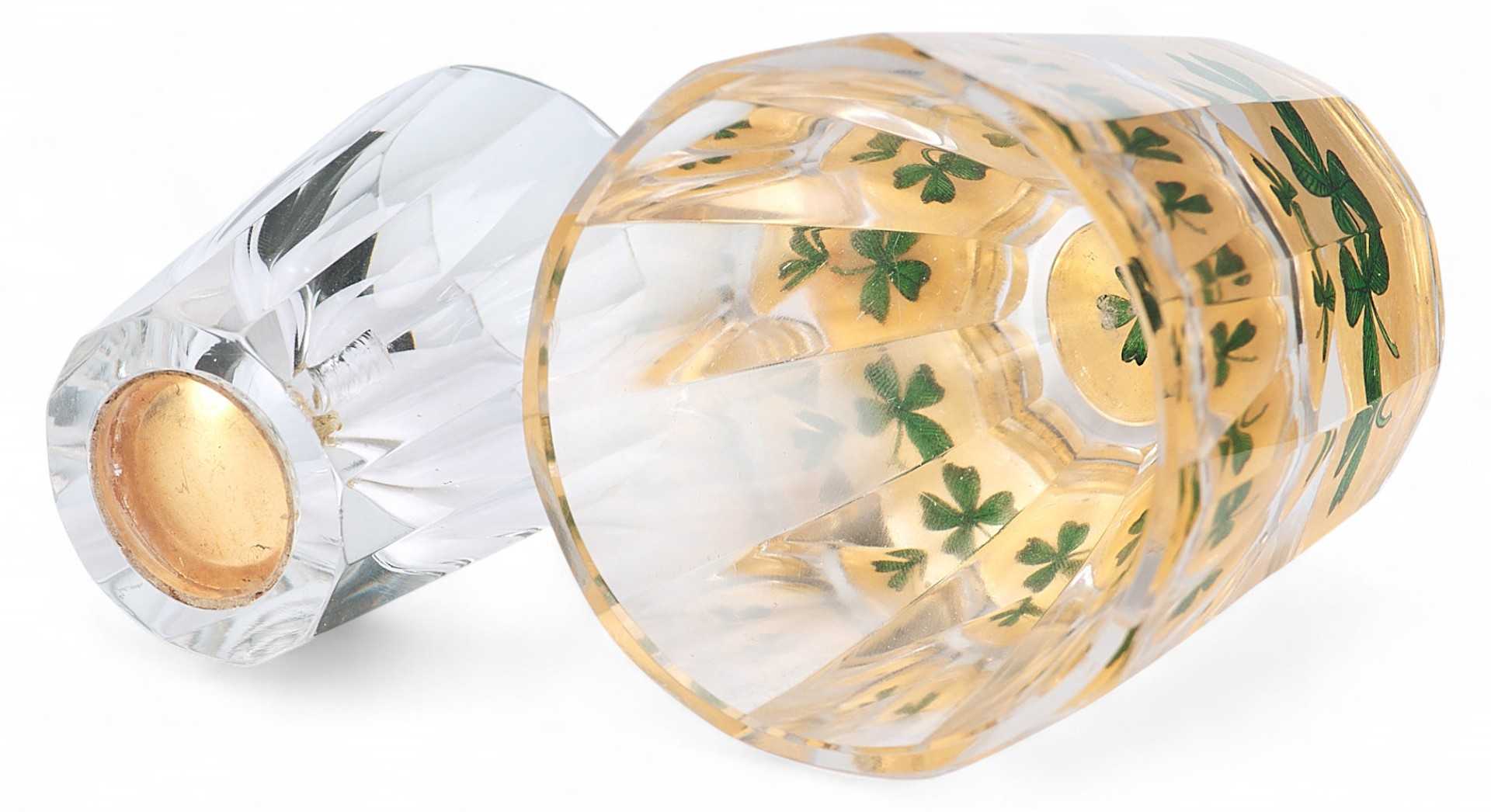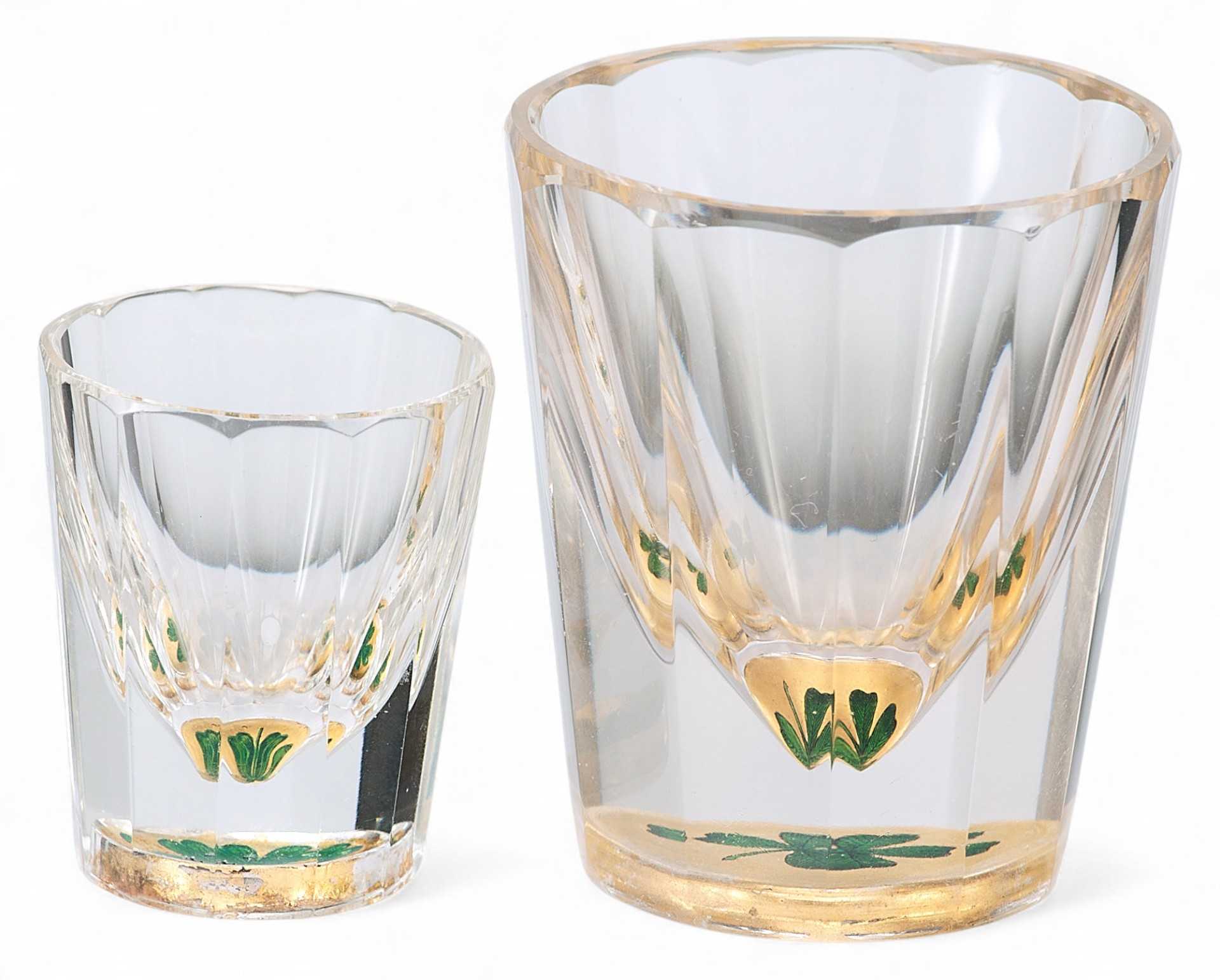 Пара граненых стаканчиков из бесцветного стекла. Украшены росписью в виде зеленого четырехлистного клевера. Согласно древним кельтским поверьям четырехлистный клевер способен быть эффективной защитой от злых духов. В одной из старых германских легенд говорится о том, что такое растение - это частица рая, которую Ева захватила с собой, когда ее вместе с Адамом изгнали оттуда. В Древнем Египте его дарили влюбленным при благословении новой пары.