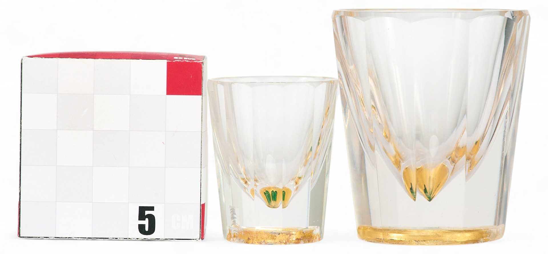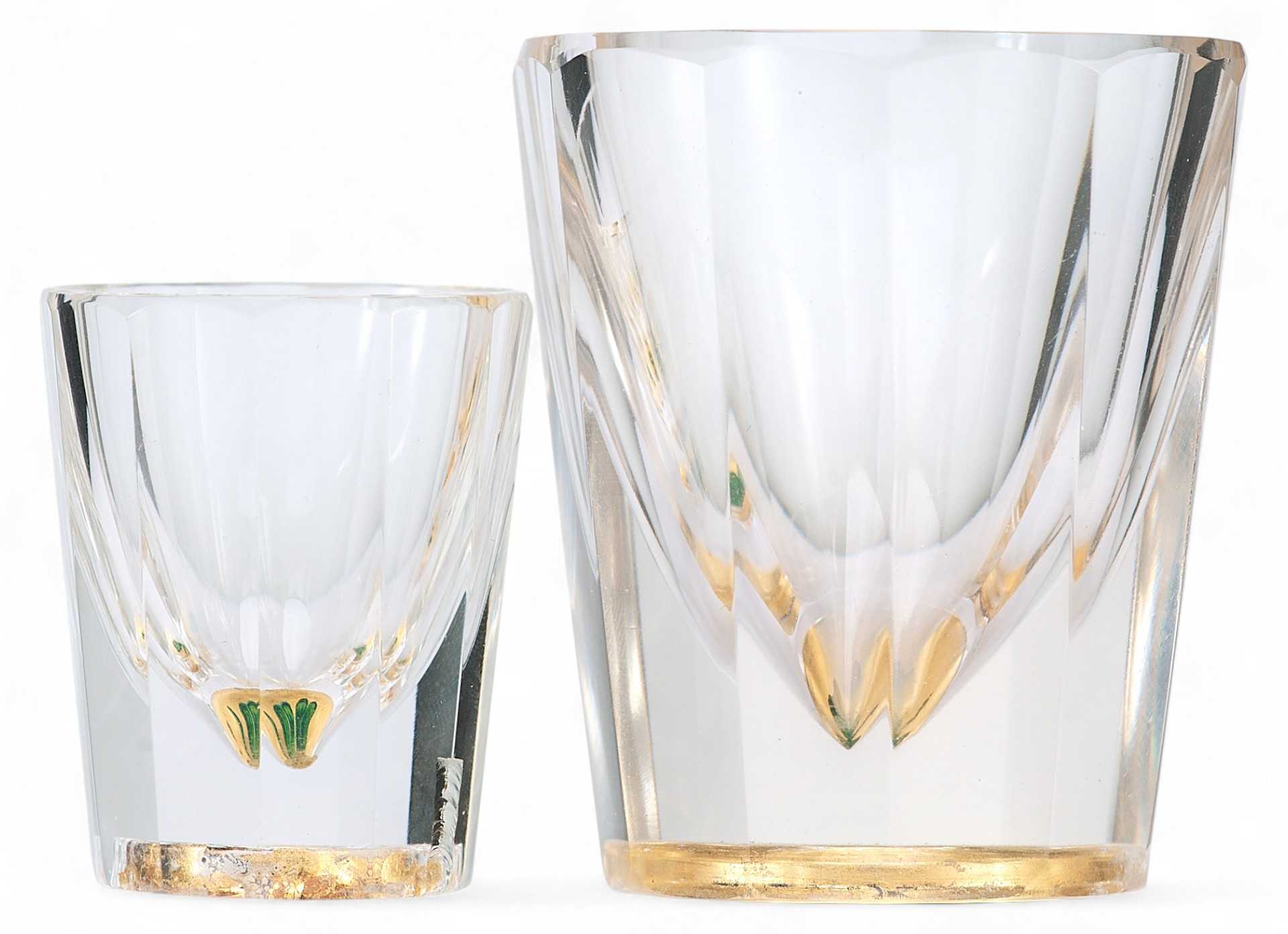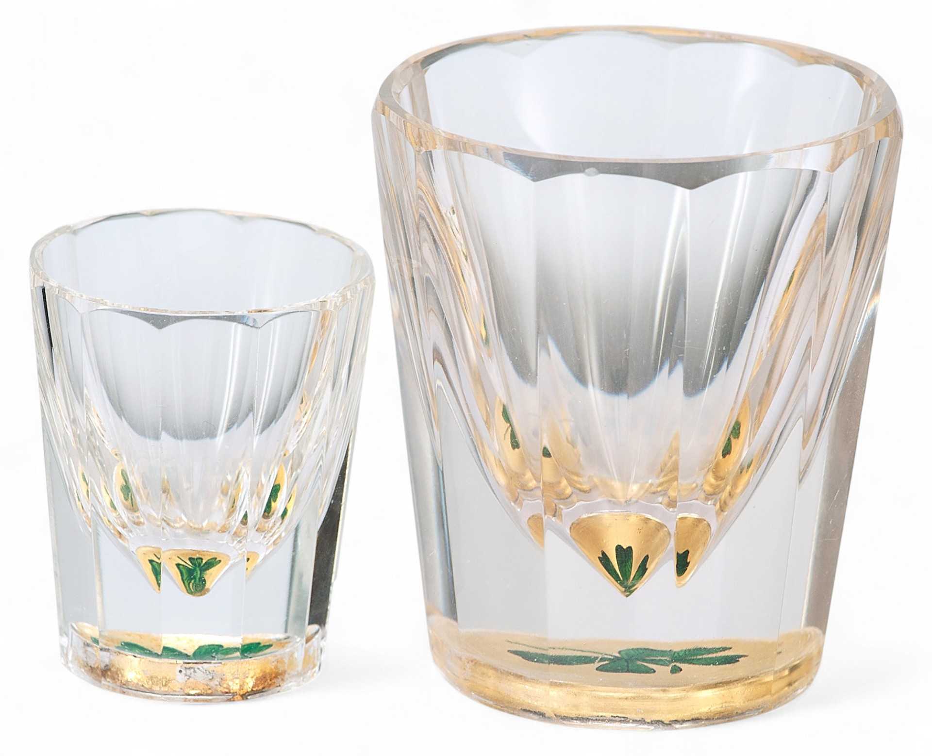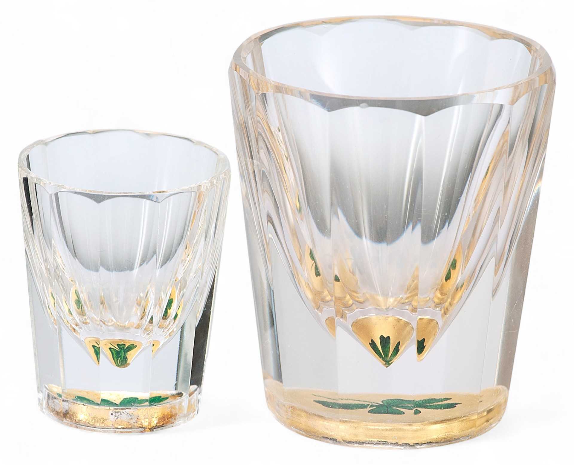 Пара граненых стаканчиков из бесцветного стекла. Украшены росписью в виде зеленого четырехлистного клевера. Согласно древним кельтским поверьям четырехлистный клевер способен быть эффективной защитой от злых духов. В одной из старых германских легенд говорится о том, что такое растение - это частица рая, которую Ева захватила с собой, когда ее вместе с Адамом изгнали оттуда. В Древнем Египте его дарили влюбленным при благословении новой пары.
