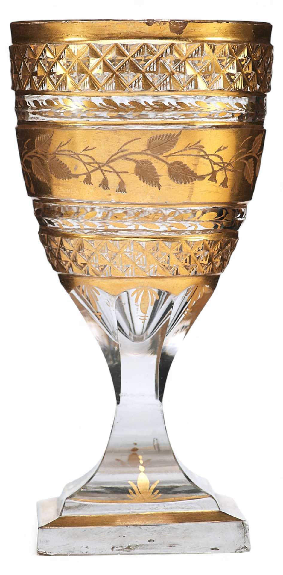 Бокал в стиле неоампир, украшенный гравировкой и золочением. Богемия - историческая область Чехии, в которой около четырех столетий назад появилось производство стеклянной посуды. Сначала местные стеклодувы использовали венецианское стекло, но оно не подходило для резьбы из-за своей непрочности. В итоге мастерами было создано стекло большей плотности и устойчивости.