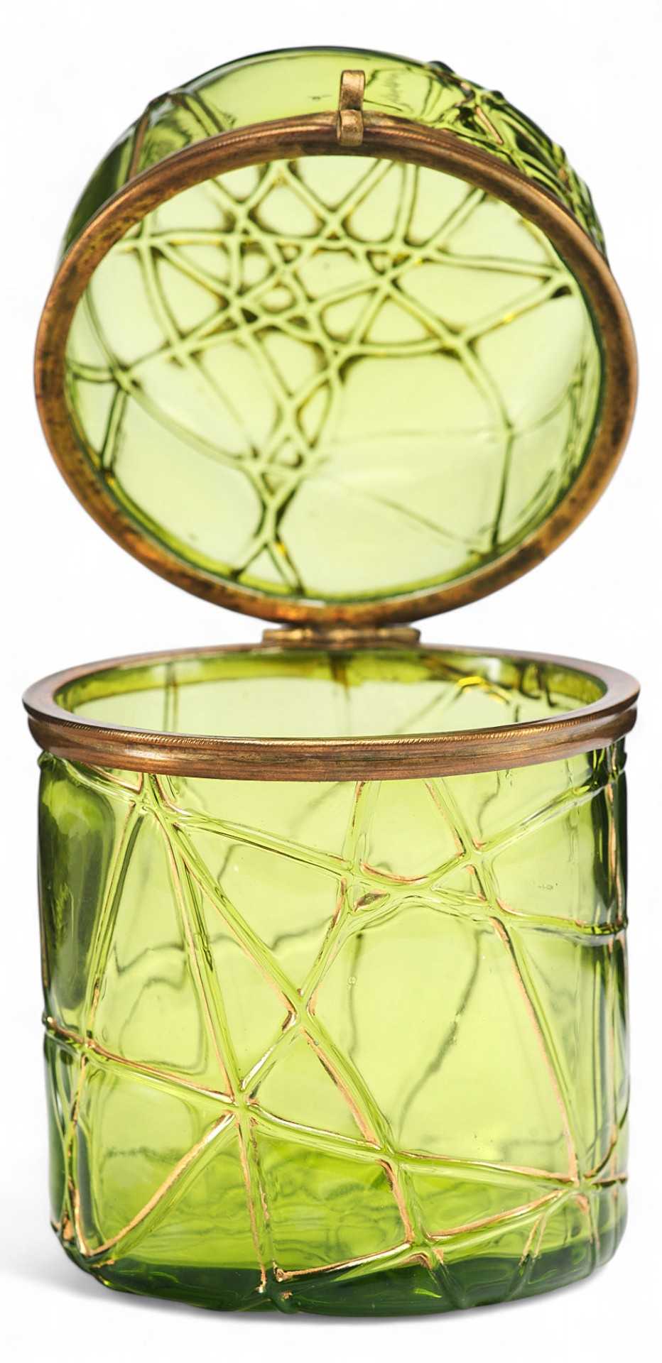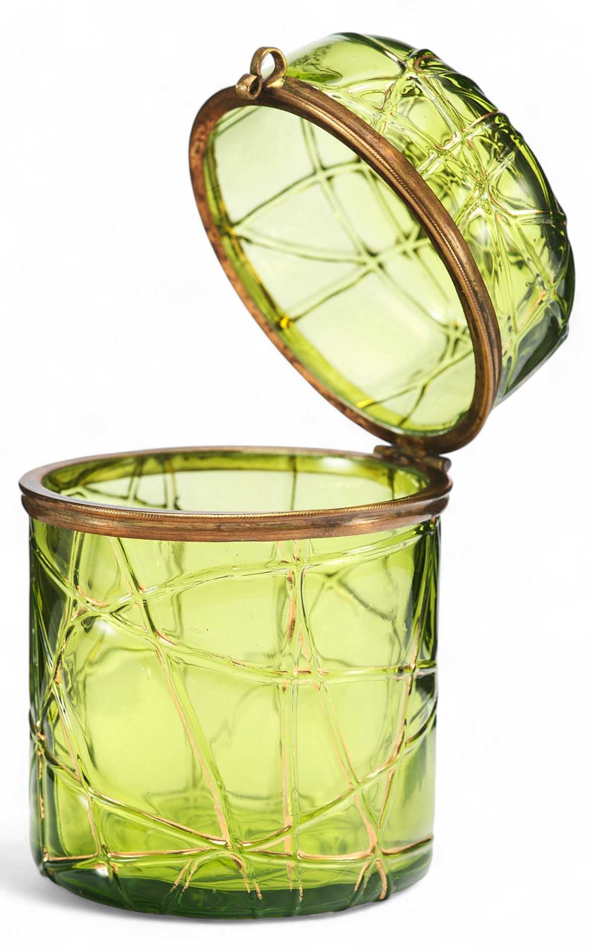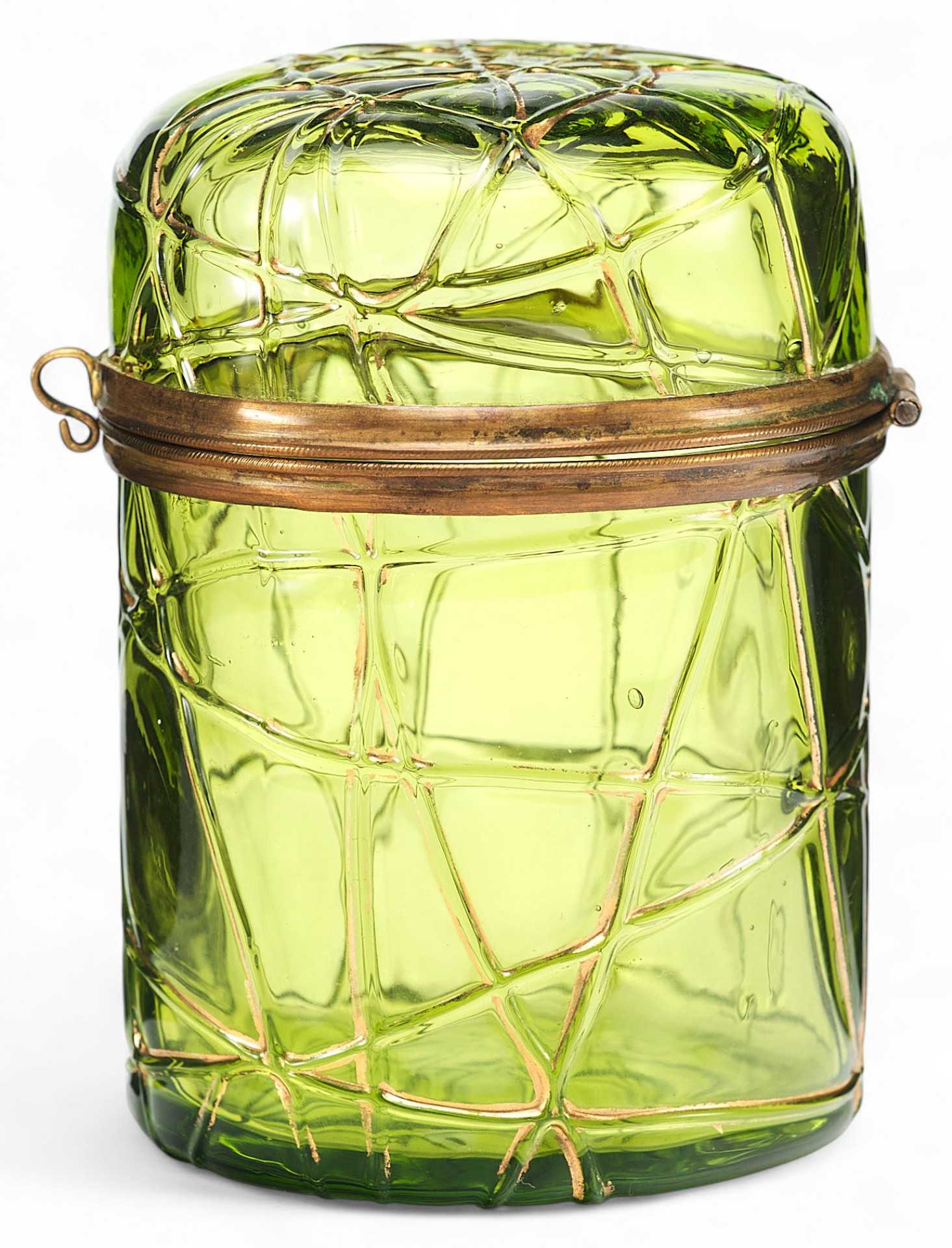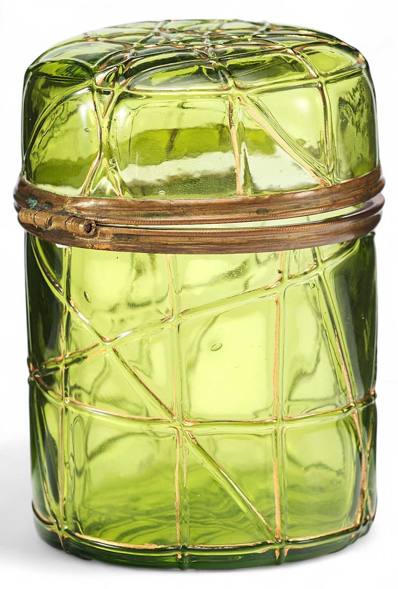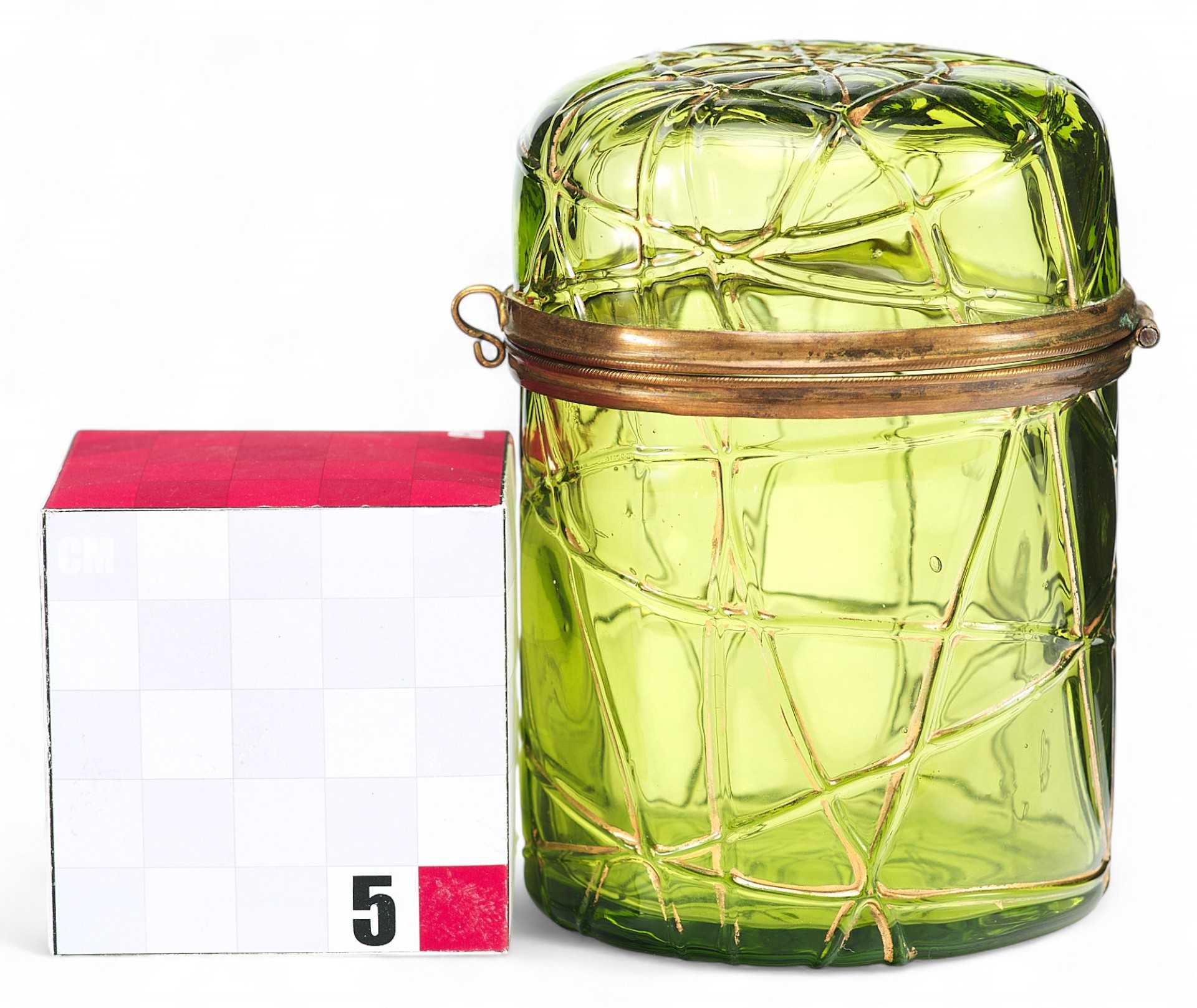 Баночка из цветного стекла. Выемчатые прожилки из цветного стекла характерны для экспериментального направления в стеклоделии эпохи модерна. Тип художественного стекла соответствует стилю модерн. Качество изготовления стекла позволяет предположить, что предмет был изготовлен в Богемии.