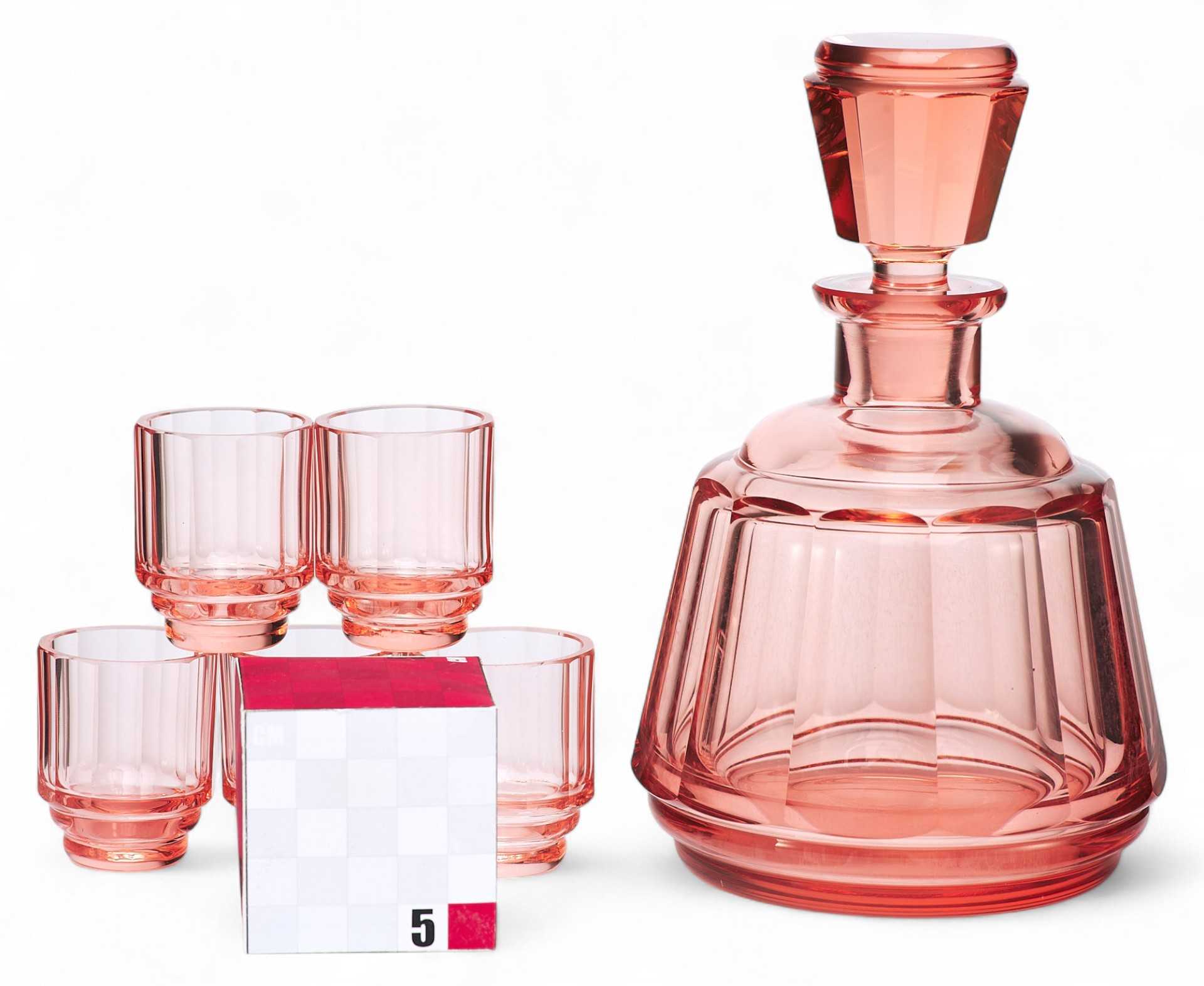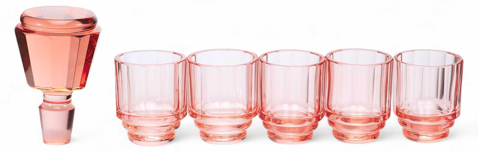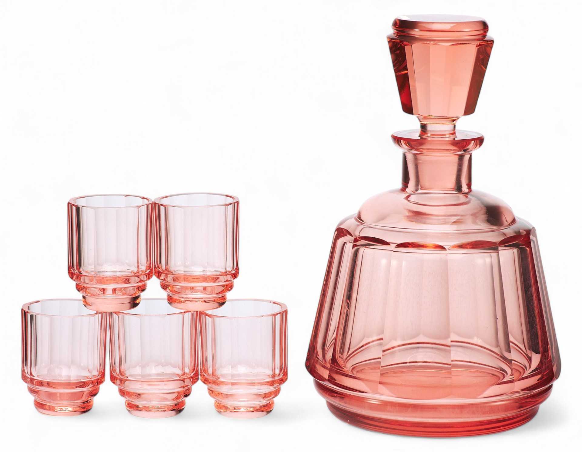 Оригинальный набор для алкогольных напитков, состоящий из графина и пяти стопок. Художественные формы предметов соответствуют стилю Ар Деко.