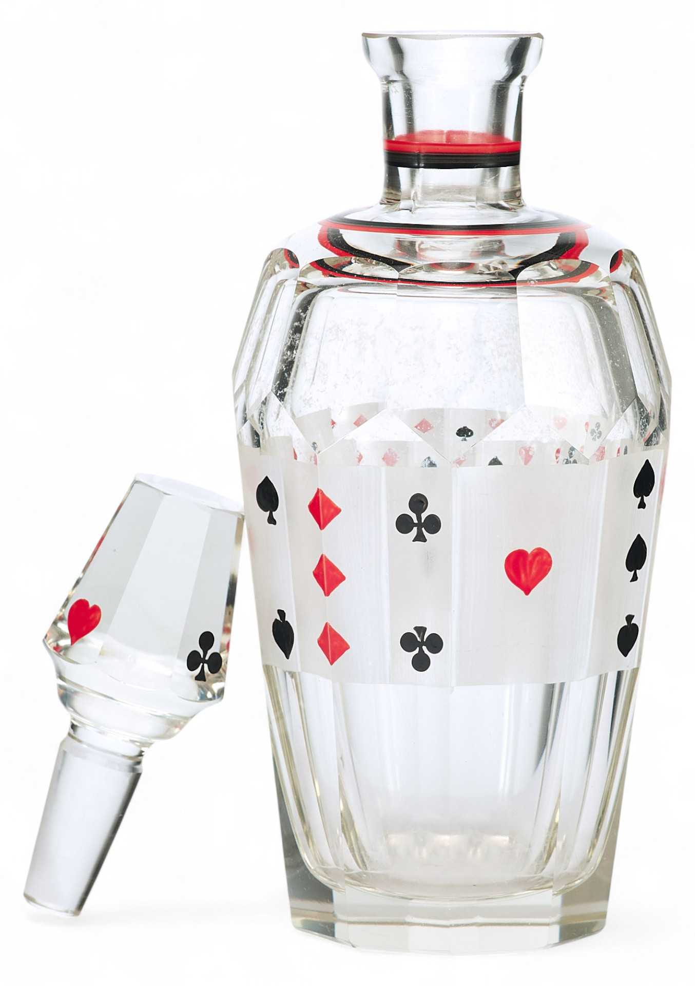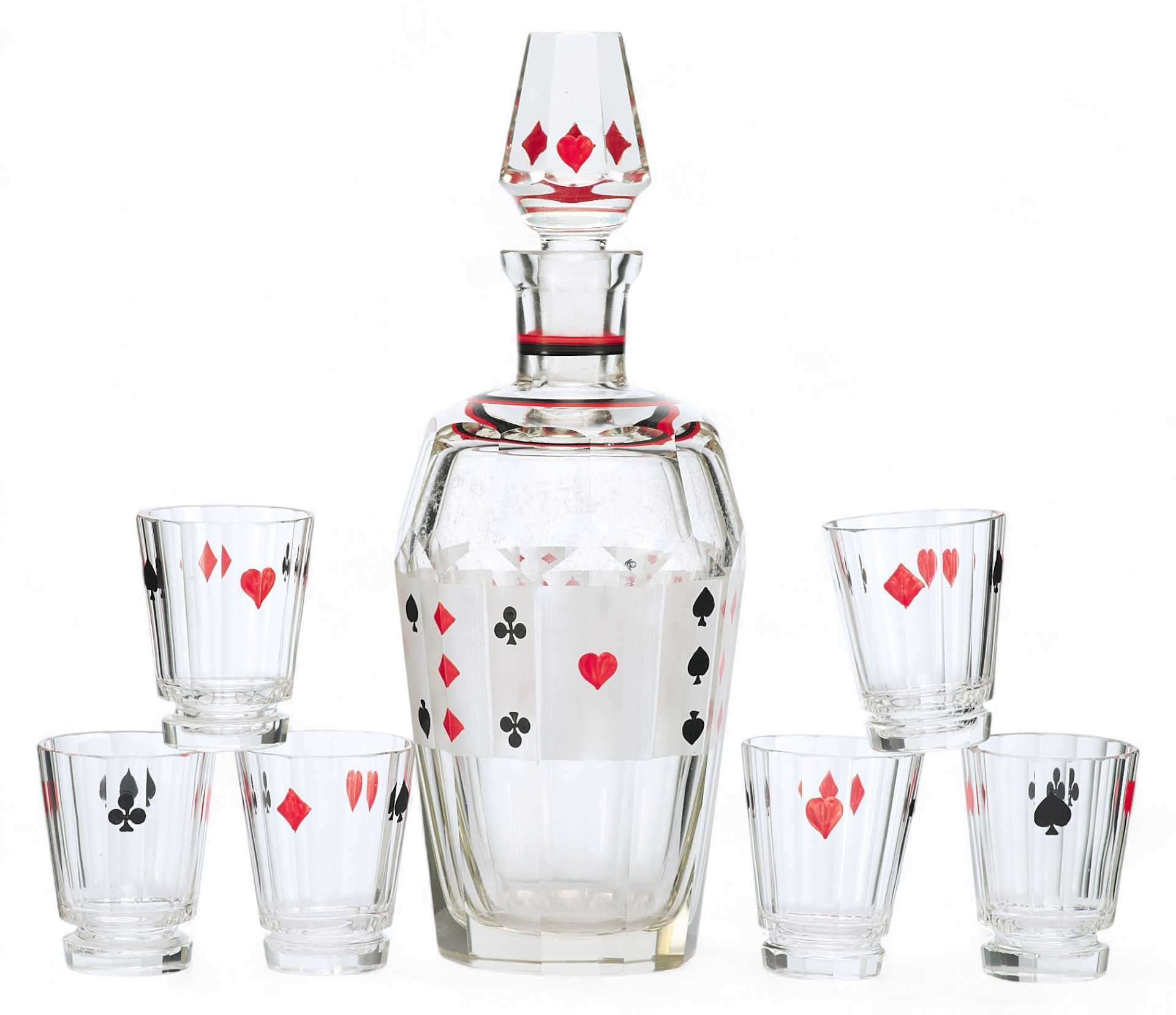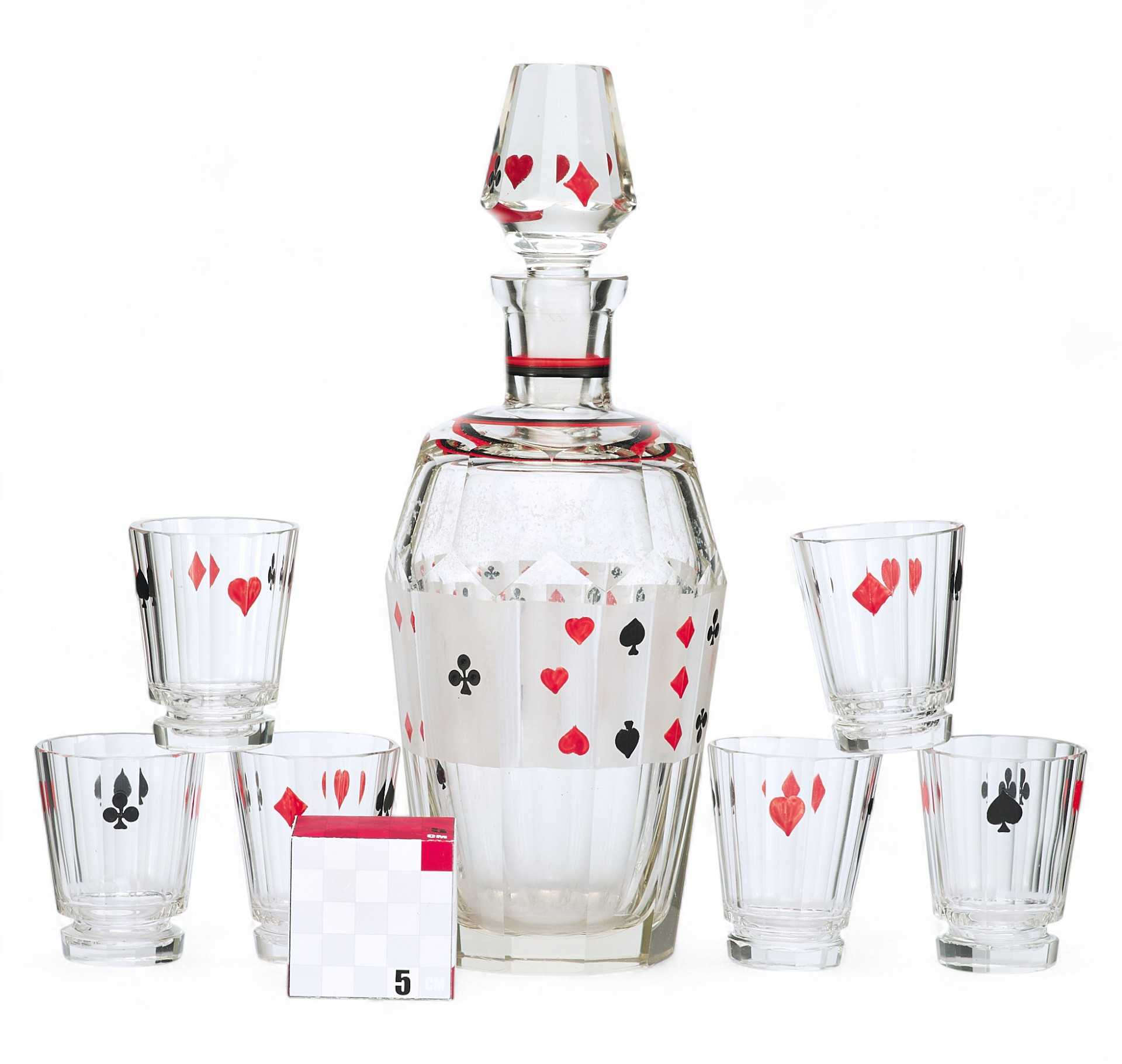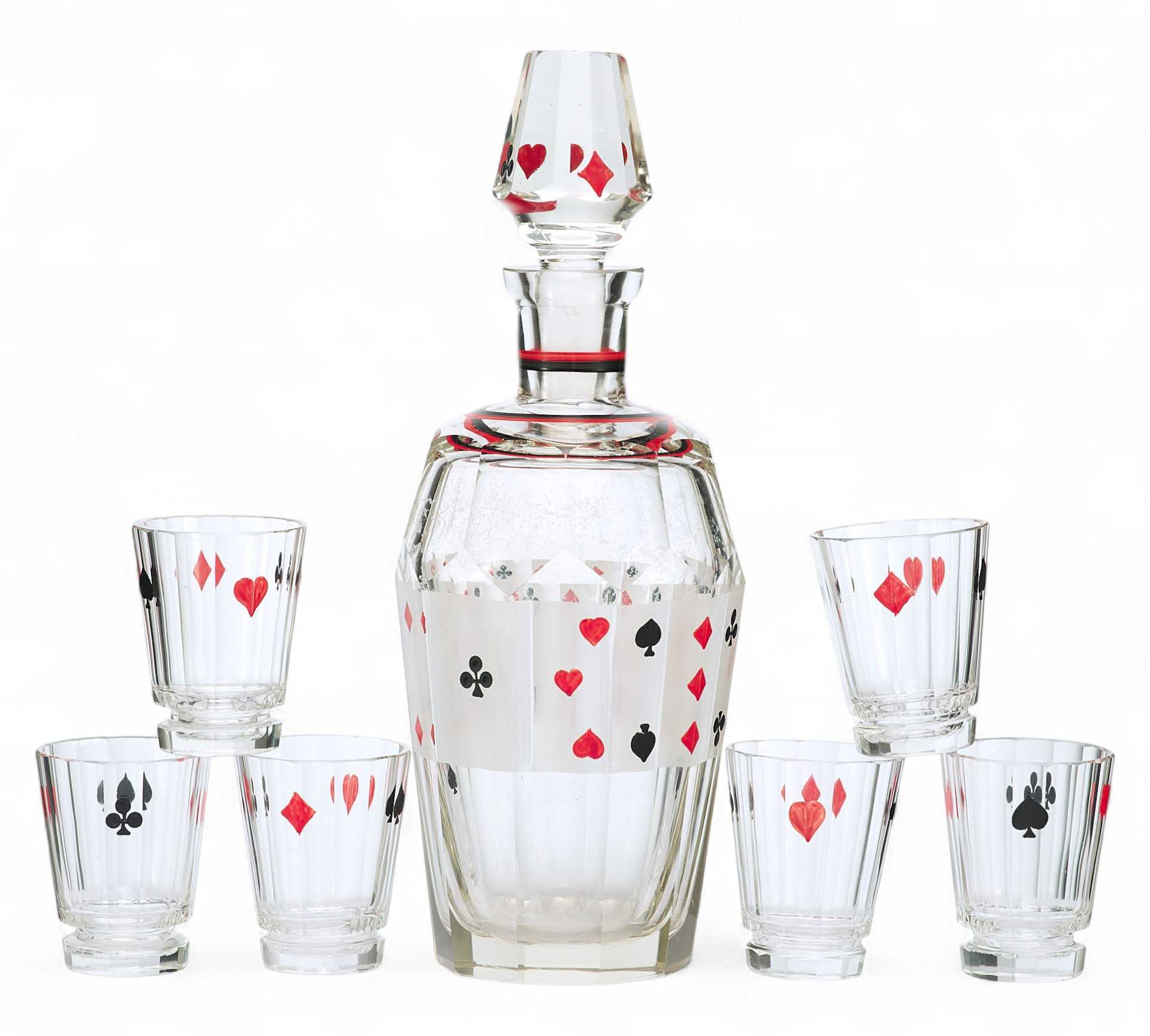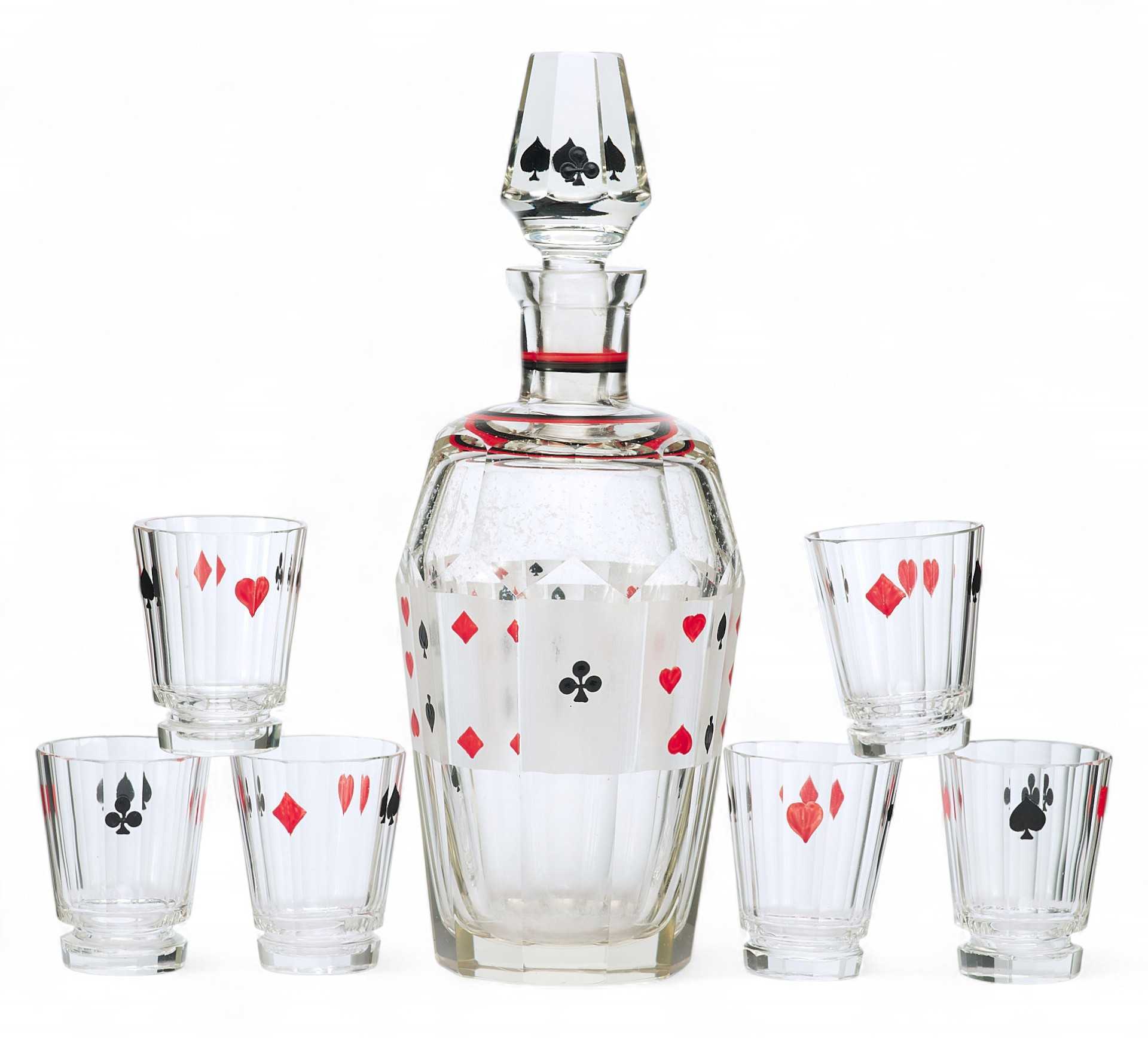 Набор для алкогольных напитков (виски, бренди, шнапса или водки) состоящий из: графина с пробкой и шести стопок украшенных росписью в виде символов карточных мастей. Графины для алкогольных напитков, как правило, по внешнему