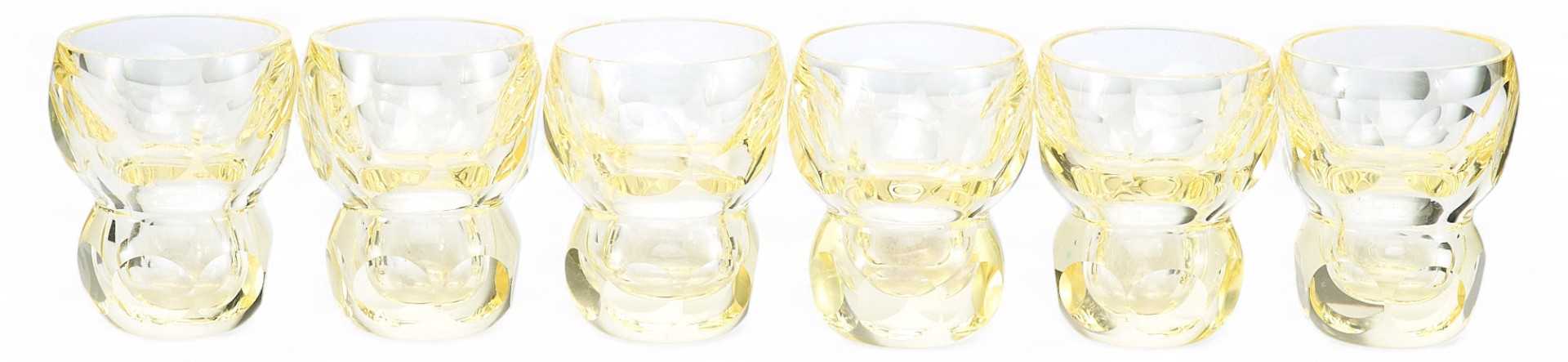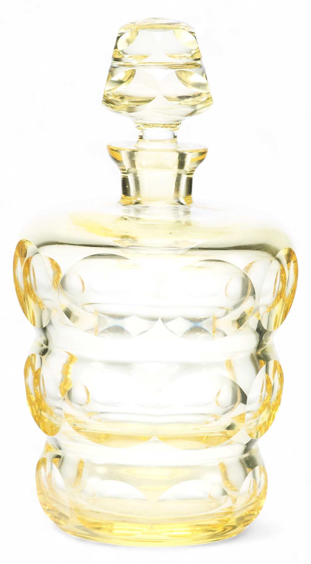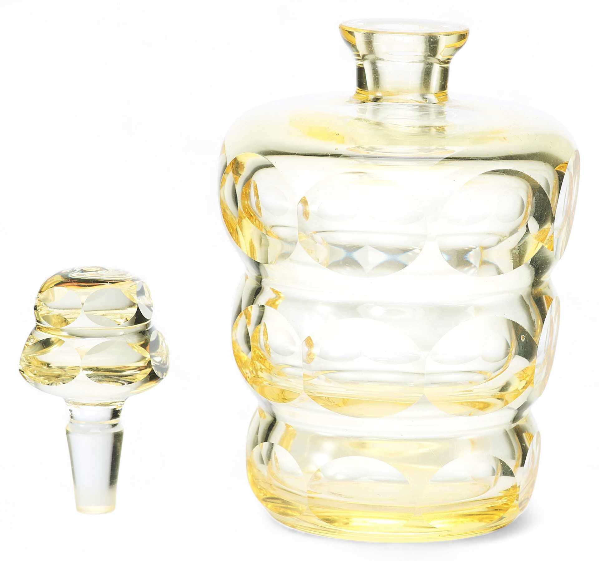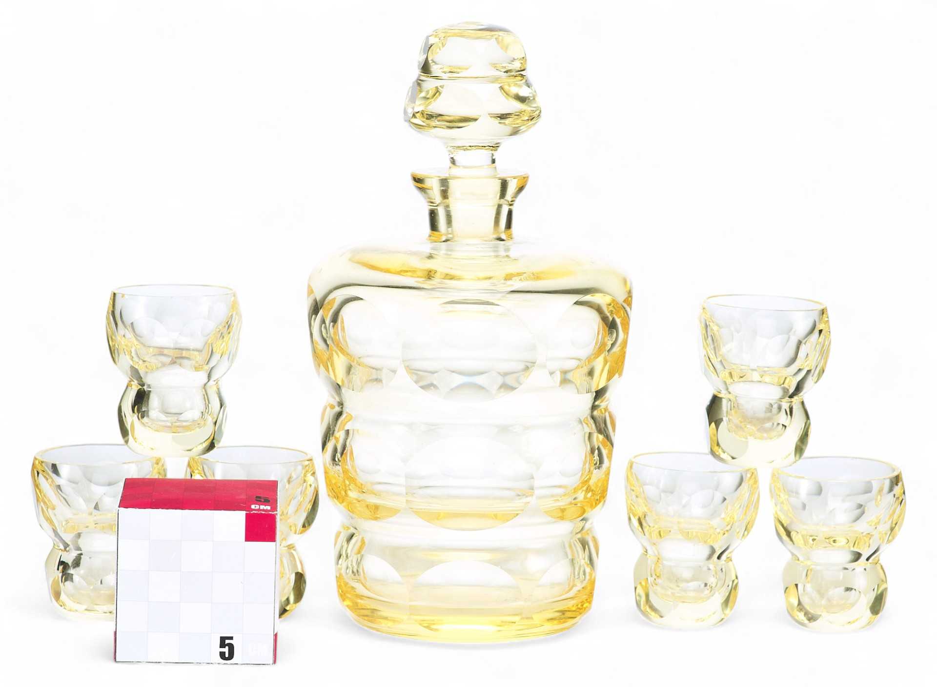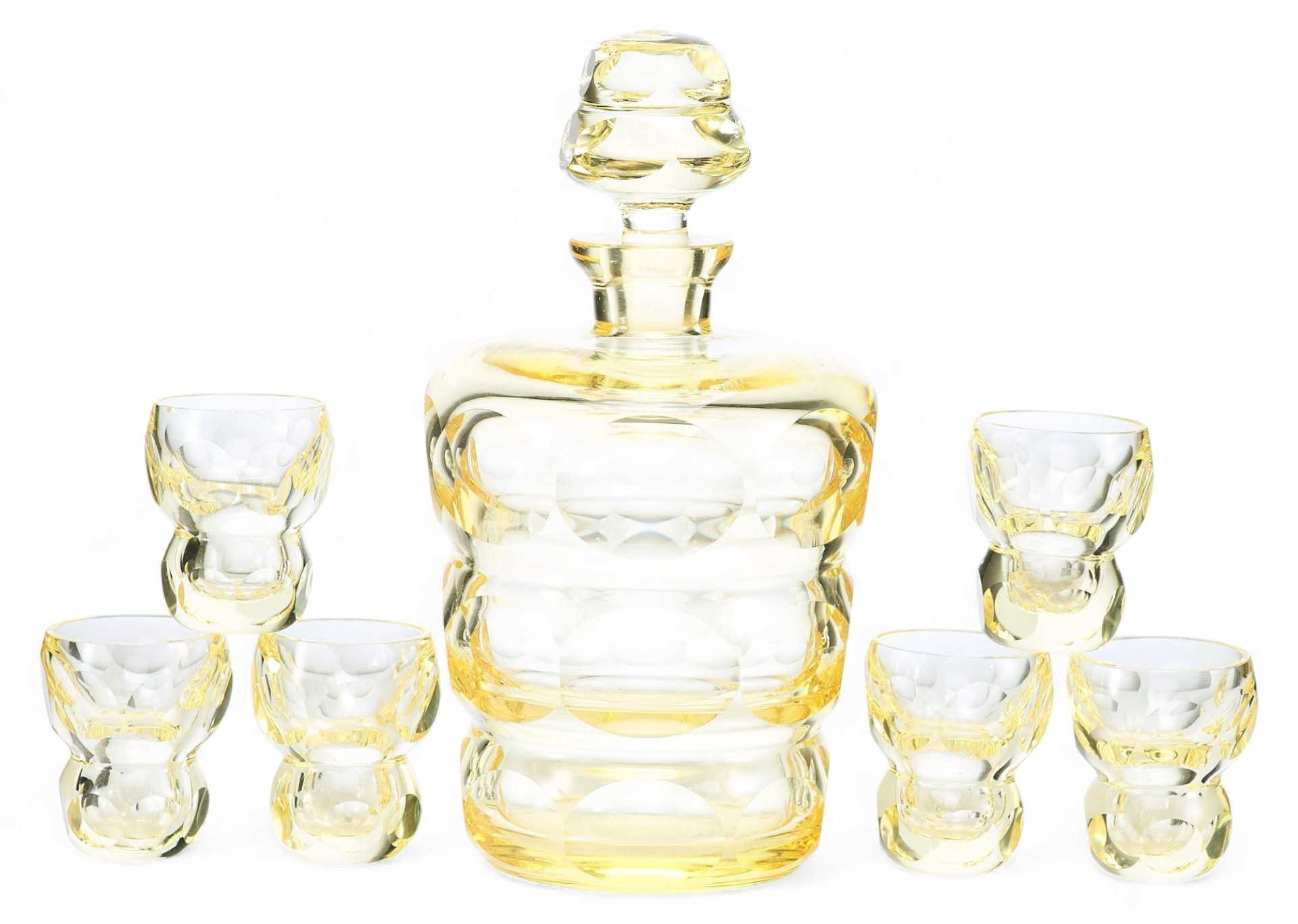 Оригинальный набор для алкогольных напитков, состоящий из 6 стопок и одного графина. На поверхности предметов огранка в виде овалов и кругов. Художественные формы предметов набора соотвстствлгот стилю Ардеко. По своим художественным признакам и качеству обработки материала можно предположить, что набор изготовлен в Богемии.