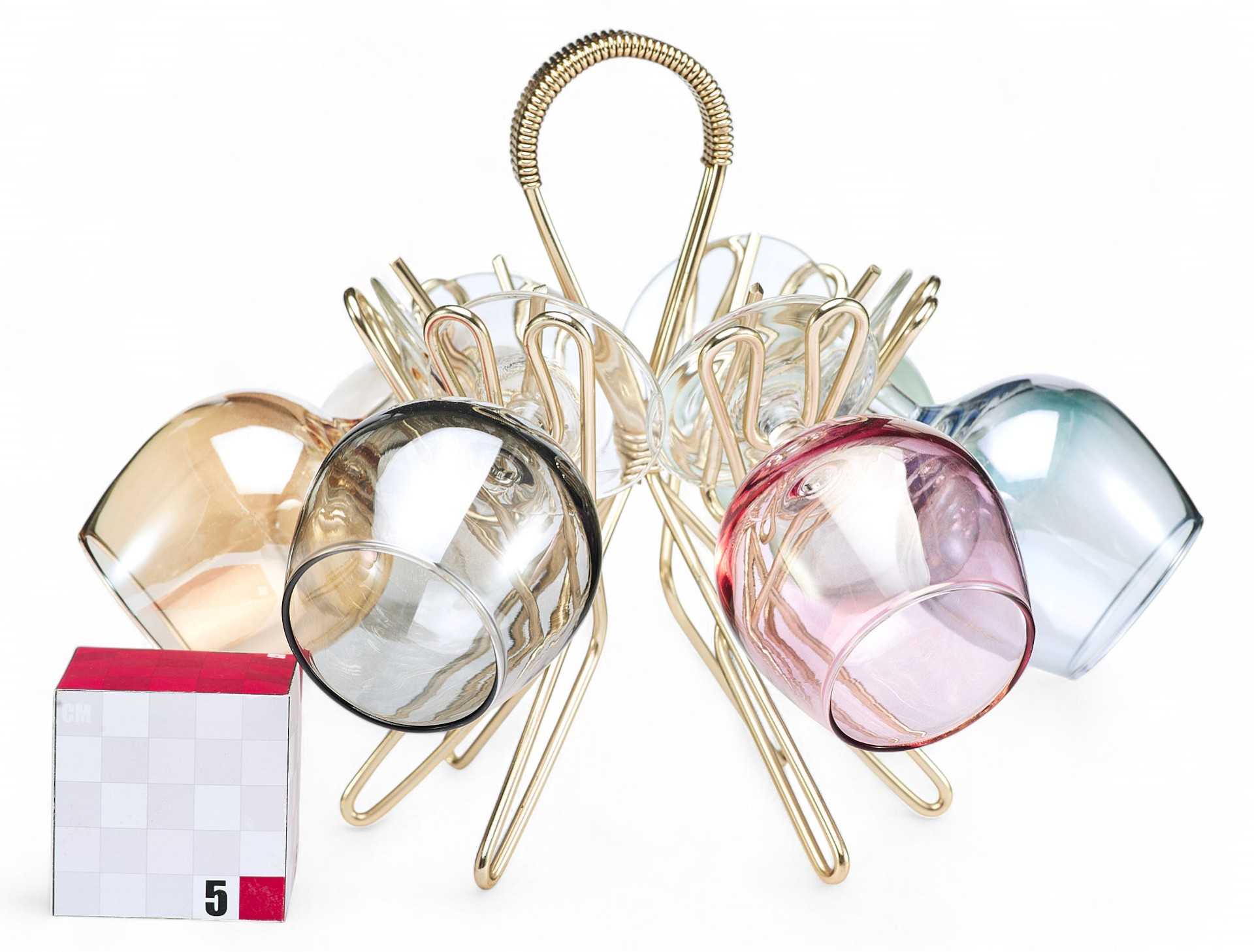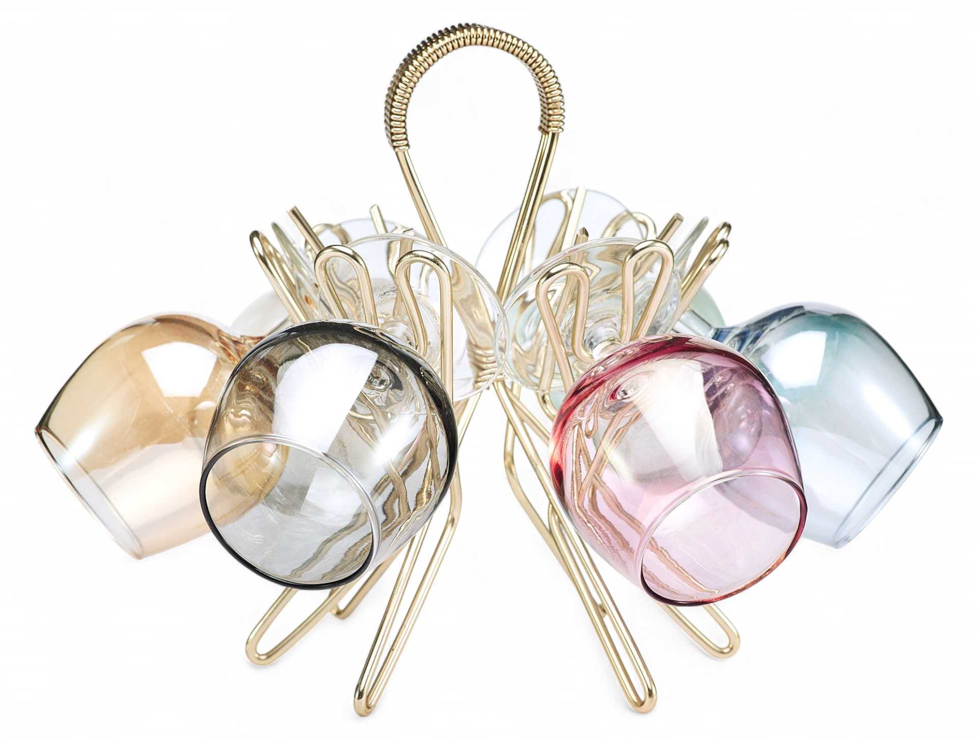 Набор коньячных рюмок, состоящий шести бокалов и подставки для них, изготовленной из проволоки средней толщины с металлической оплеткой.
