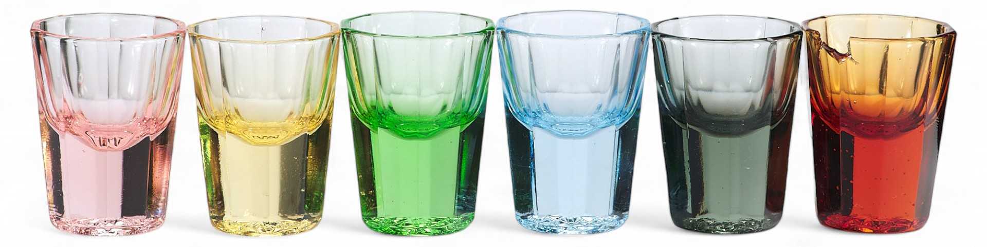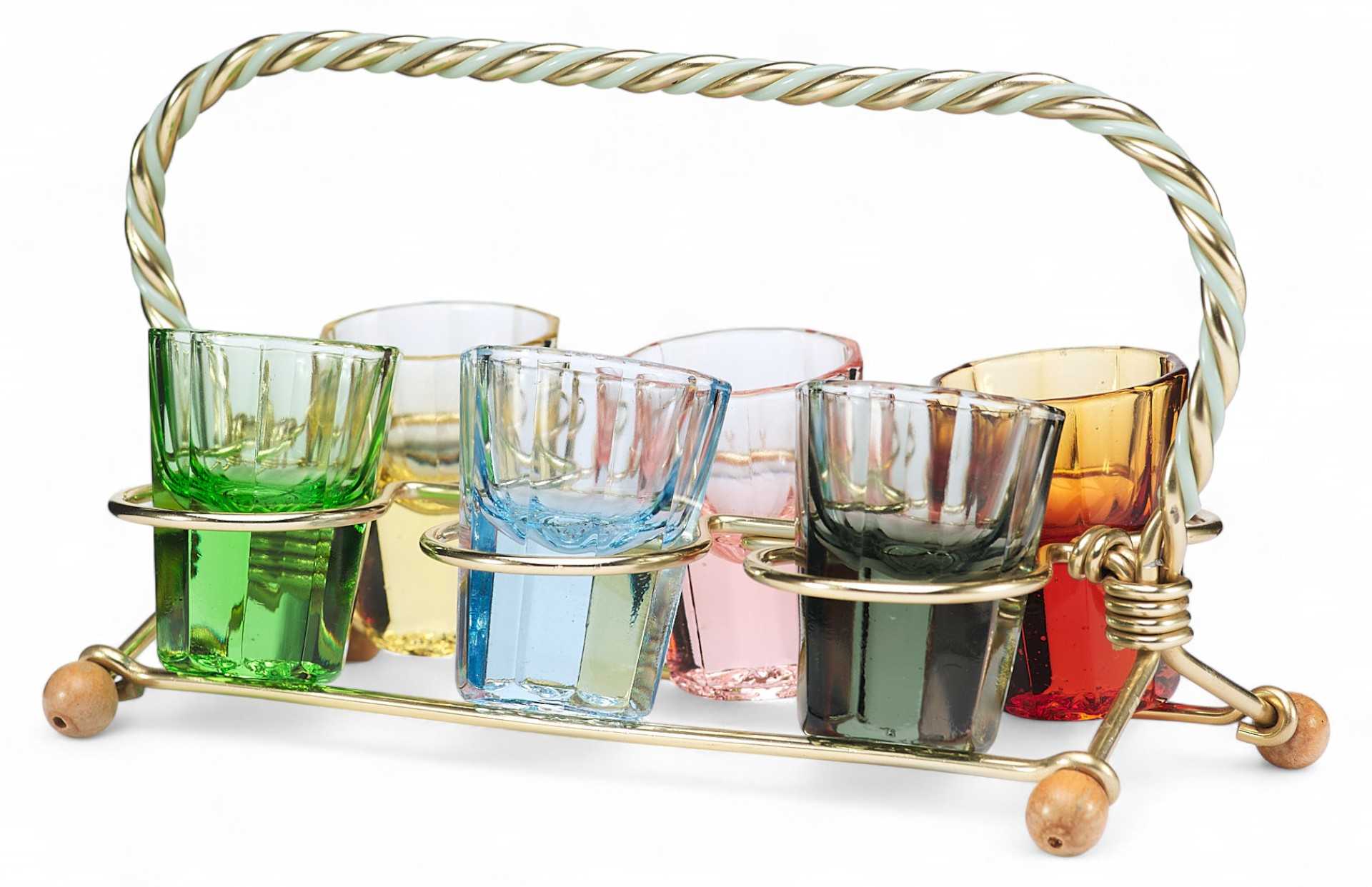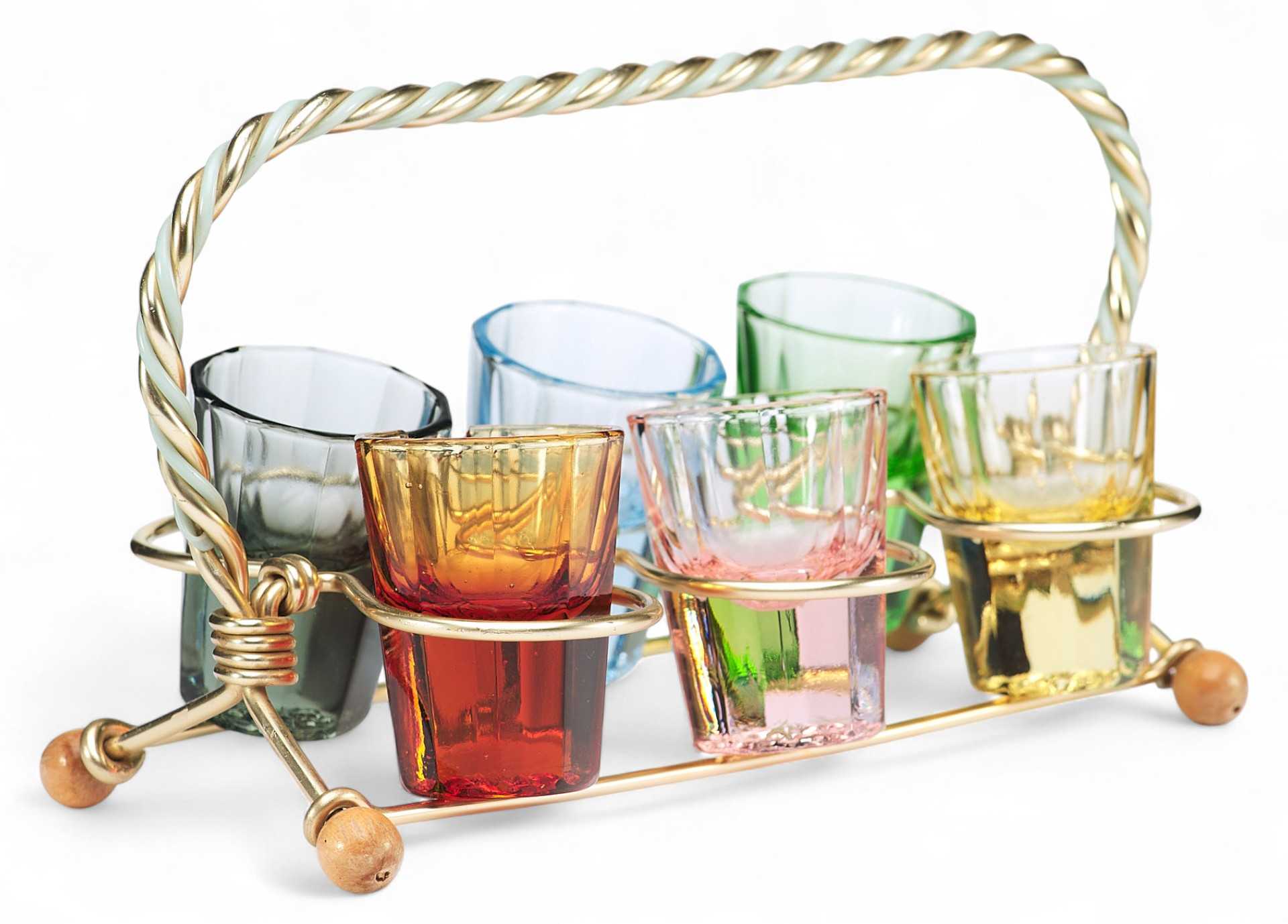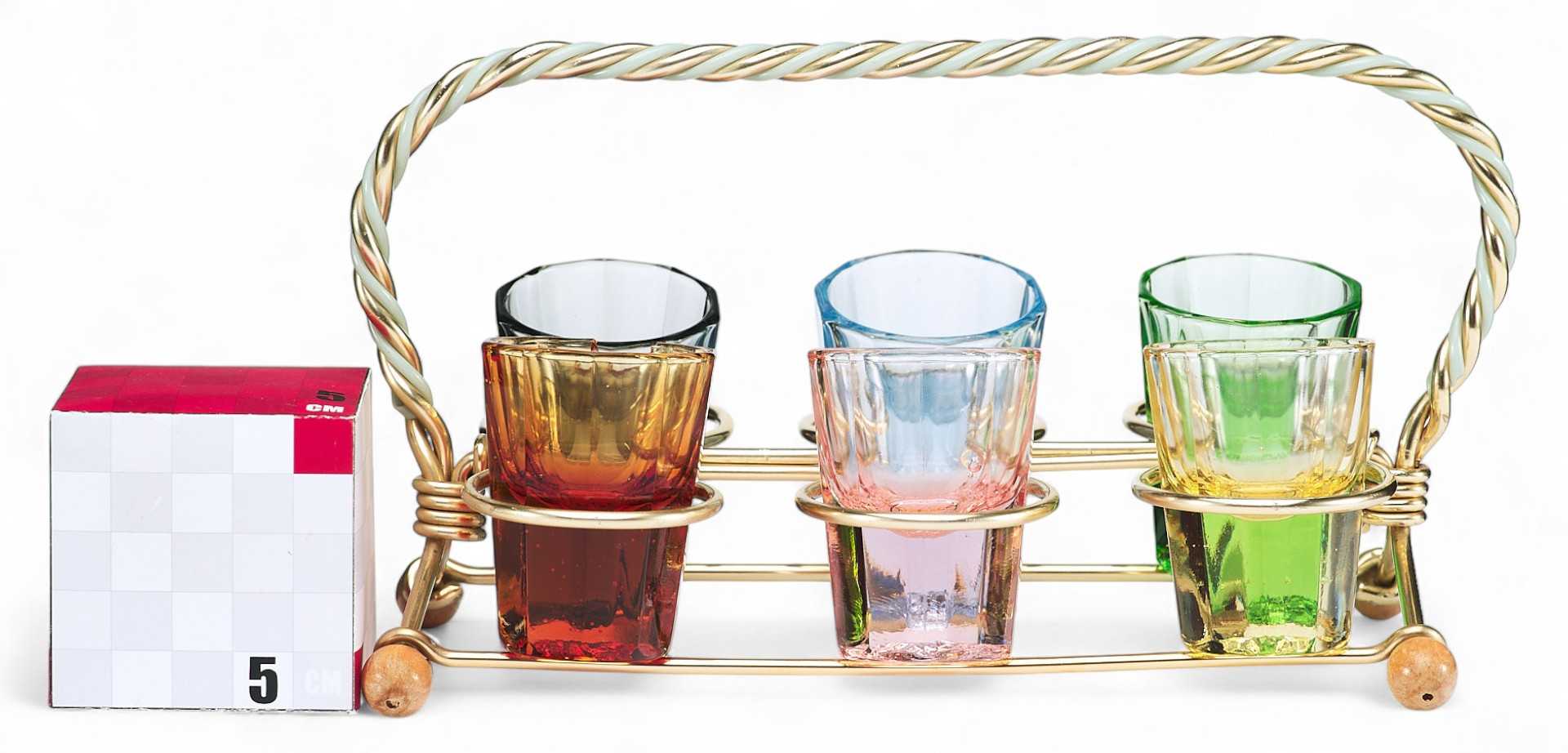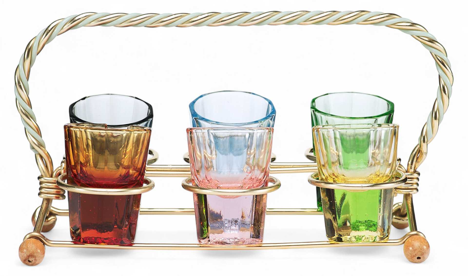 Набор стопок из цветного стекла в количестве 6-и штук удобно помещается на металлическом держателе с пластиковой ручкой. Каждая стопочка - индивидуального цвета. В целом набор отличается оригинальностью идеи и исполнения, яркостью форм и своеобразным веселым настроем.