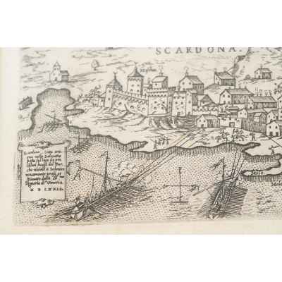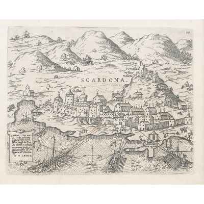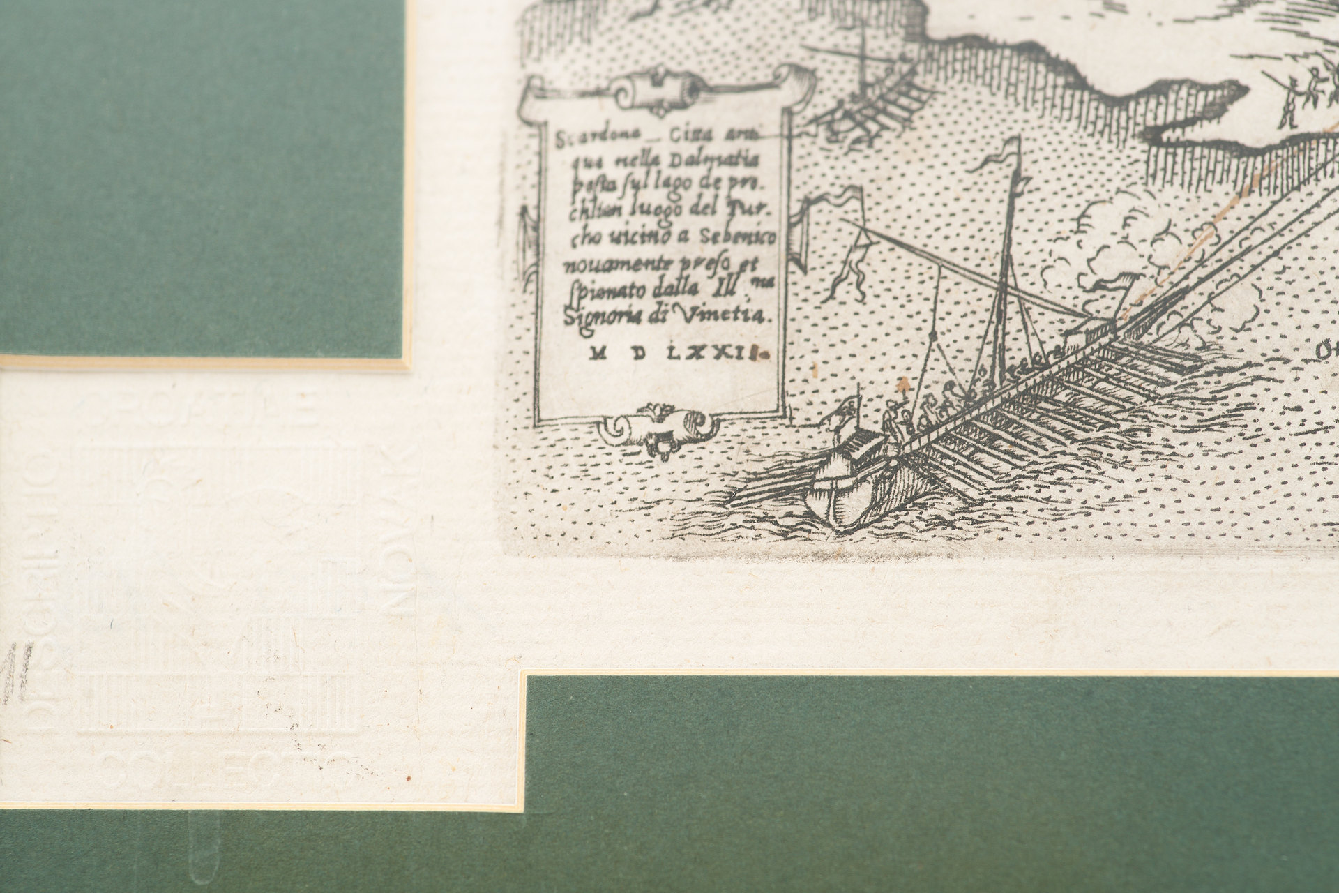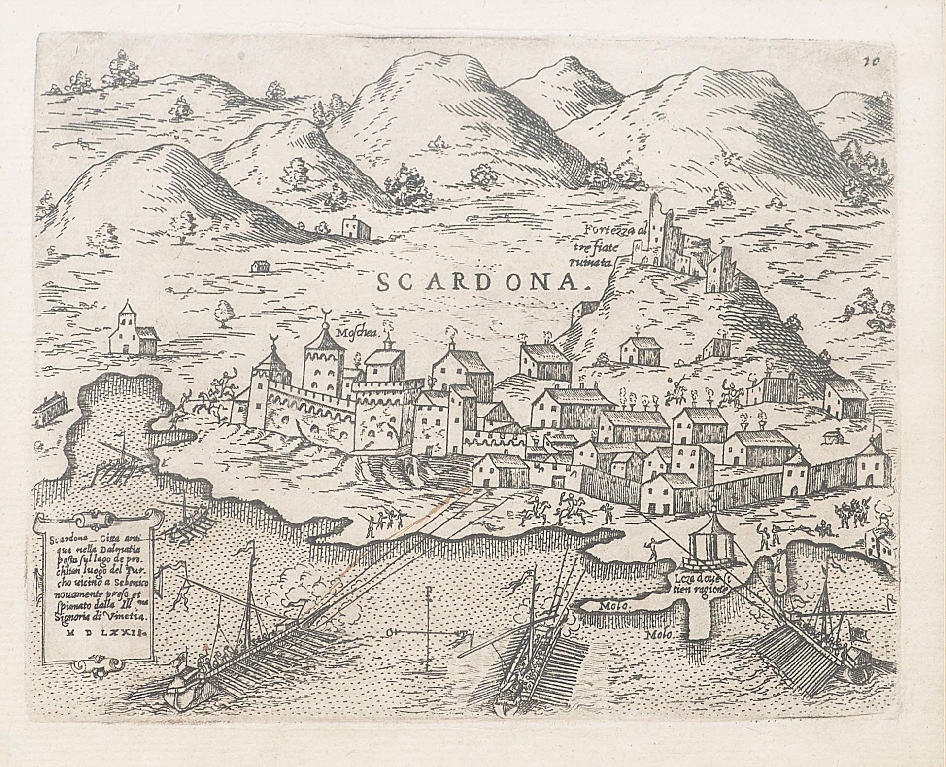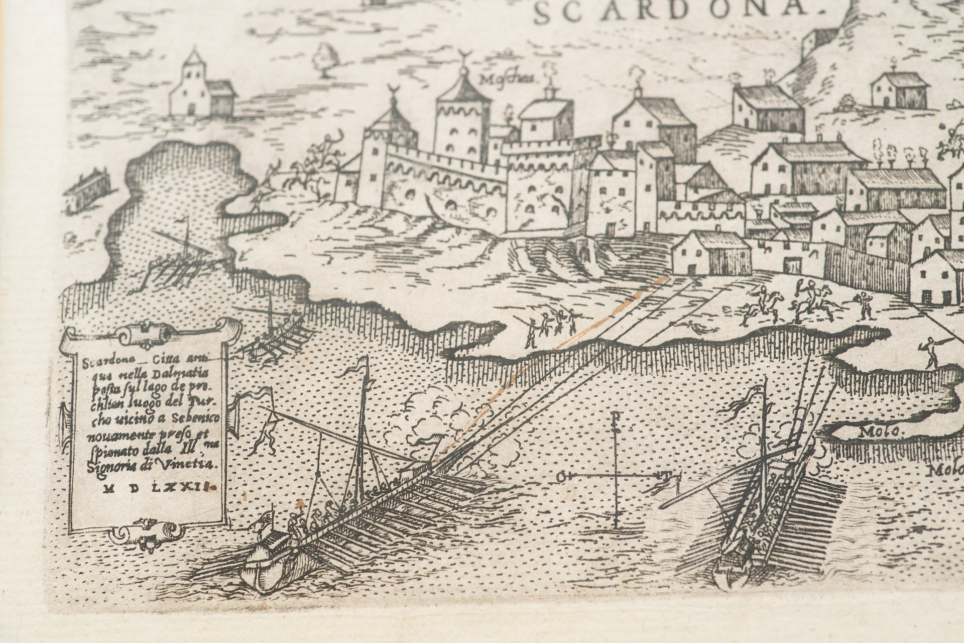 Представленная работа — это гравюра под названием «Вид Скрадина», созданная около 1572 года выдающимся венецианским картографом и издателем Джованни Франческо Камочио (G.F. Camocio). Изображение запечатлевает город Скрадин (Scardona), расположенный на территории современной Хорватии, в исторический момент, вероятно, связанный с военными действиями между Османской империей и Венецианской республикой.