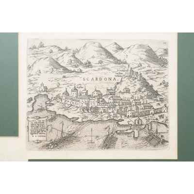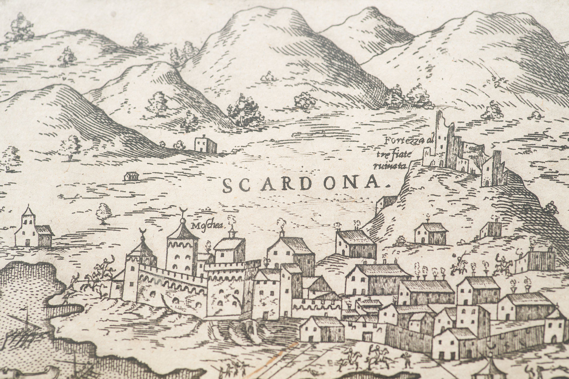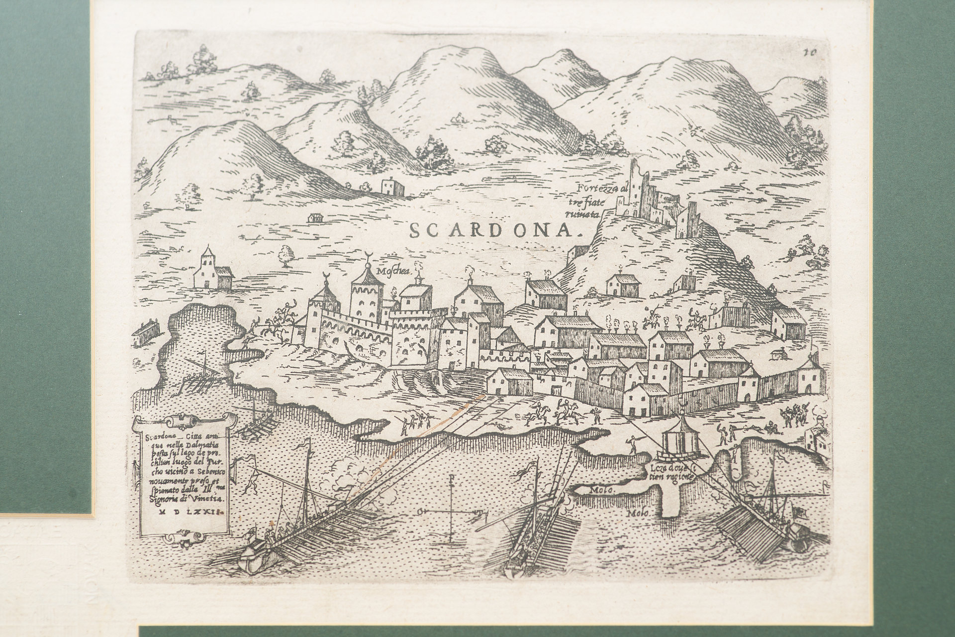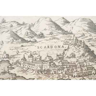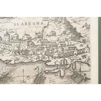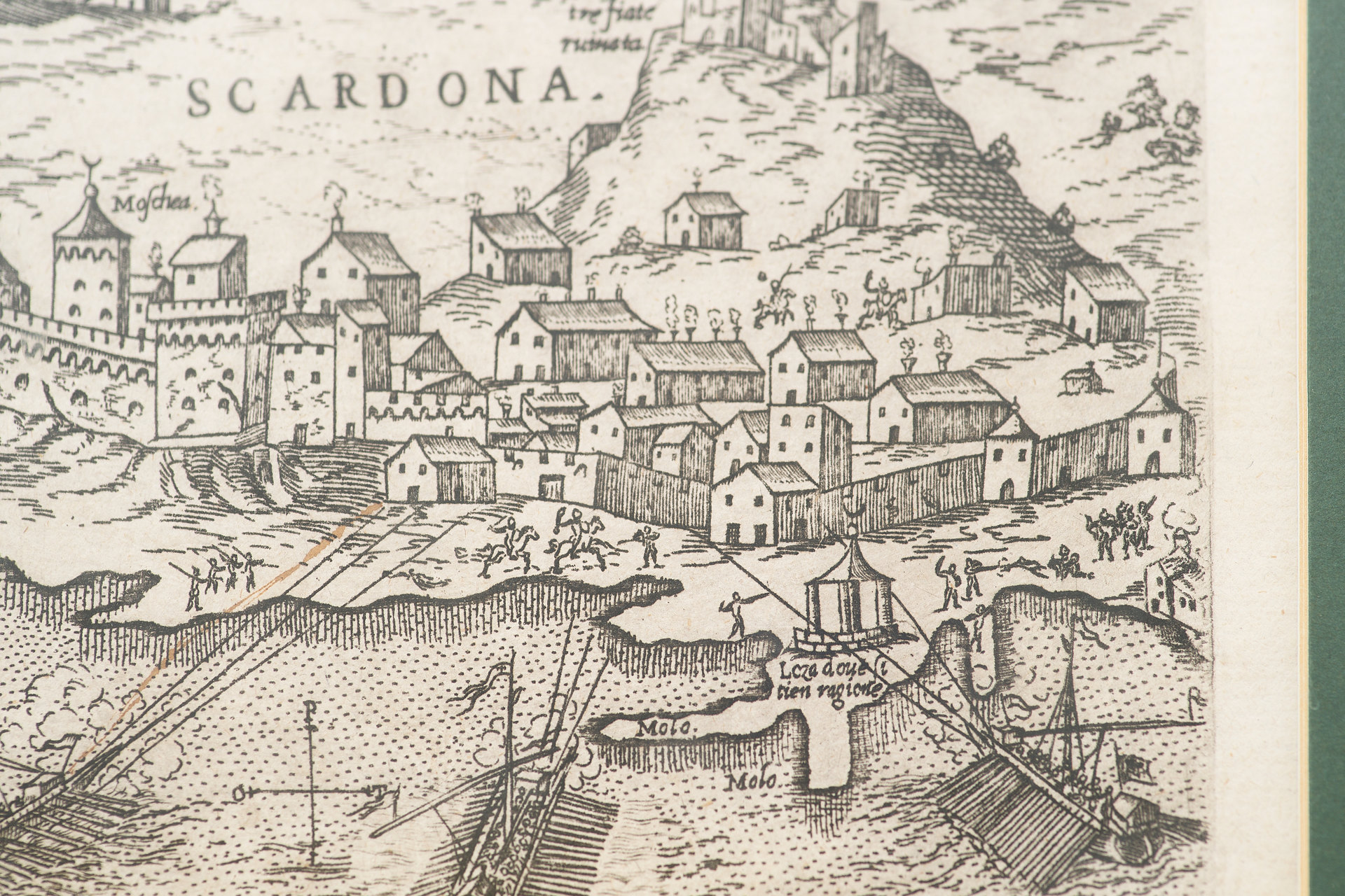 Представленная работа — это гравюра под названием «Вид Скрадина», созданная около 1572 года выдающимся венецианским картографом и издателем Джованни Франческо Камочио (G.F. Camocio). Изображение запечатлевает город Скрадин (Scardona), расположенный на территории современной Хорватии, в исторический момент, вероятно, связанный с военными действиями между Османской империей и Венецианской республикой.