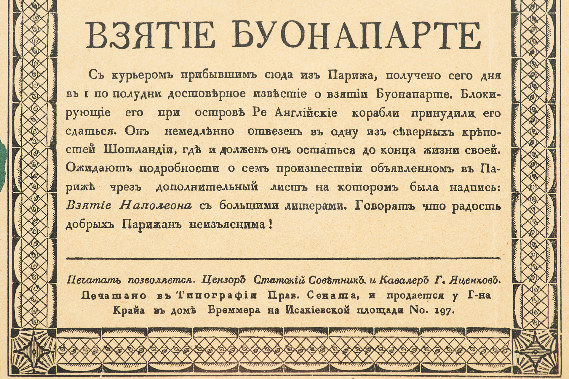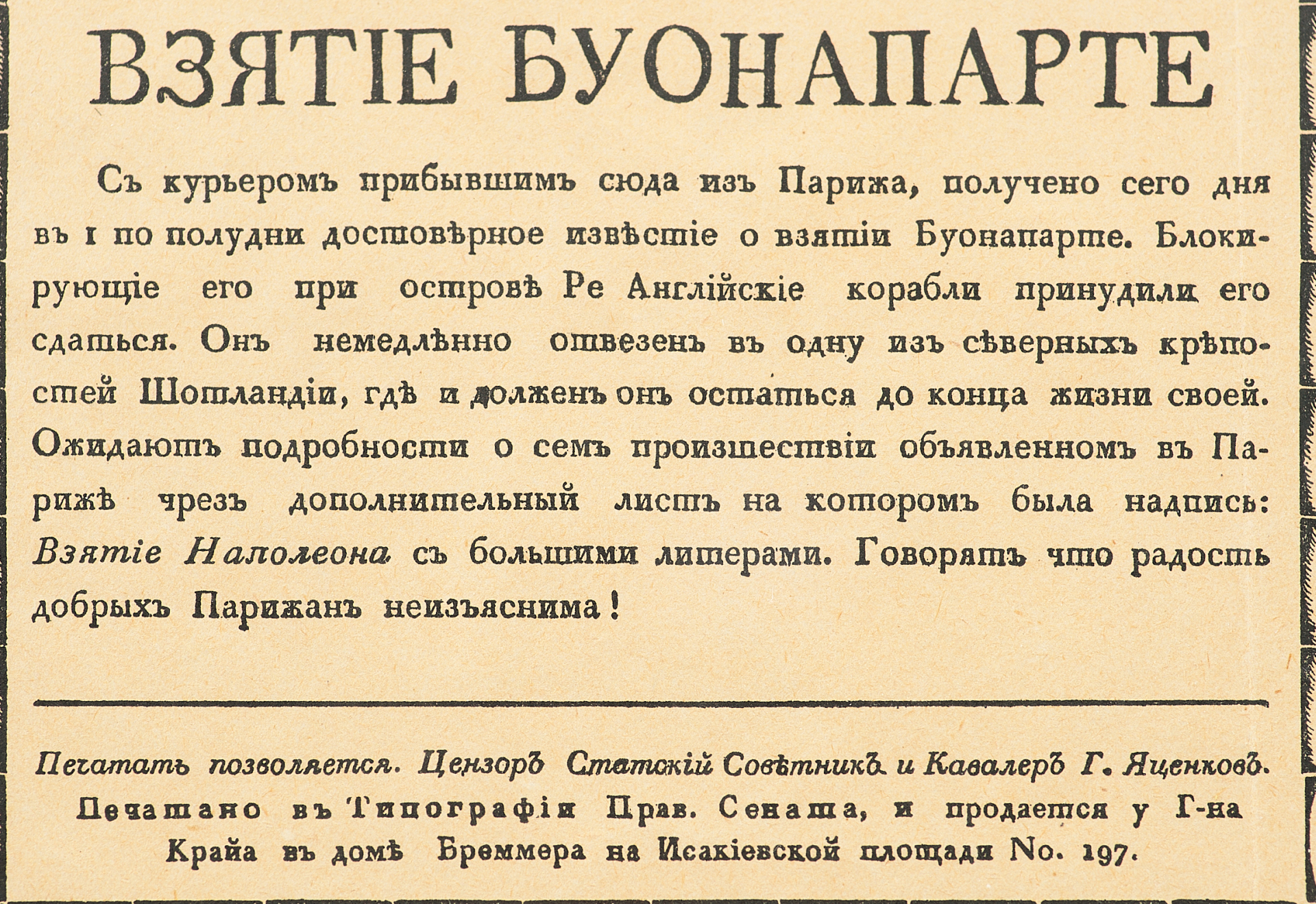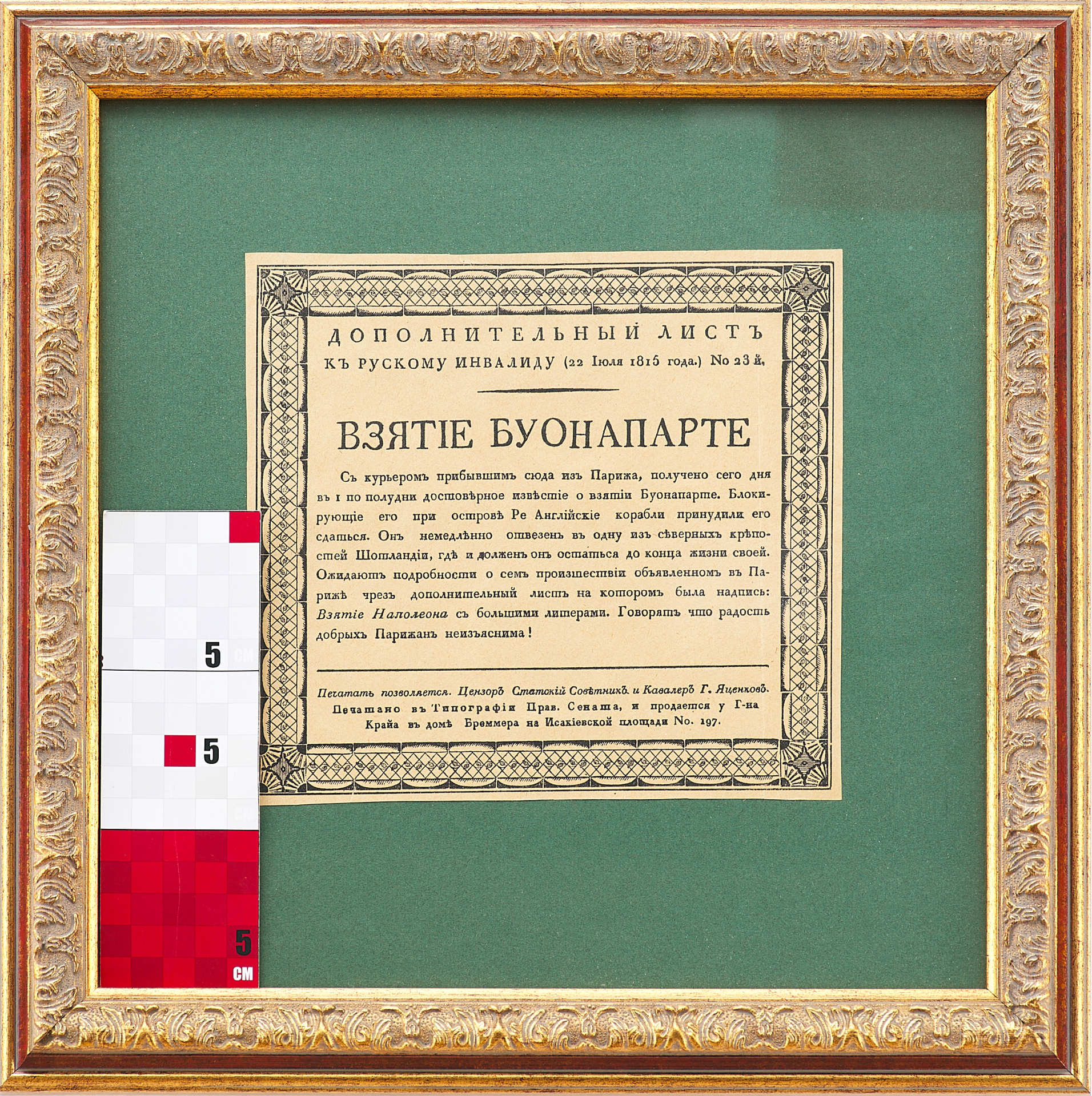 Представлен дополнительный лист к газете Русский инвалид" за 22 июля 1815 года с известием о взятии Наполеона Бонапарта.