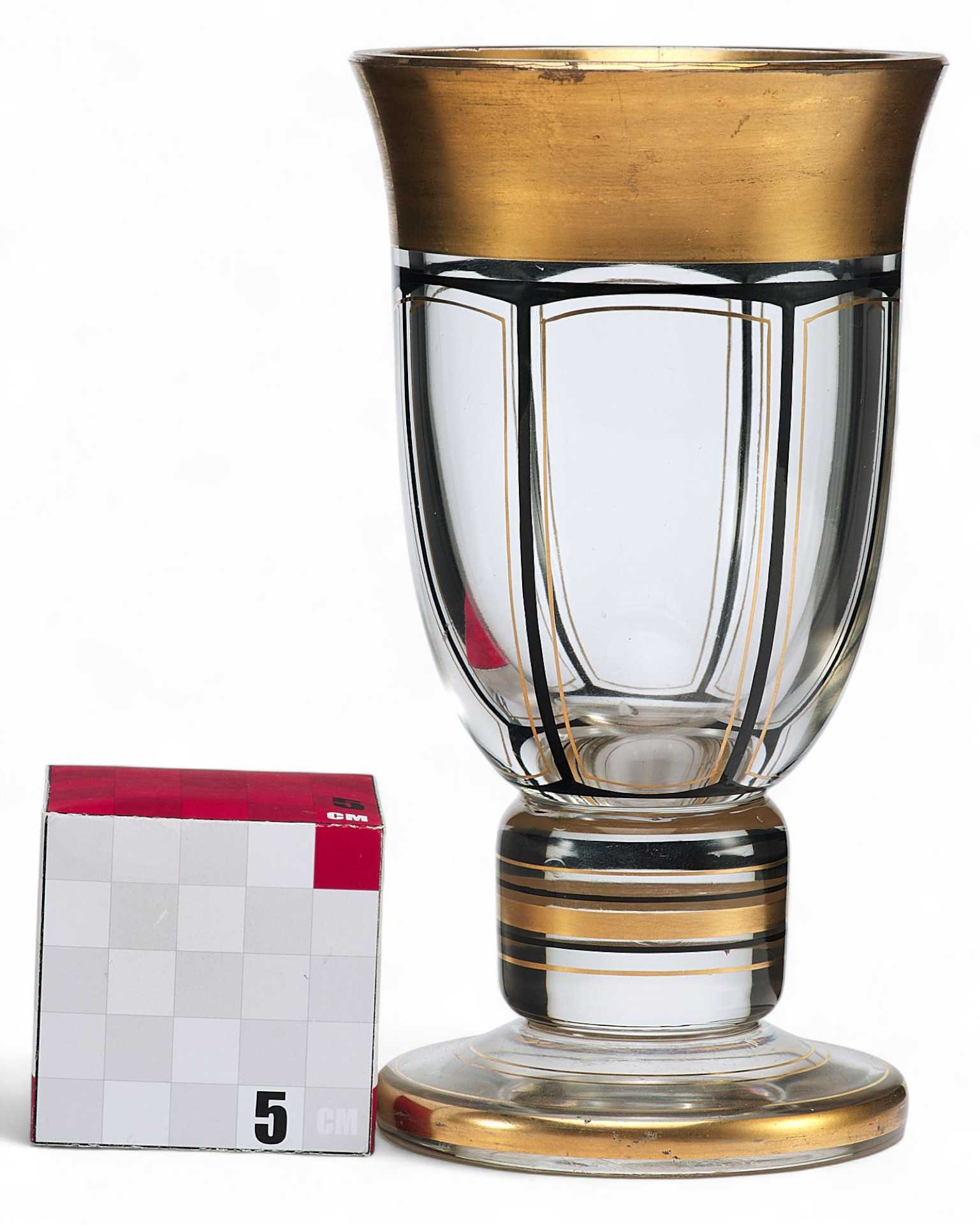 Тулово конусовидное, с раструбом, короткая на круглом основании. Верхняя часть позолоченная. Тулово украшено росписью в виде трапеций. Художественные формы предмета соответствуют стилю Ар Деко. По своим художественным признакам бокал относится к продукции богемских мастерских.