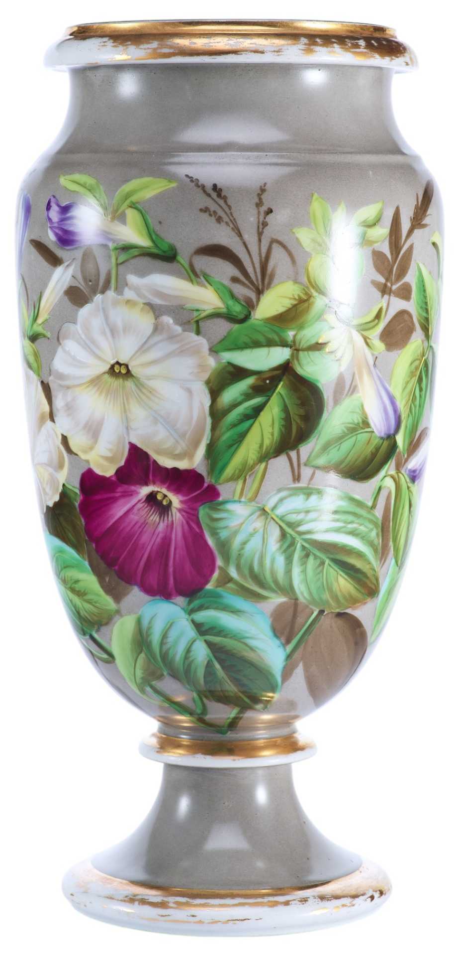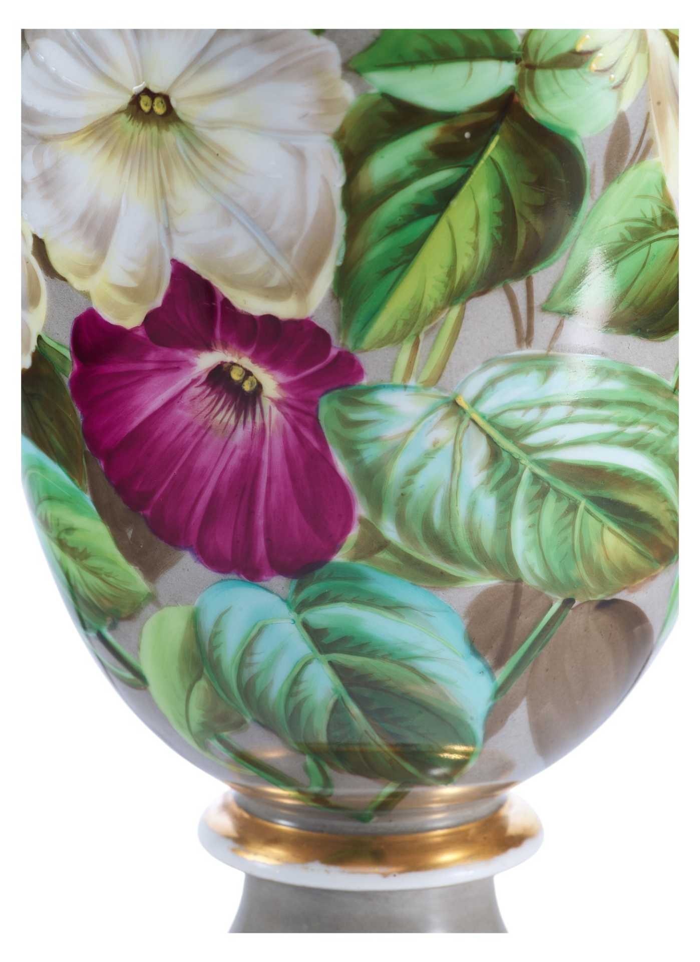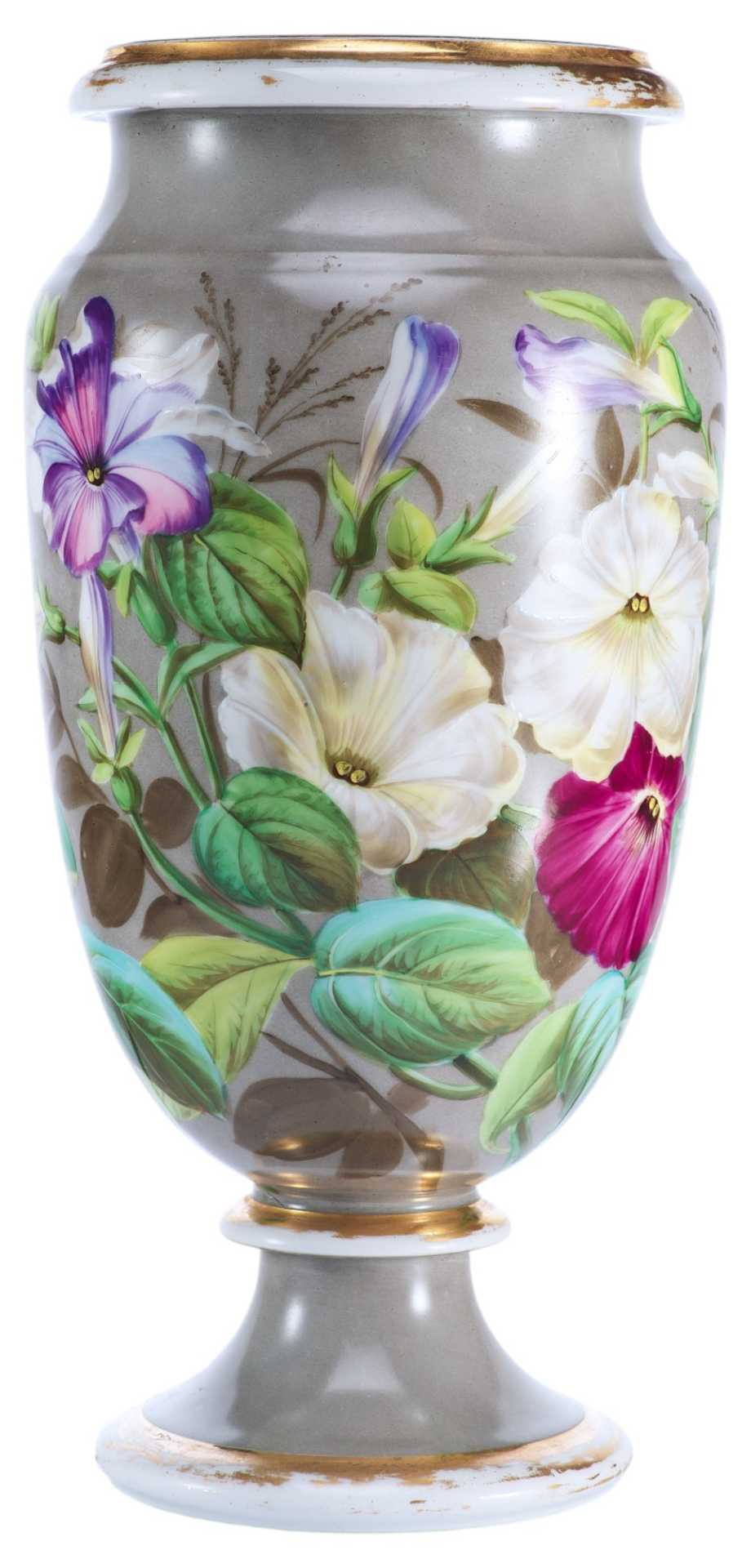 Ваза классической формы выполнена из фарфора. Основной сосуд поставлен на устойчивую невысокую одноордерную ножку, переходящую в круглое основание. При сохранении строгой классической формы поверхность тулова вазы обильно декорирована ярким живописным изображением цветов, что было характерно для определенного периода развития фарфорового производства России, особенно на частных предприятиях.