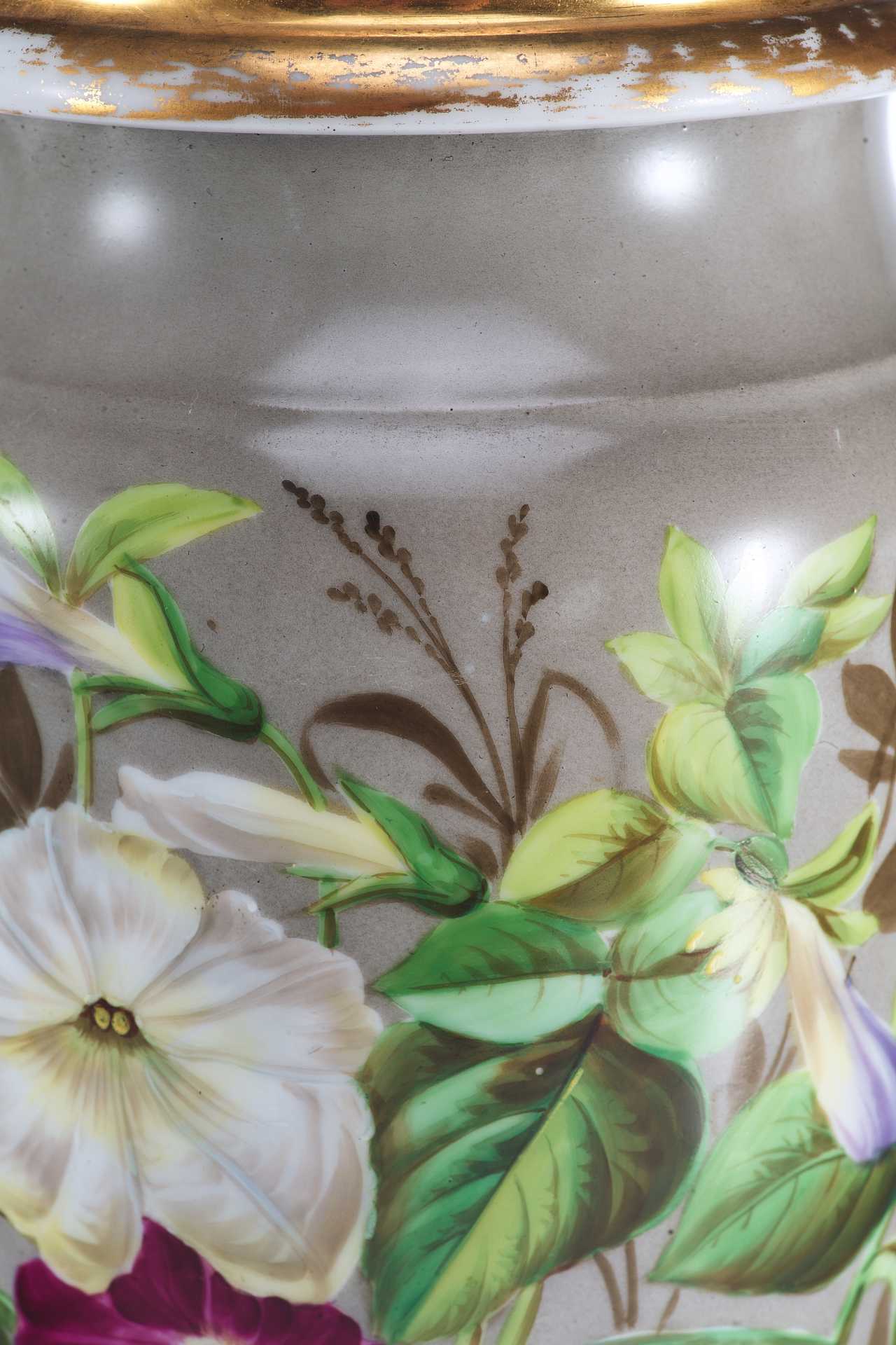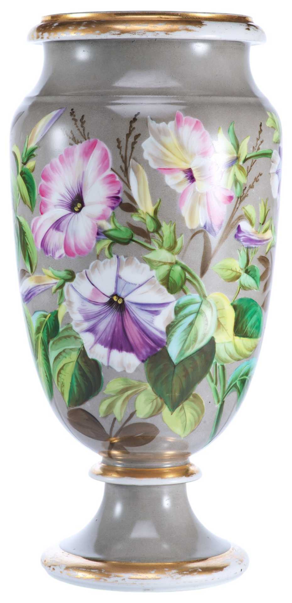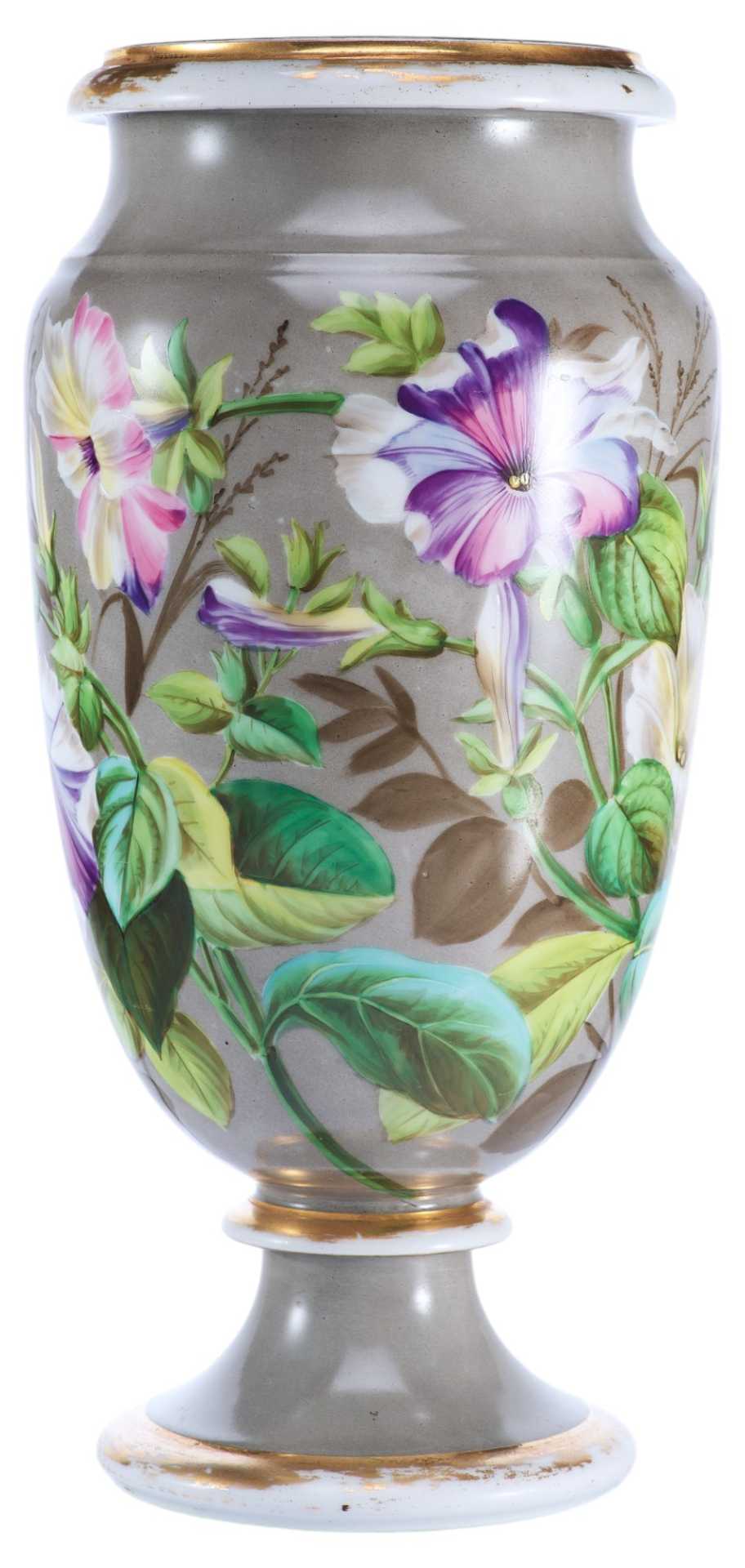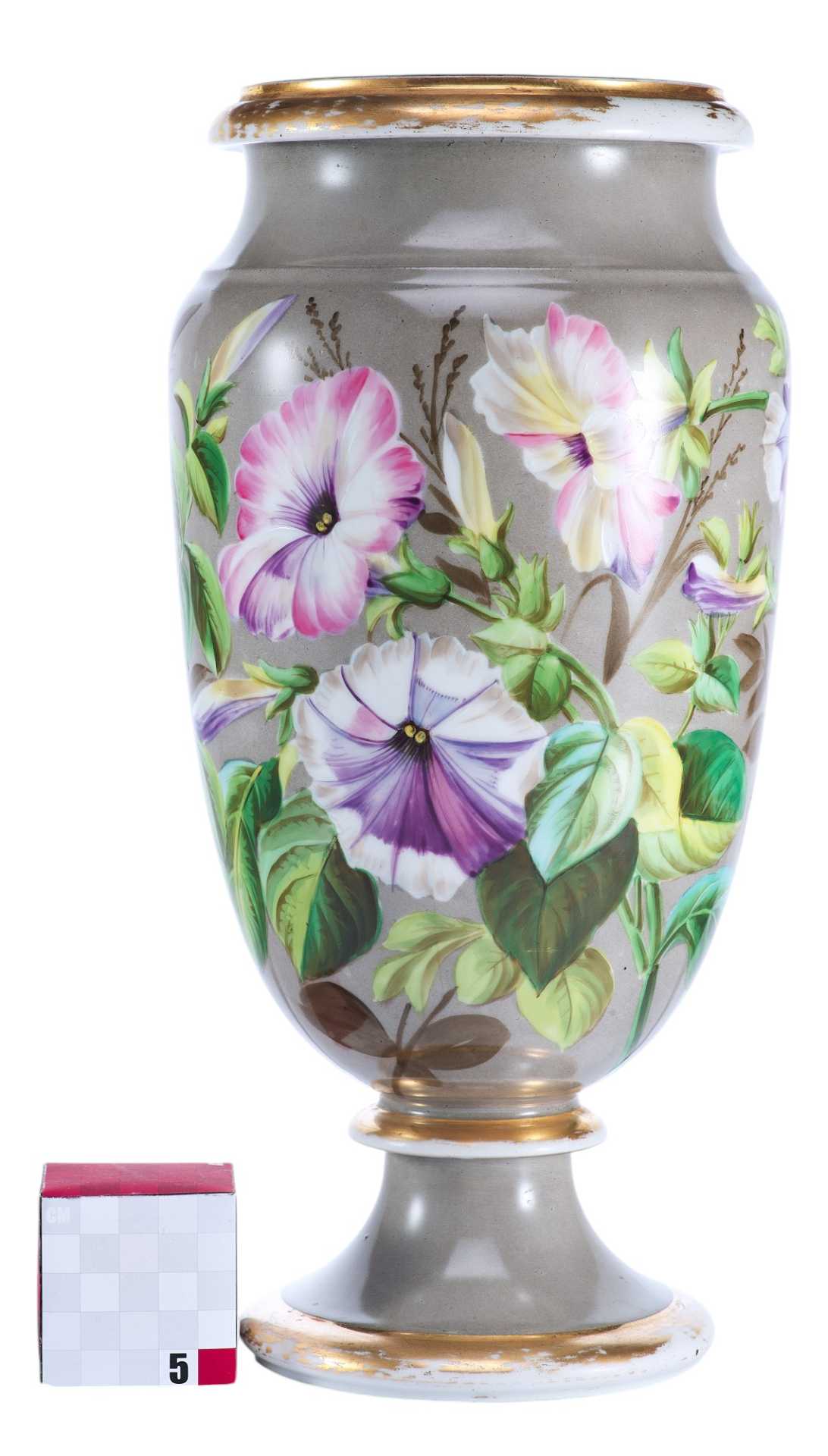 Ваза классической формы выполнена из фарфора. Основной сосуд поставлен на устойчивую невысокую одноордерную ножку, переходящую в круглое основание. При сохранении строгой классической формы поверхность тулова вазы обильно декорирована ярким живописным изображением цветов, что было характерно для определенного периода развития фарфорового производства России, особенно на частных предприятиях.