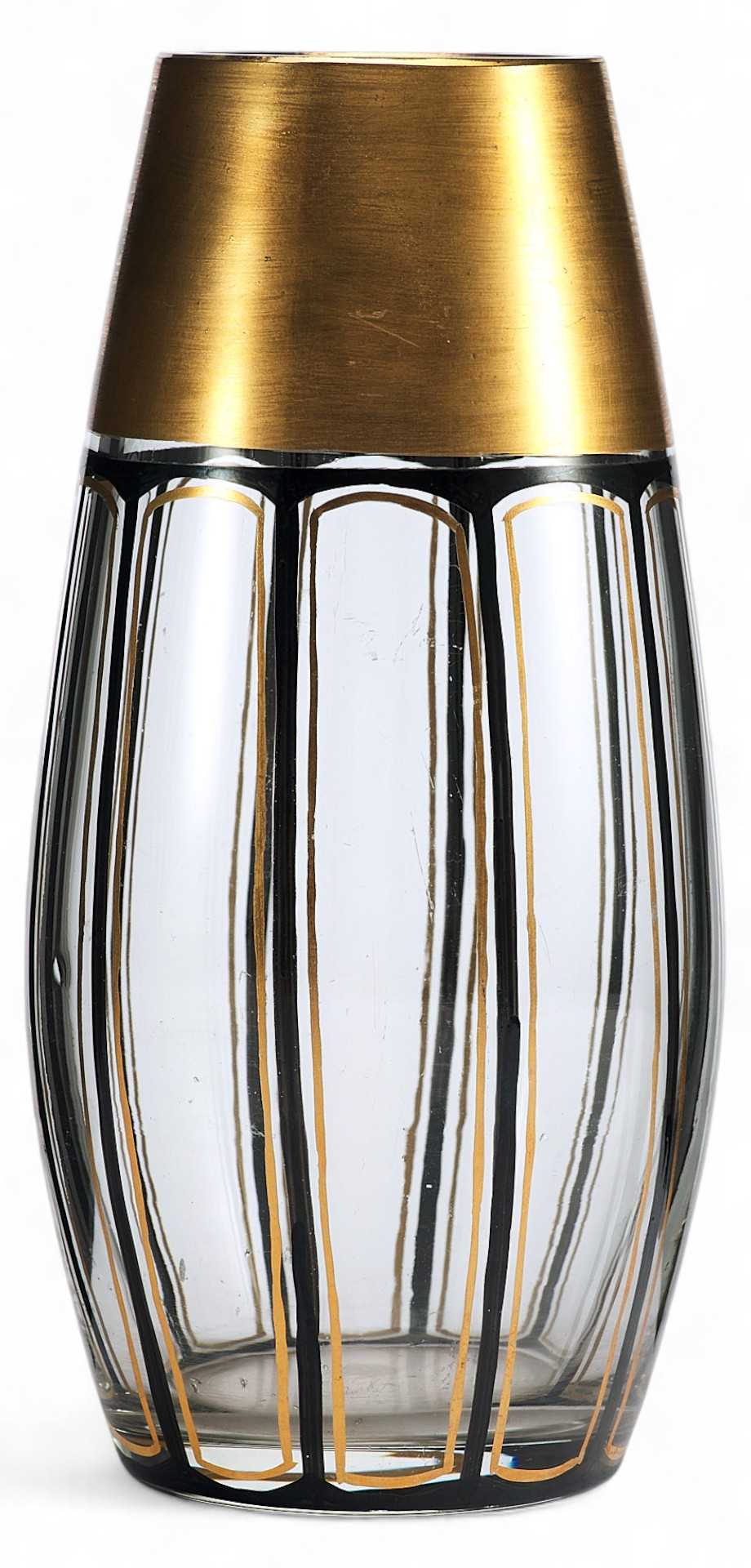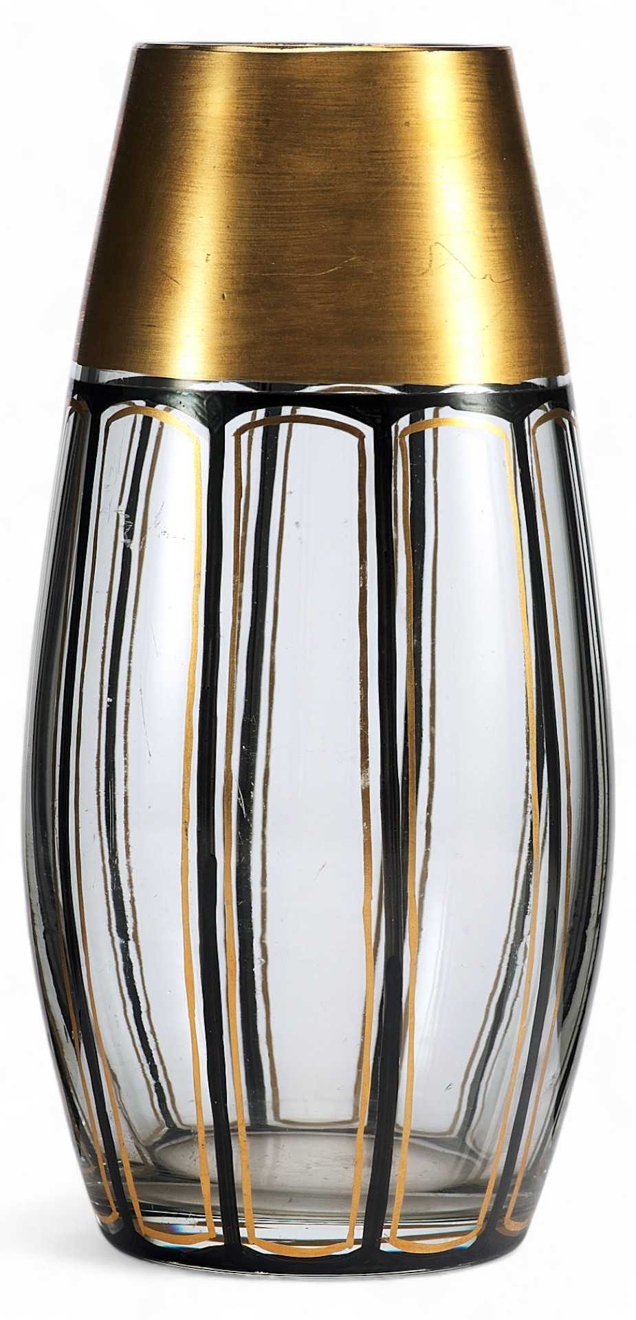 Тулово цилиндрической формы, слегка зауженной книзу. Верхняя часть позолоченная. Тулово украшено росписью в виде трапеций. Художественные формы предмета соответствуют стилю Ар Деко.