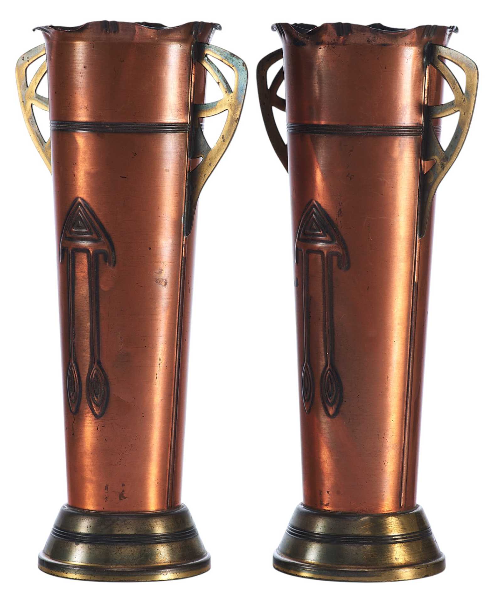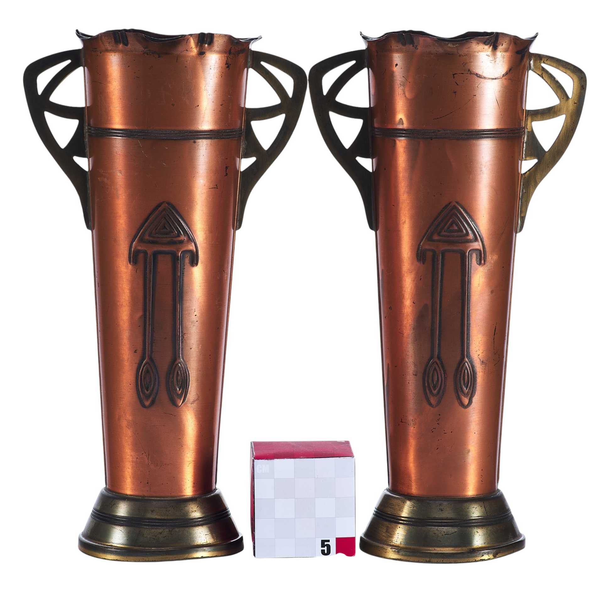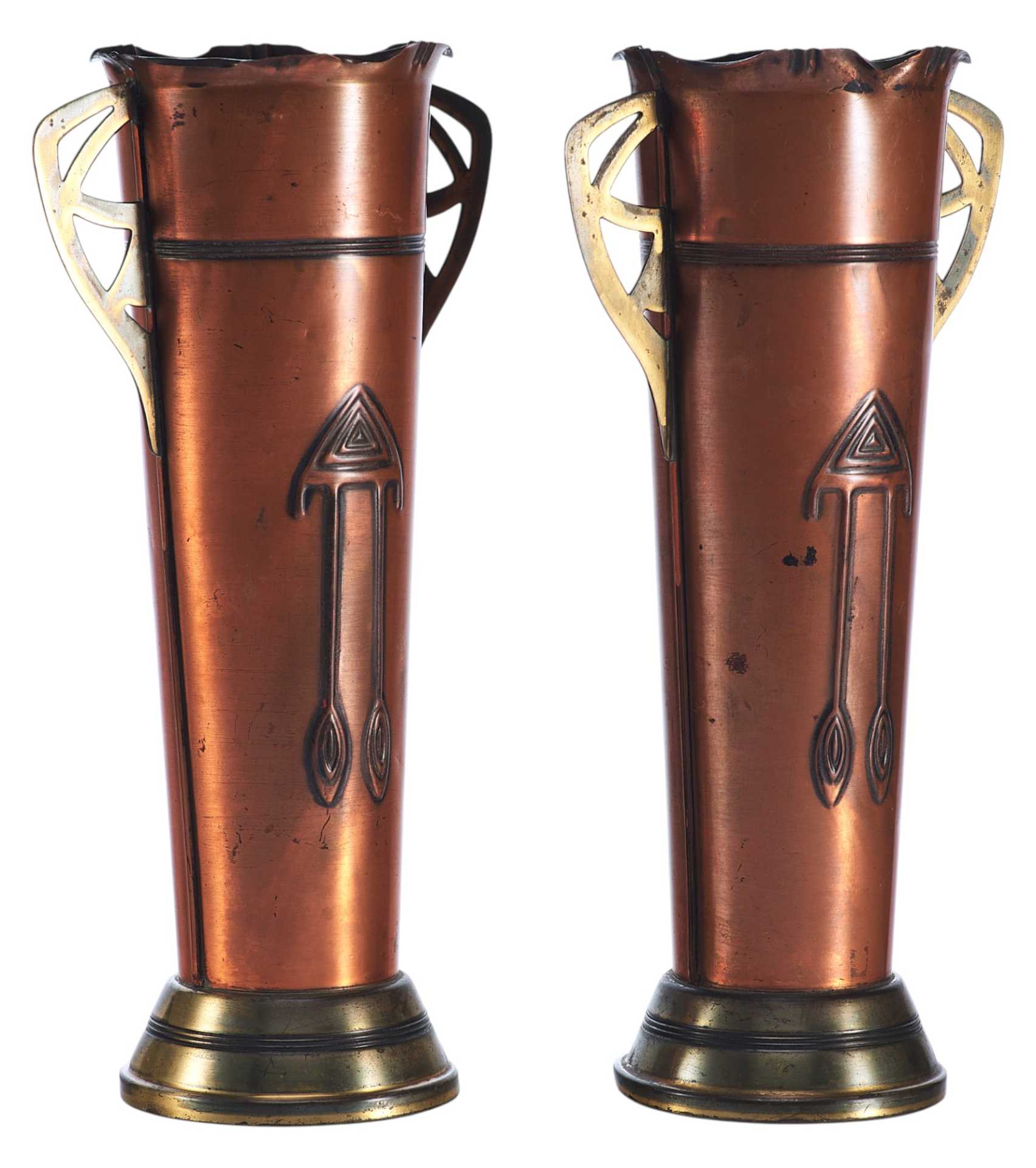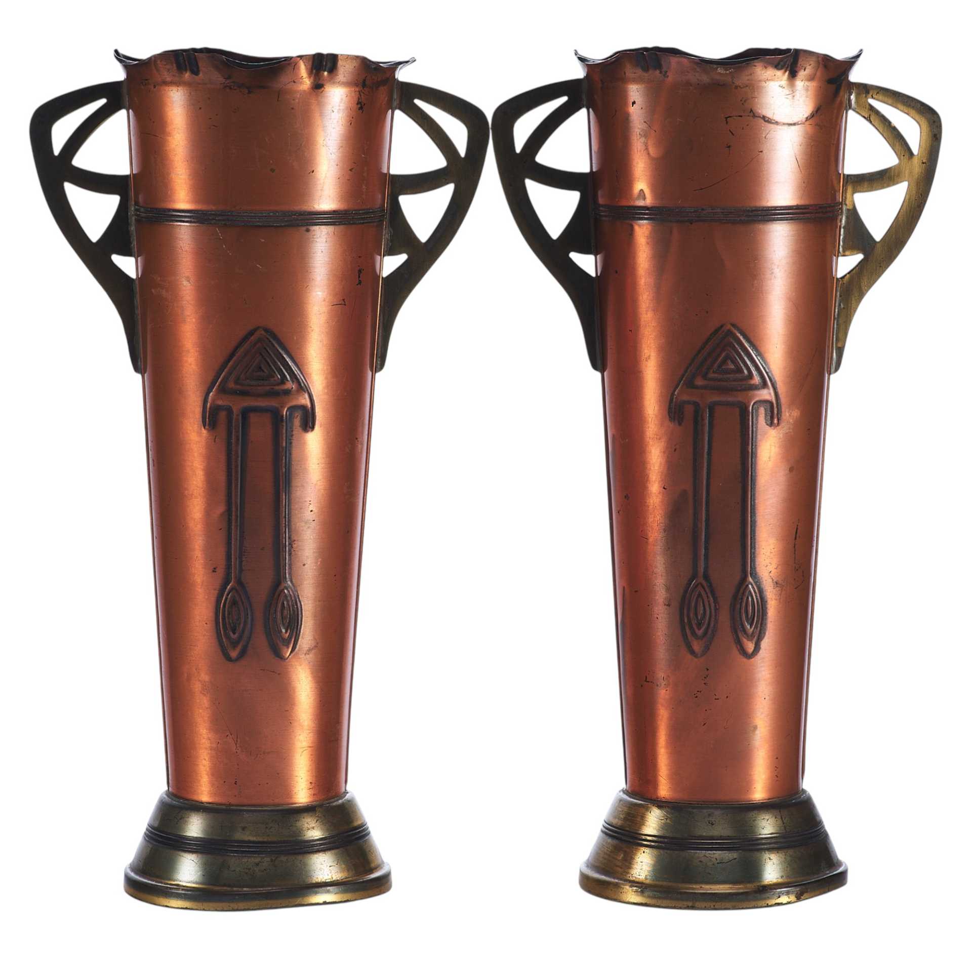 Оригинальные вазы в стиле модерн. К вазам приделаны одинаковые плавные ручки, а на тулово нанесен рисунок в стиле модерн. В конце XIX века, в связи с нарастающим влиянием широкораспространенного французского варианта стиля модерн в европейском декоративном искусстве, называемого ар-нуво, стали активно использоваться художественно-выразительные приемы для оформления предметов обихода этого стилевого направлении.