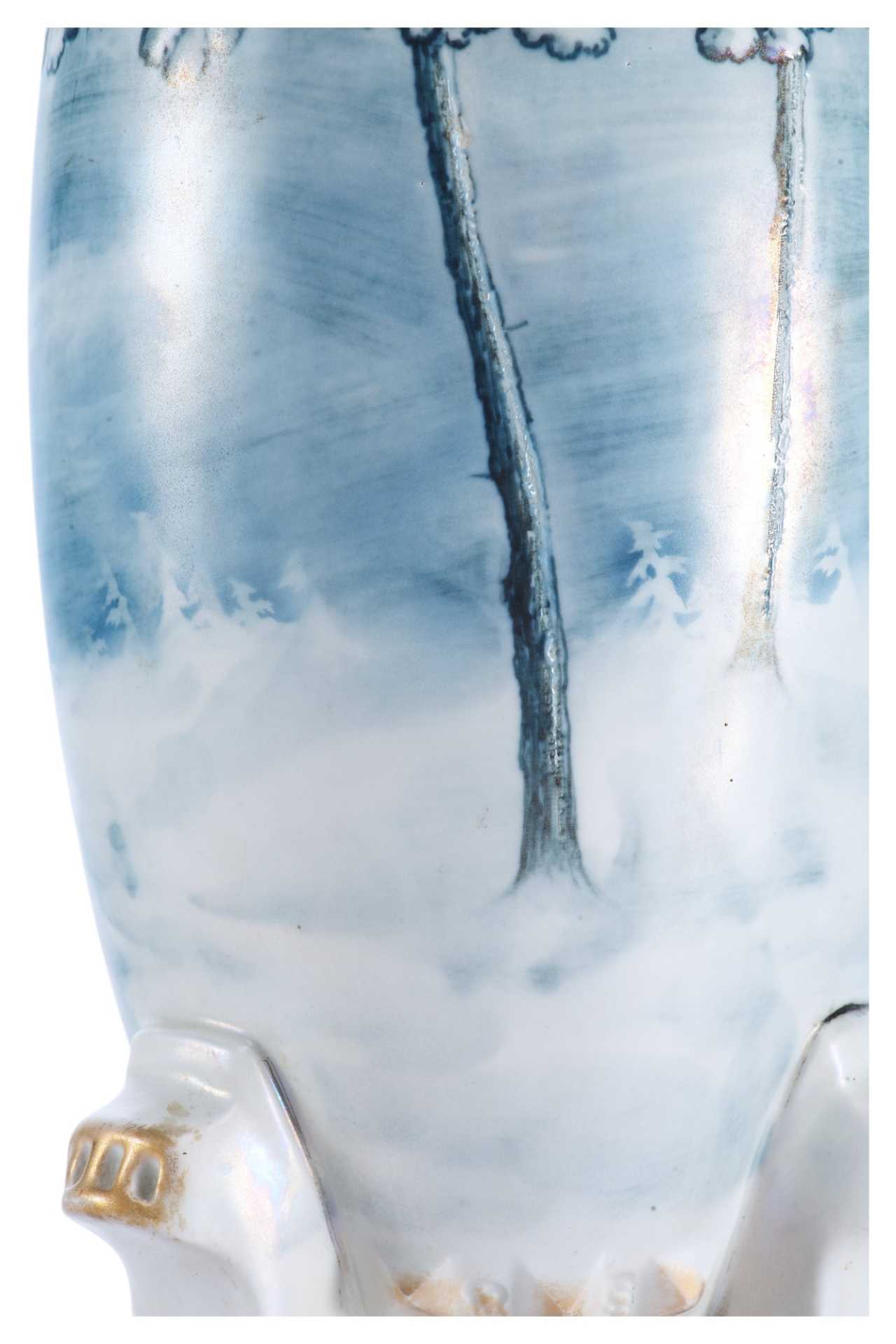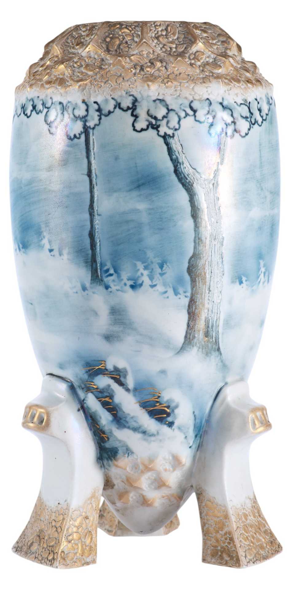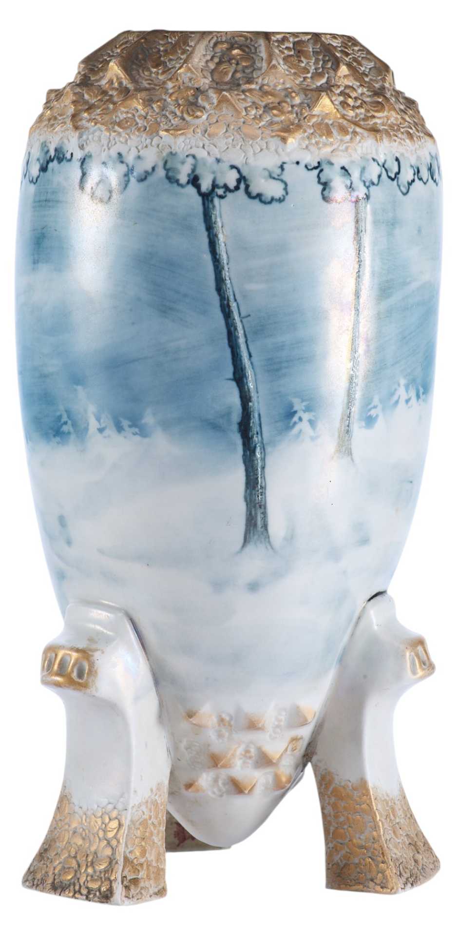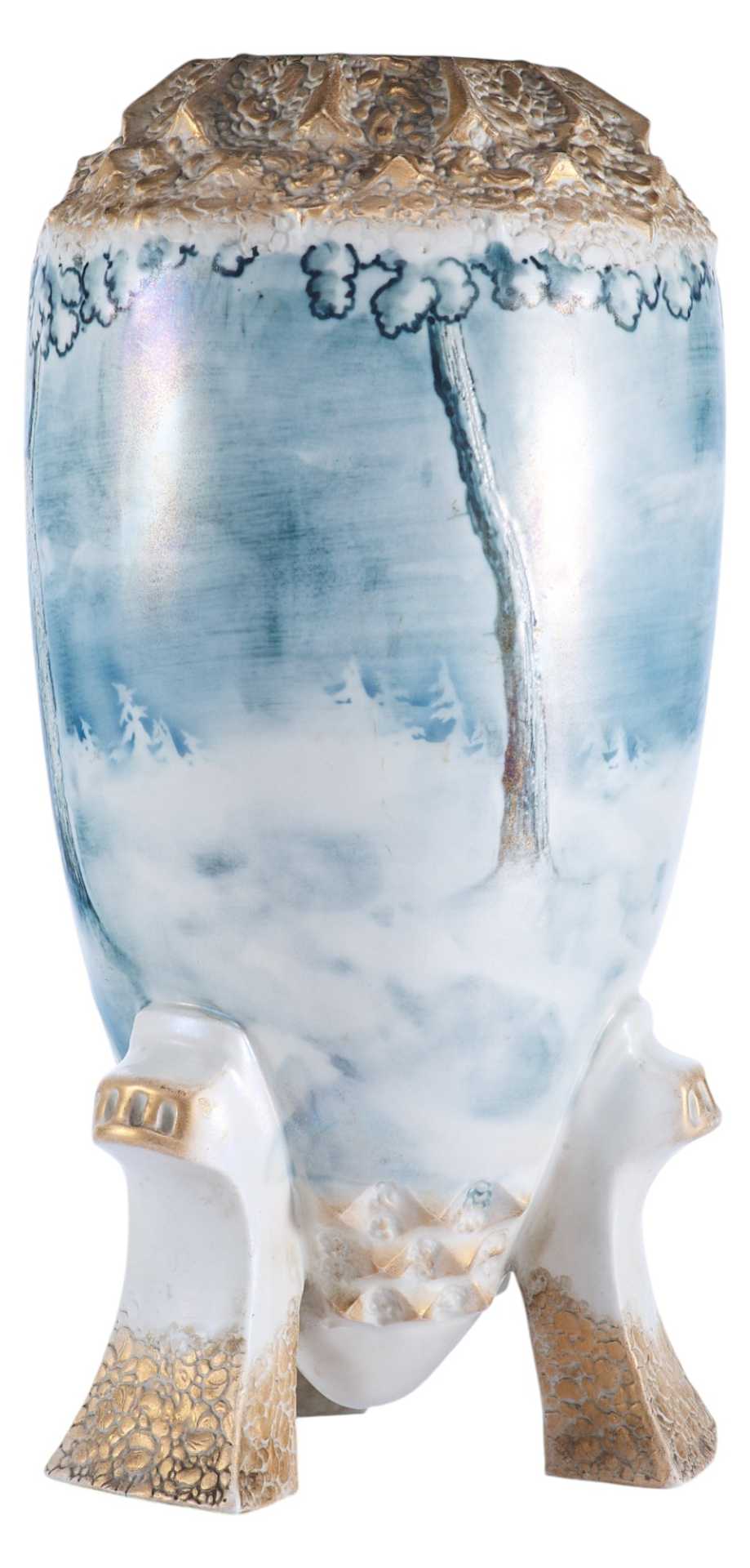 надписями «TURN», «VIENNA E/W», «made in Austria», также присутствует номер: «9309». Основная часть вазы водворена на три фигурные ножки. Поверхность полностью покрыта пейзажем, выдержанным в голубо-серебристых тонах, изображающем мотив северной природы. Пейзаж не объёмен и выполнен стилизованно, но при этом отличается высочайшим уровнем исполнения, что характерно для строгого венского сецессиона. Модерн (в Австрии - сецессион) — стиль в европейском и американском искусстве конца 19 в. - 1910-х гг. Скульптура модерна отличается динамикой и текучестью форм, виртуозной игрой крупных или же хрупких линий и силуэтов. Модерн