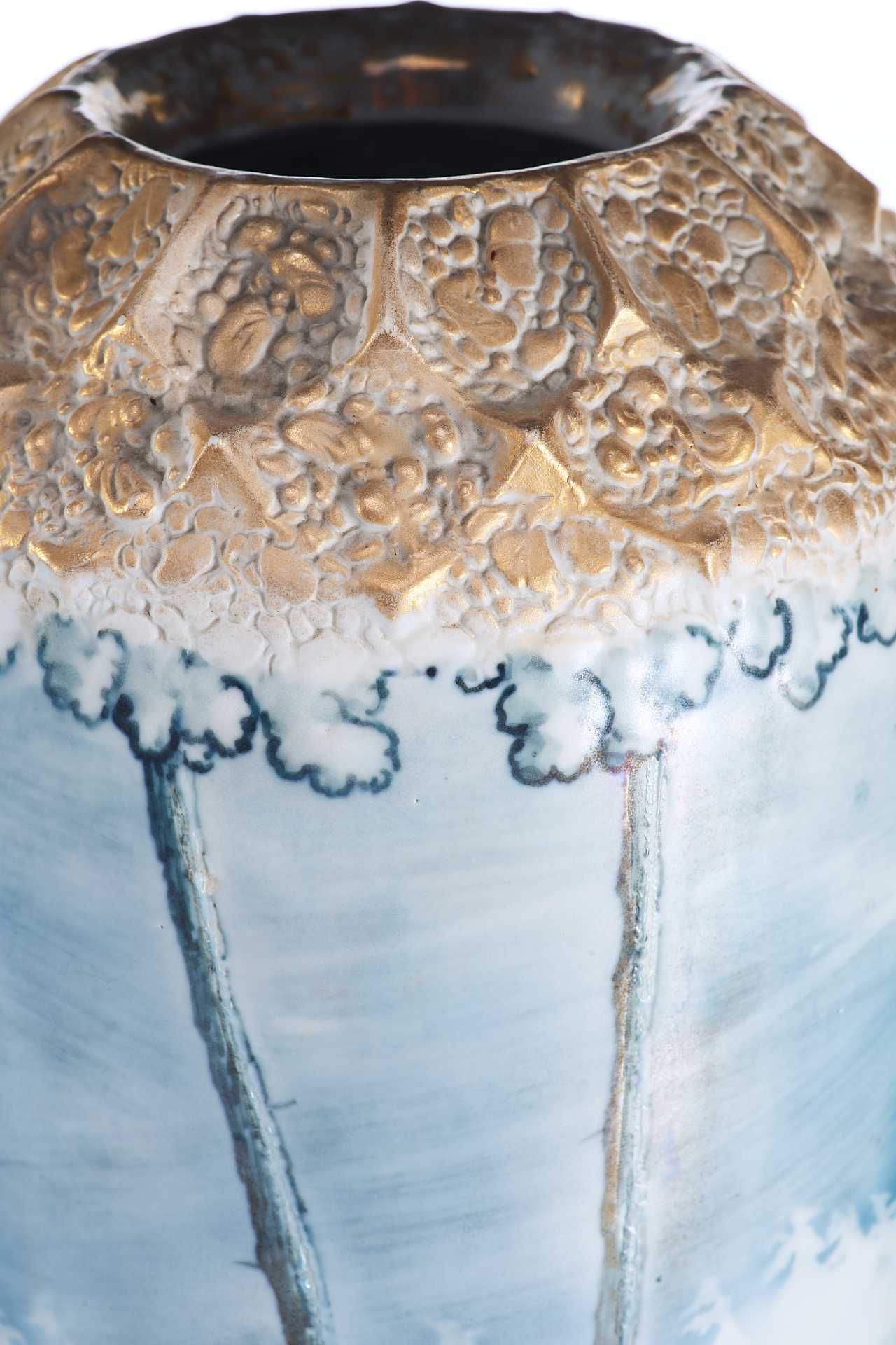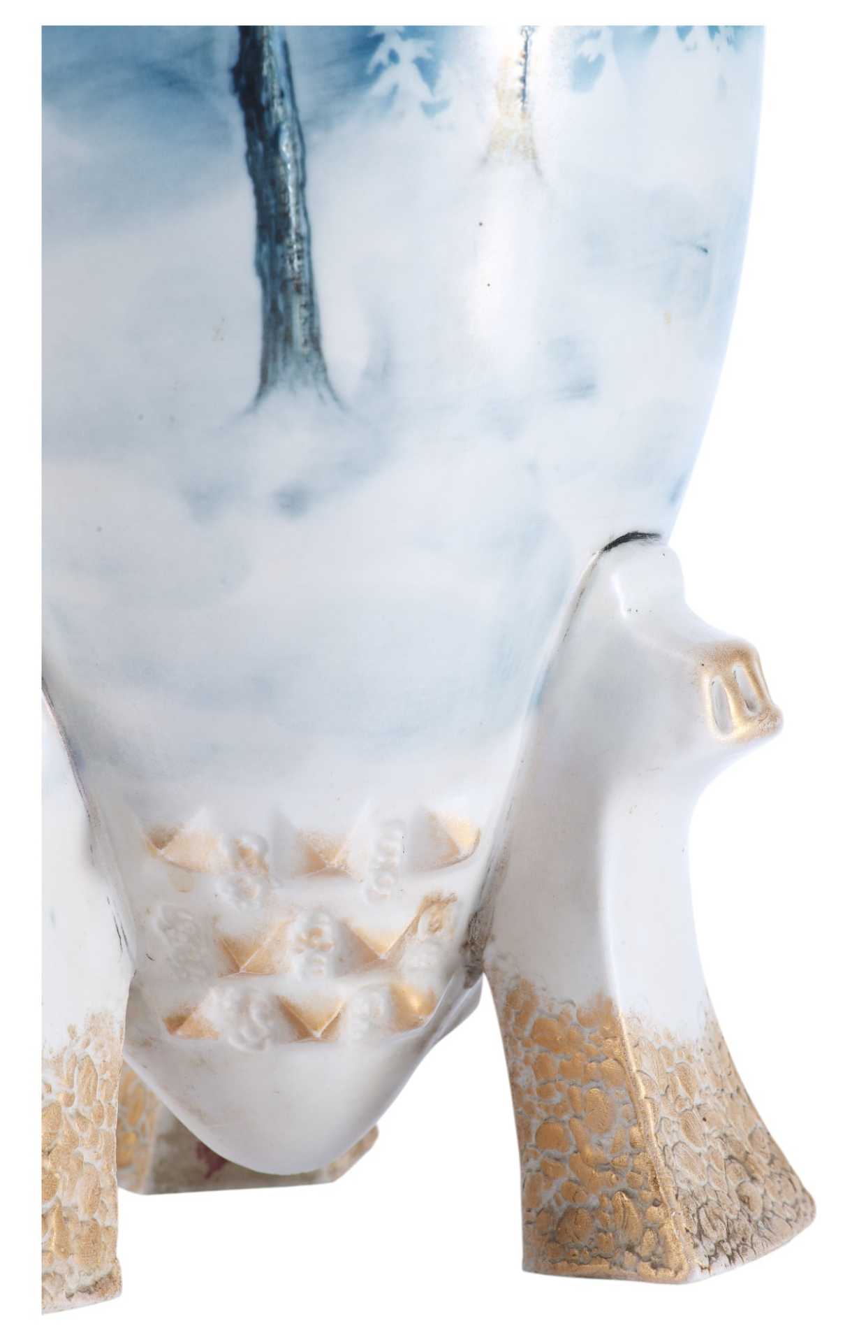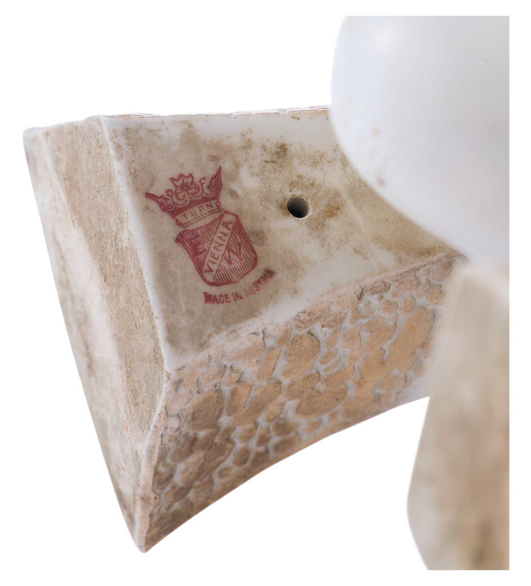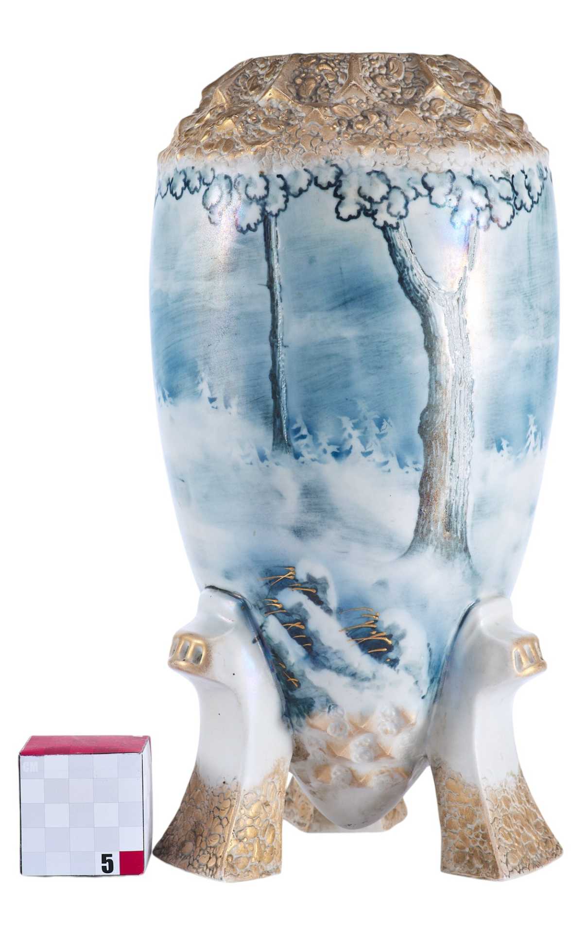 надписями «TURN», «VIENNA E/W», «made in Austria», также присутствует номер: «9309». Основная часть вазы водворена на три фигурные ножки. Поверхность полностью покрыта пейзажем, выдержанным в голубо-серебристых тонах, изображающем мотив северной природы. Пейзаж не объёмен и выполнен стилизованно, но при этом отличается высочайшим уровнем исполнения, что характерно для строгого венского сецессиона. Модерн (в Австрии - сецессион) — стиль в европейском и американском искусстве конца 19 в. - 1910-х гг. Скульптура модерна отличается динамикой и текучестью форм, виртуозной игрой крупных или же хрупких линий и силуэтов. Модерн