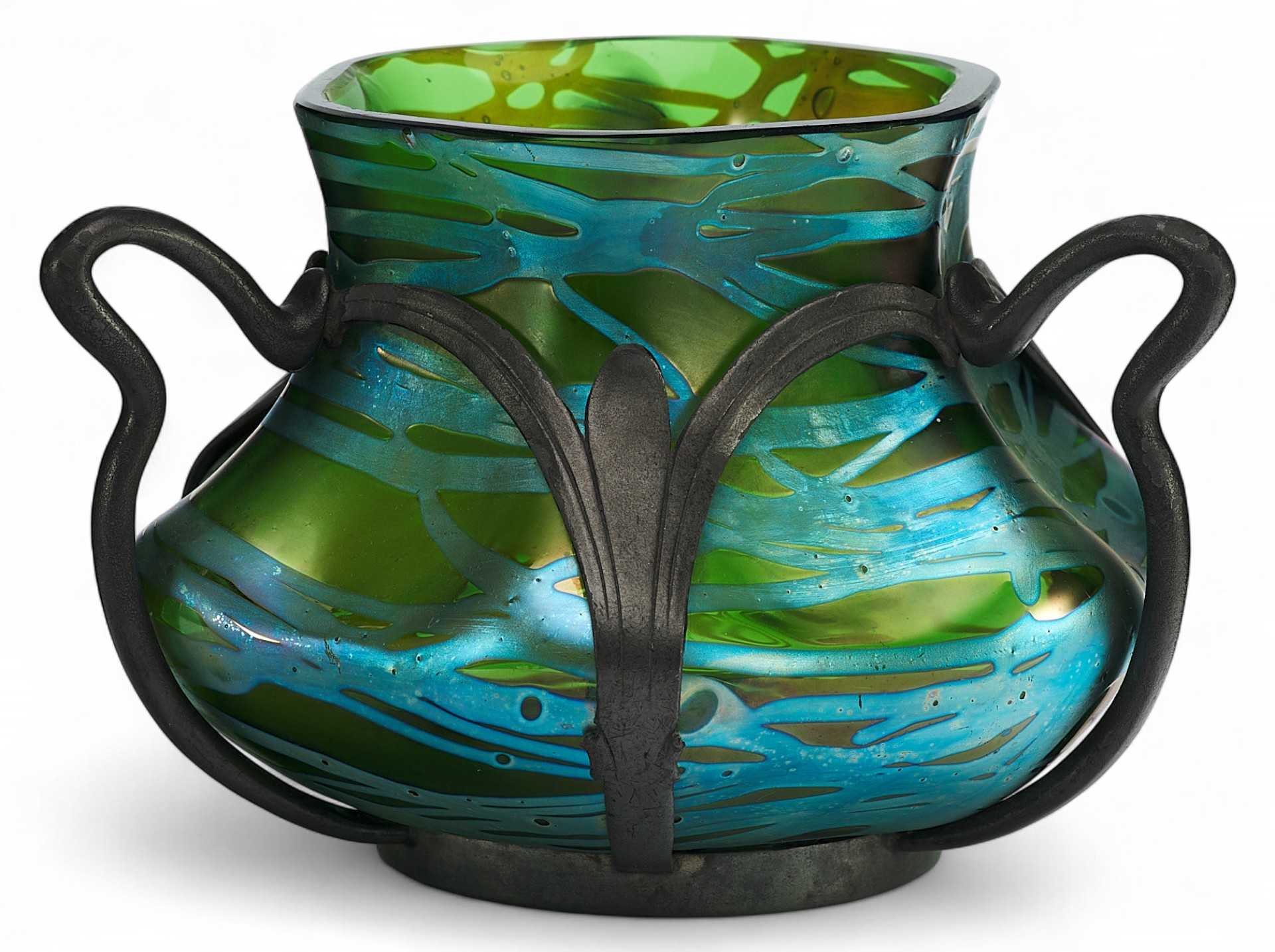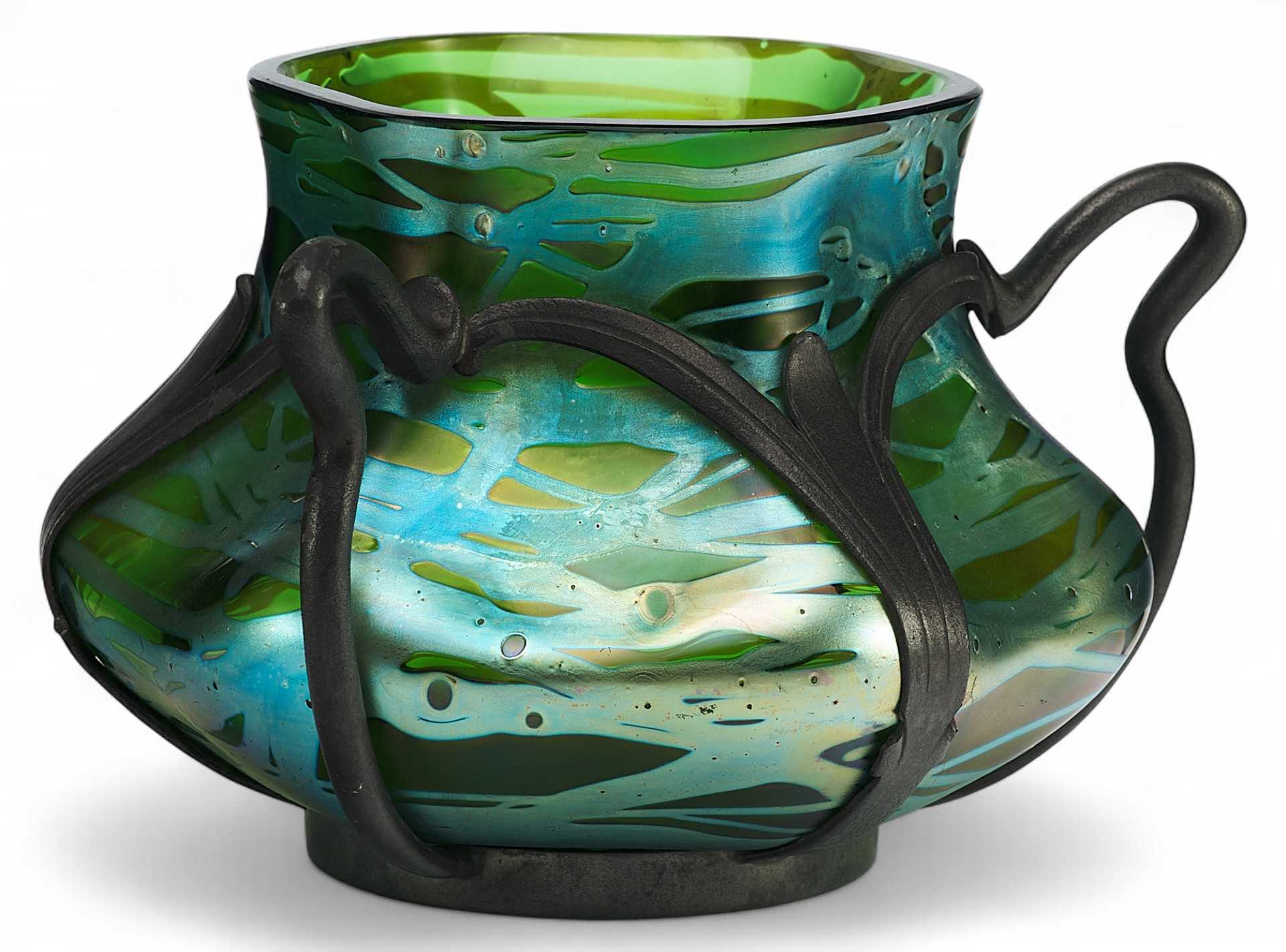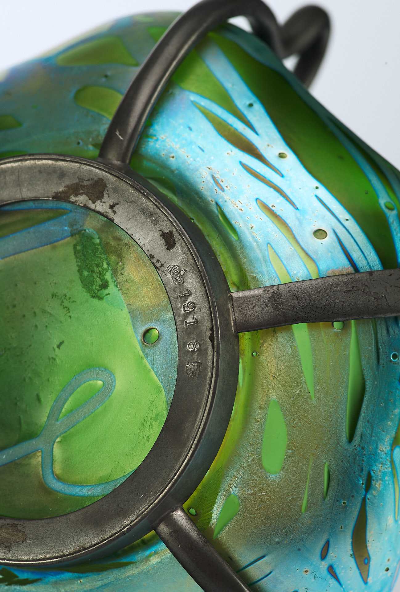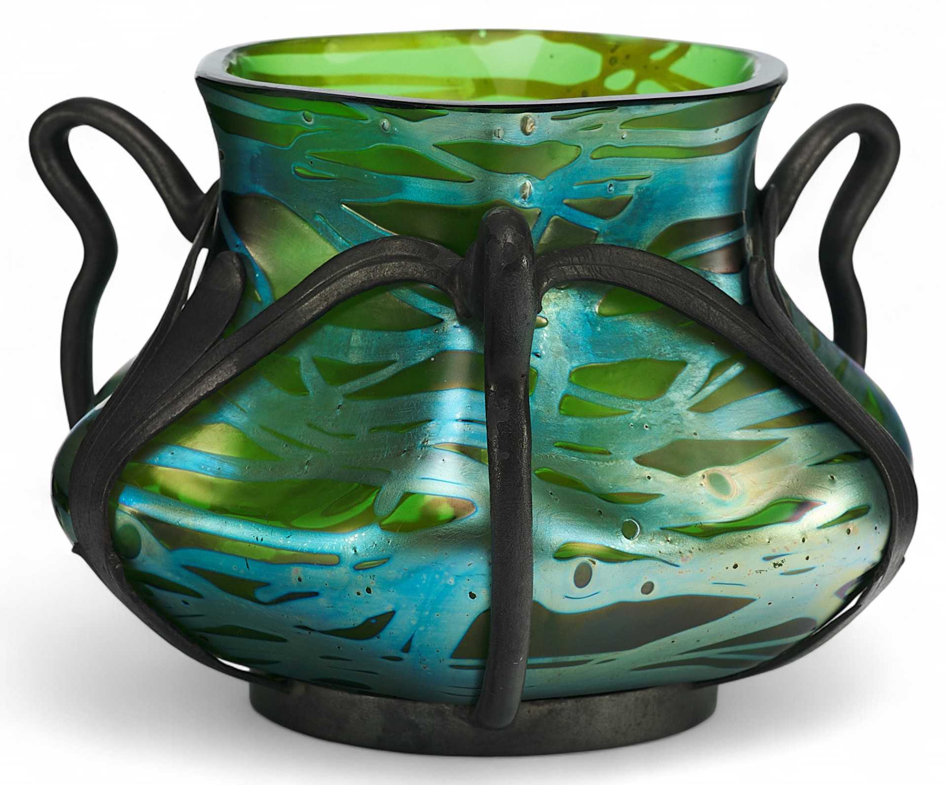 инвентарный номер (191_8). Ваза из зеленого стекла обтекаемой формы заключена в оправу из олова с тремя изогнутыми ручками. Поверхность стекла покрыта абстрактным узором, нанесенным перламутровыми эмалями. Ваза отличается высочайшим уровнем исполнения и качеством стекла, характерным для богемского стекла, и представляет собой