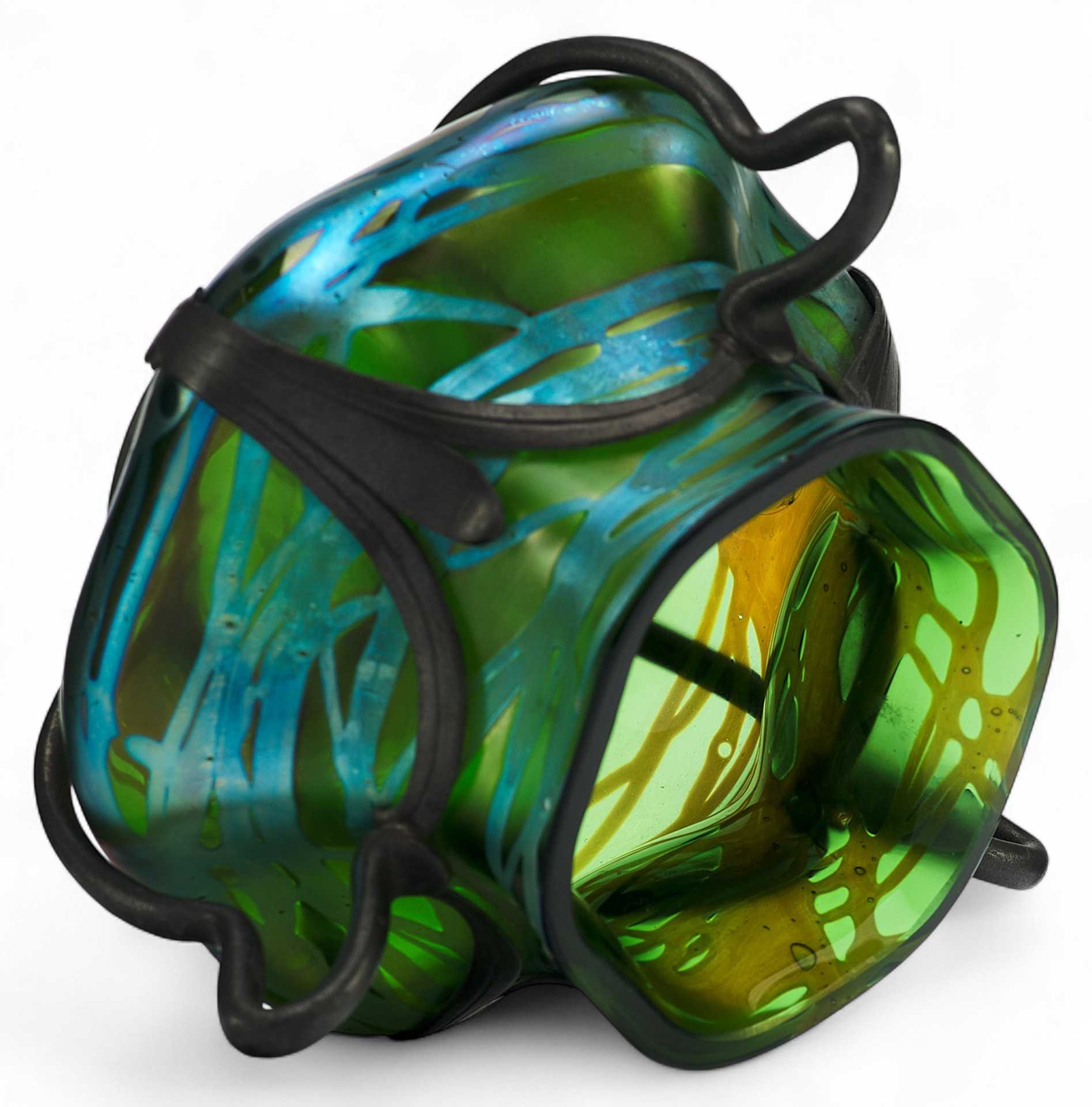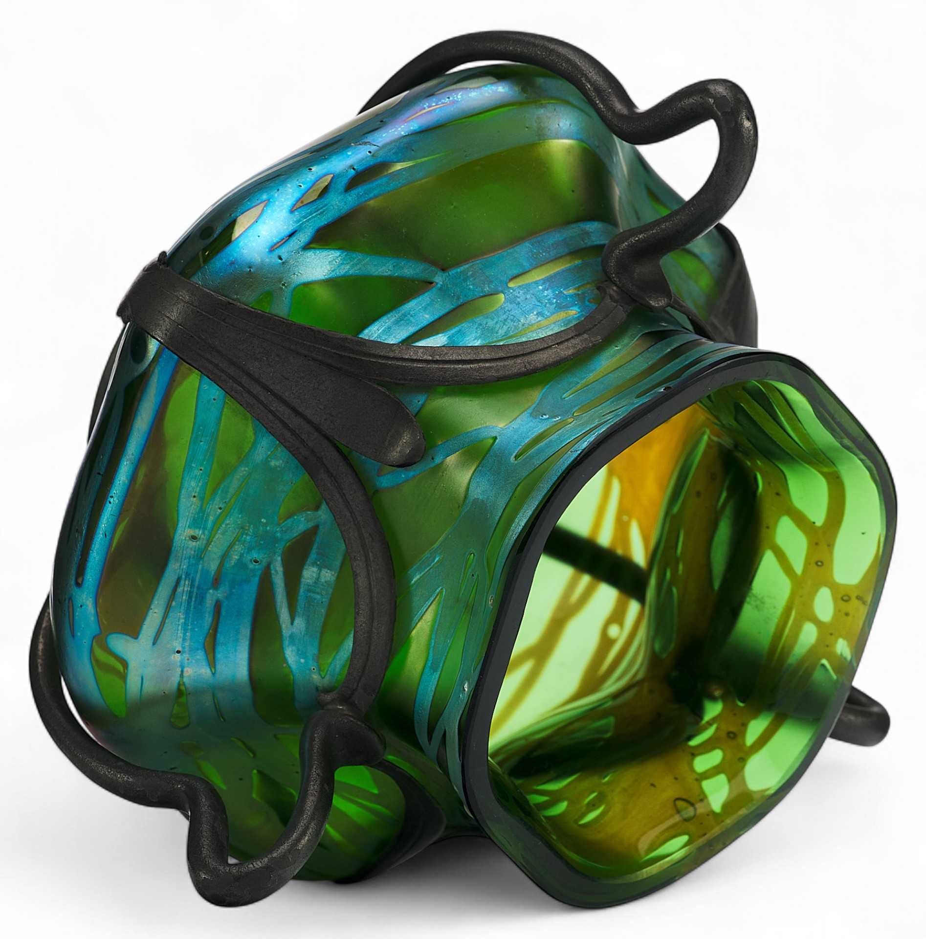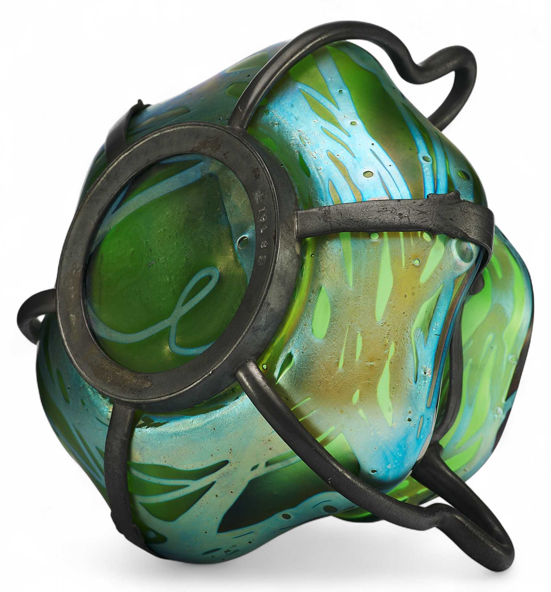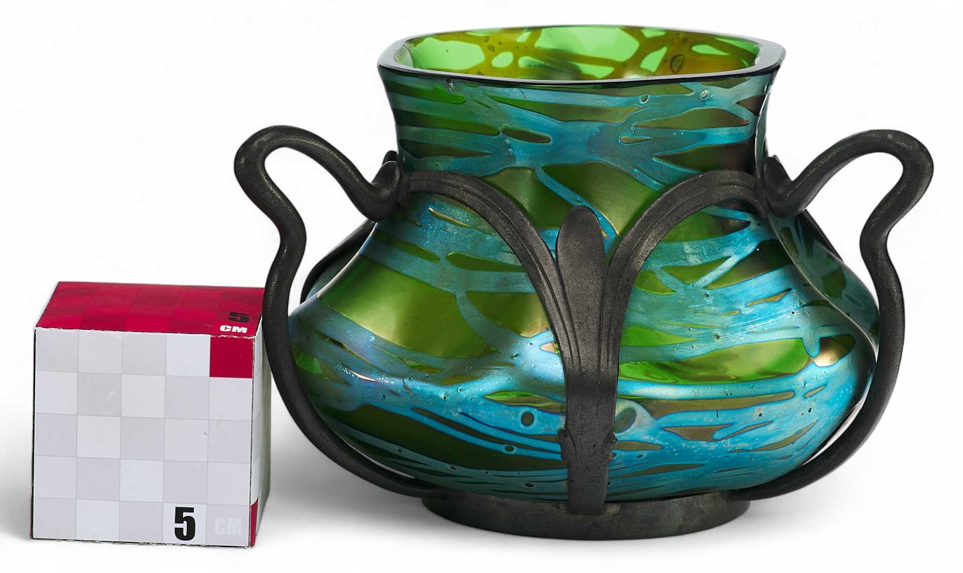 инвентарный номер (191_8). Ваза из зеленого стекла обтекаемой формы заключена в оправу из олова с тремя изогнутыми ручками. Поверхность стекла покрыта абстрактным узором, нанесенным перламутровыми эмалями. Ваза отличается высочайшим уровнем исполнения и качеством стекла, характерным для богемского стекла, и представляет собой