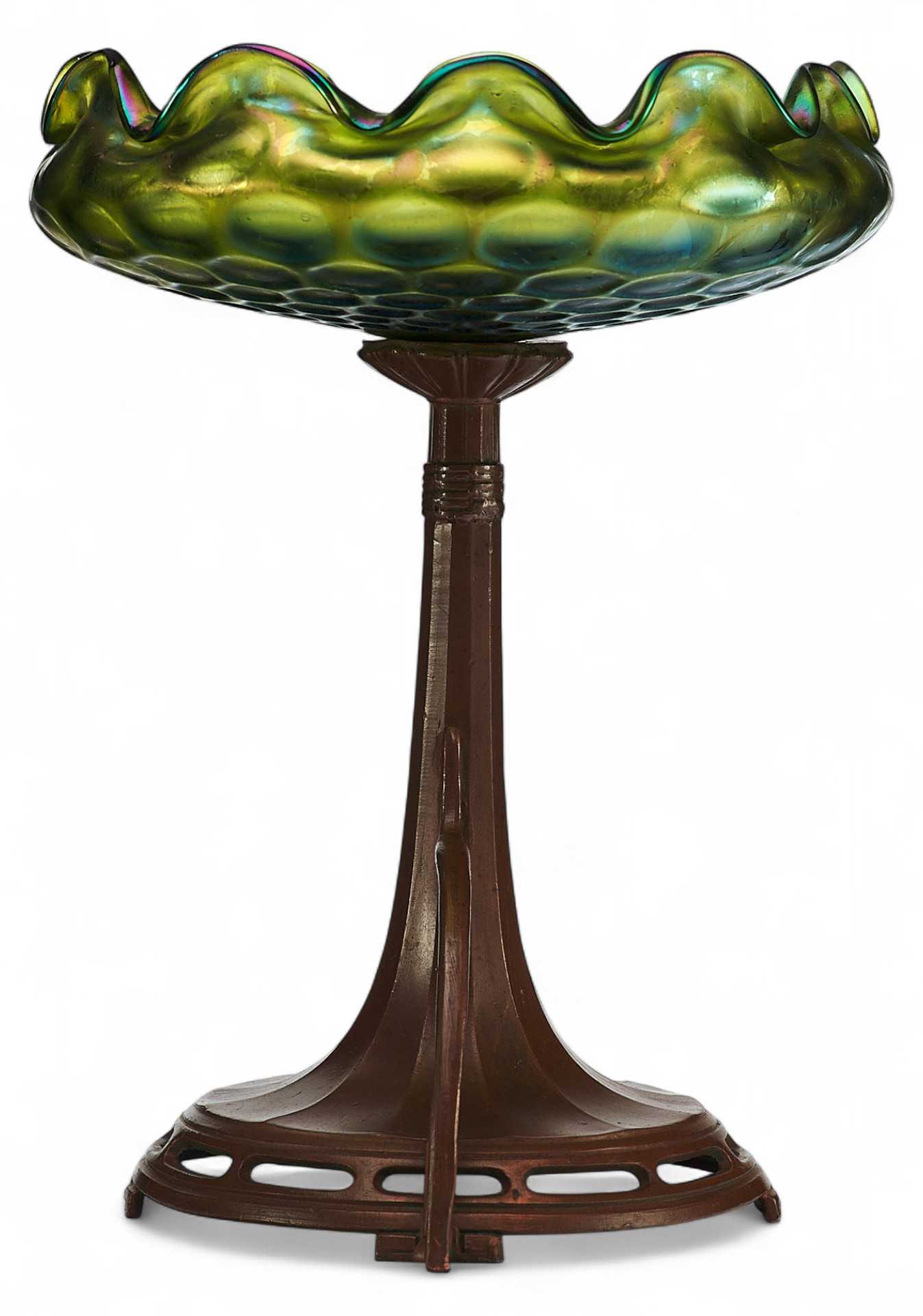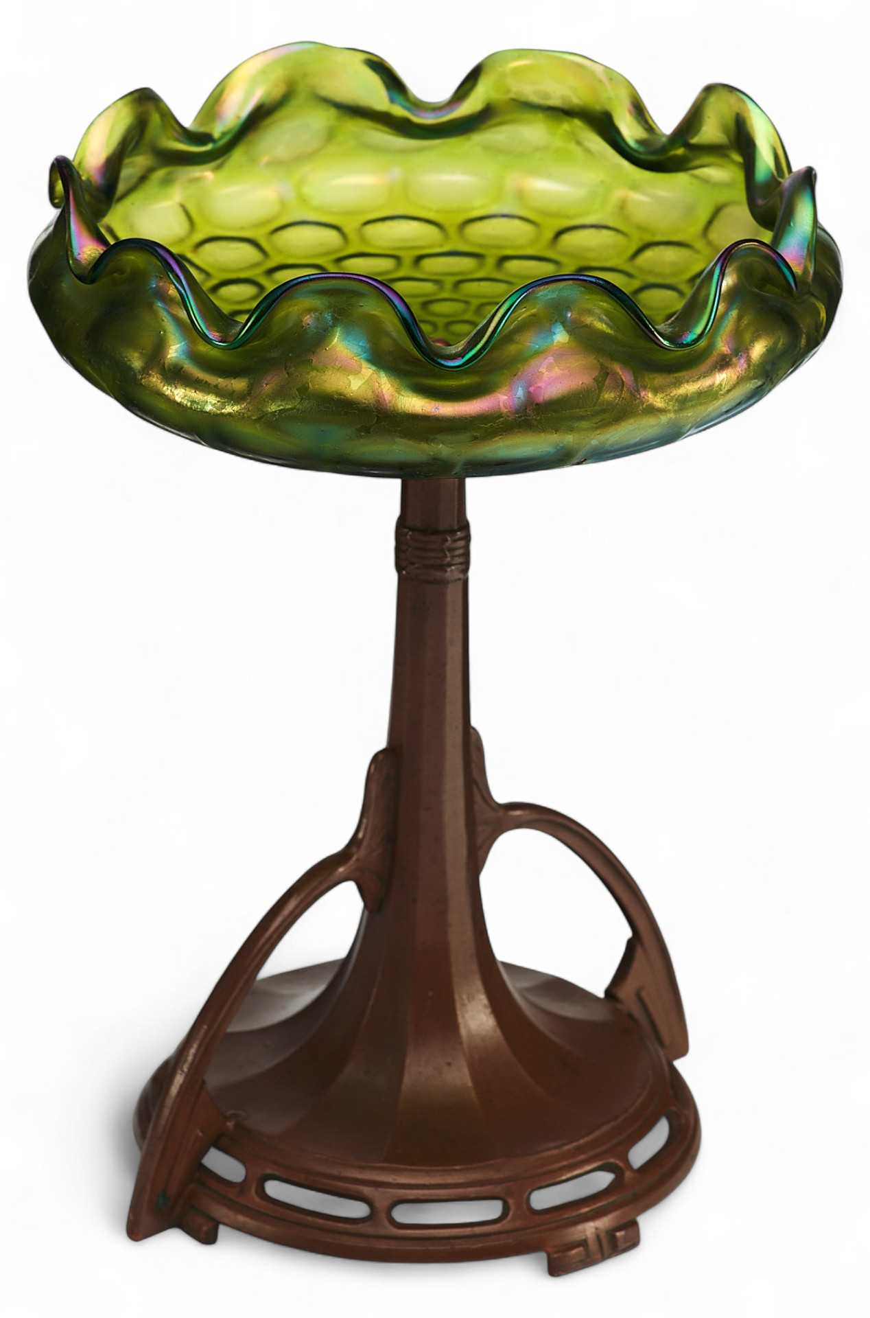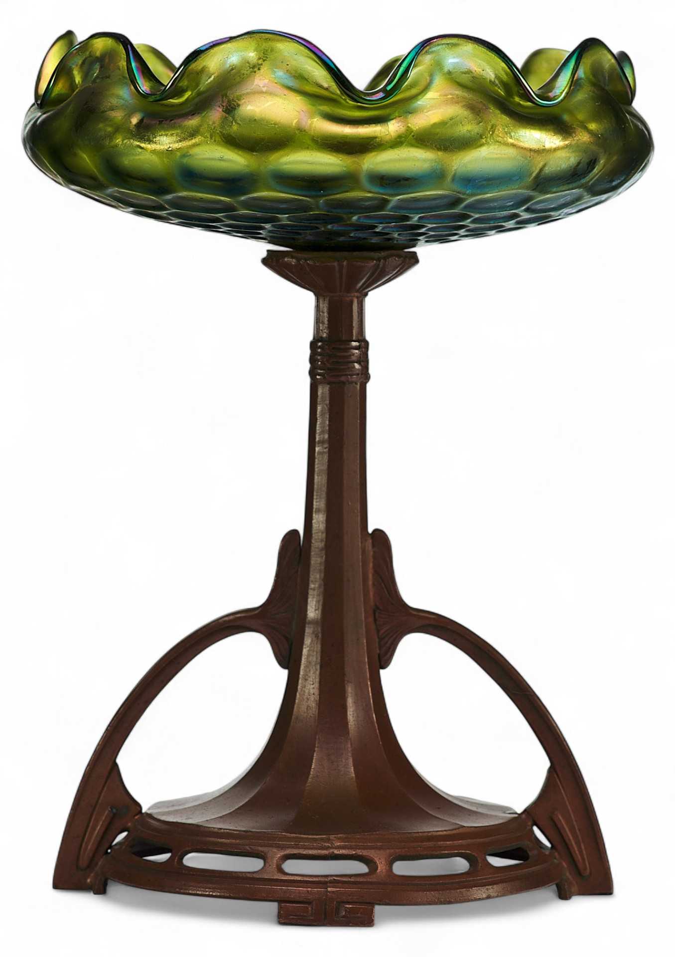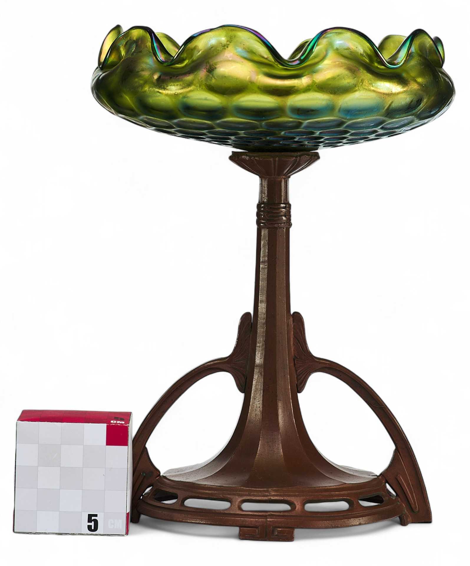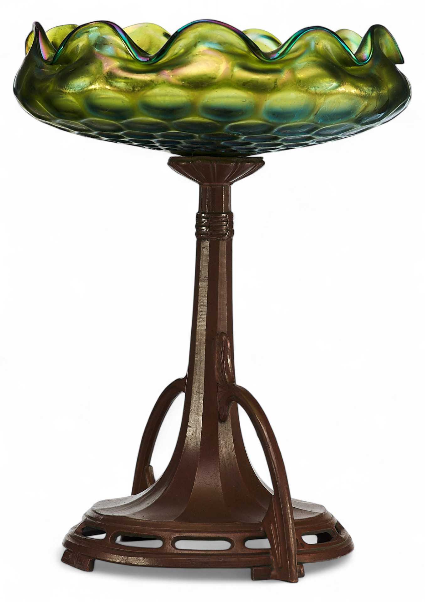 Художественное исполнение вазы явно указывает на стилевые приемы искусства немецкого направления модерна - югендстиля, активно проявившегося в дизайне предметов бытового назначения.Югендстиль - немецкое название модерна, или Art Nouveau, который в конце XIX -начале XX веков господствовал во всех странах Европы. Иметь обстановку или предмет мебели в стиле югенд считалось признаком богатства и хорошего вкуса Ценители восхваляли югендстиль за ясность и чистоту художественных концепций, в которых пространство возымело новую функциональность и декоративное значение. Ирригация — обработка изделий в горячем виде парами солей олова или серебра с добавлением соединений стронция, которые образуют на поверхности тонкую переливающуюся разнообразными цветами пленку. Такая техника получила большую популярность в эпоху модерна. Впервые такой метод стал широко применяться Луисом Комфортом Тиффани в США для изготовления новых видов декоративных стекол. Самое известное из его творений в области получения новых видов стекла Тиффани назвал «favrile», что в переводе с латыни означает «рукотворное»; есть у него и другое название — «пламенеющее», потому' что оно переливается всеми цветами радуги и больше напоминает металл, нежели стекло. Такое стекло изготавливается методом ирризации.
