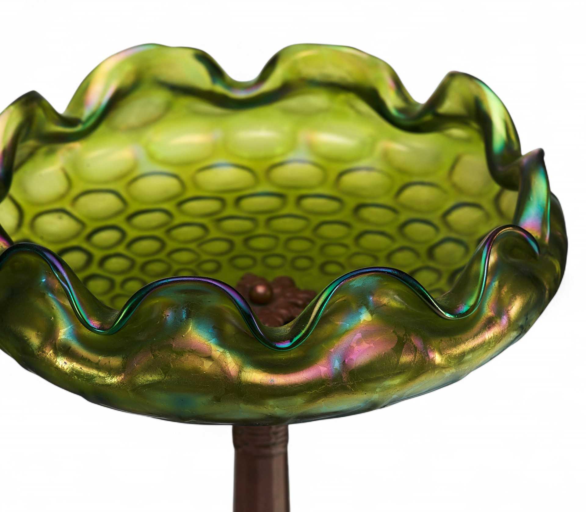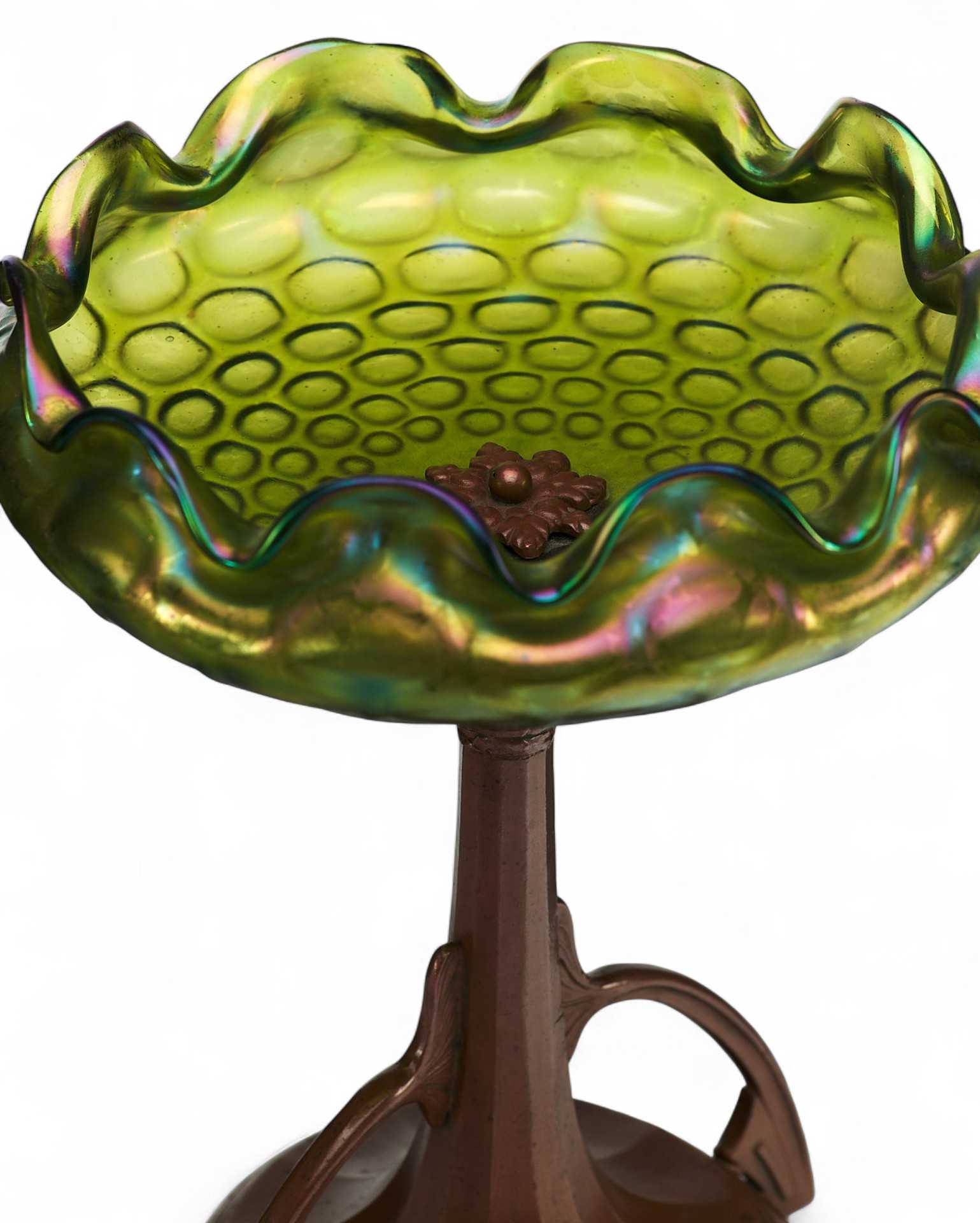Ваза из зеленого стекла с фистончатыми плавными краями. Стекло обработано в технике ирризации. Ножка вазы выполнена из бронзы.
