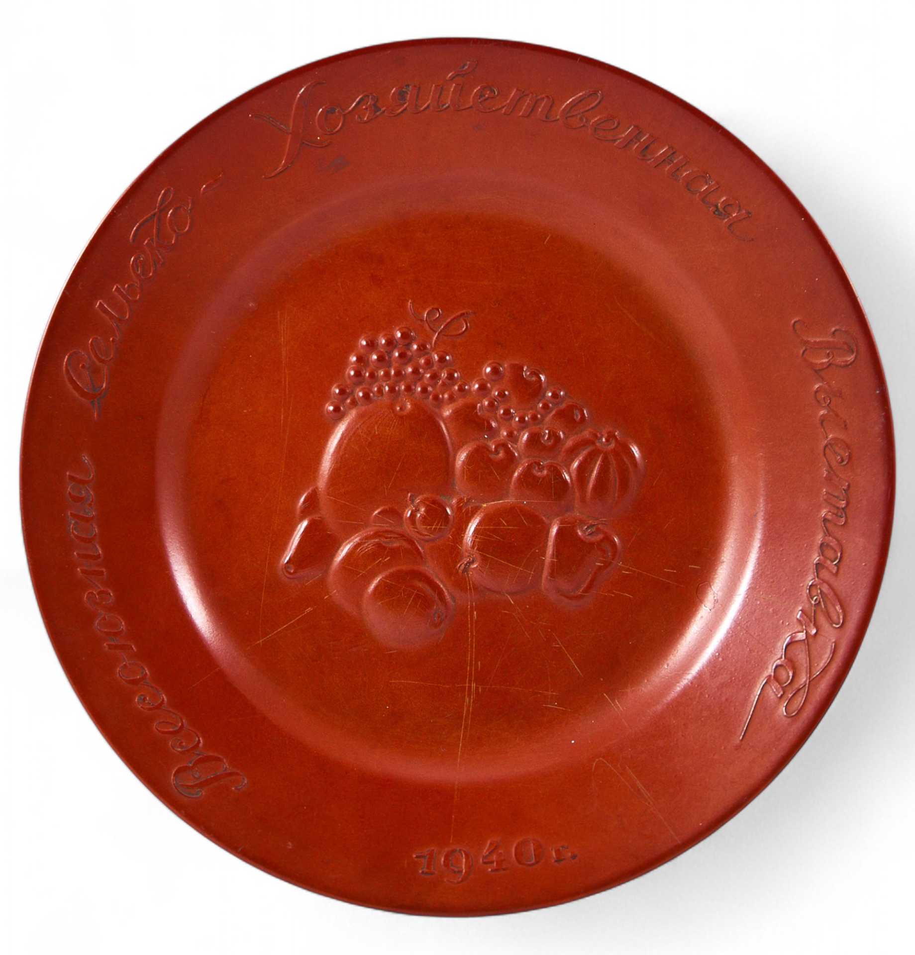 террактового цвета. По фризу пущена надпись, стилизованная под рукописный текст: «Всесоюзная Сельско-Хозяйственная Выставка 1940 г». В центре тарелки — рельефное упрощенное изображение натюрморта из фруктов и овощей. Выпуск подобных памятных предметов с символикой ВСХВ был приурочен к открытию второй, и последней до войны выставки летом 1940 г.