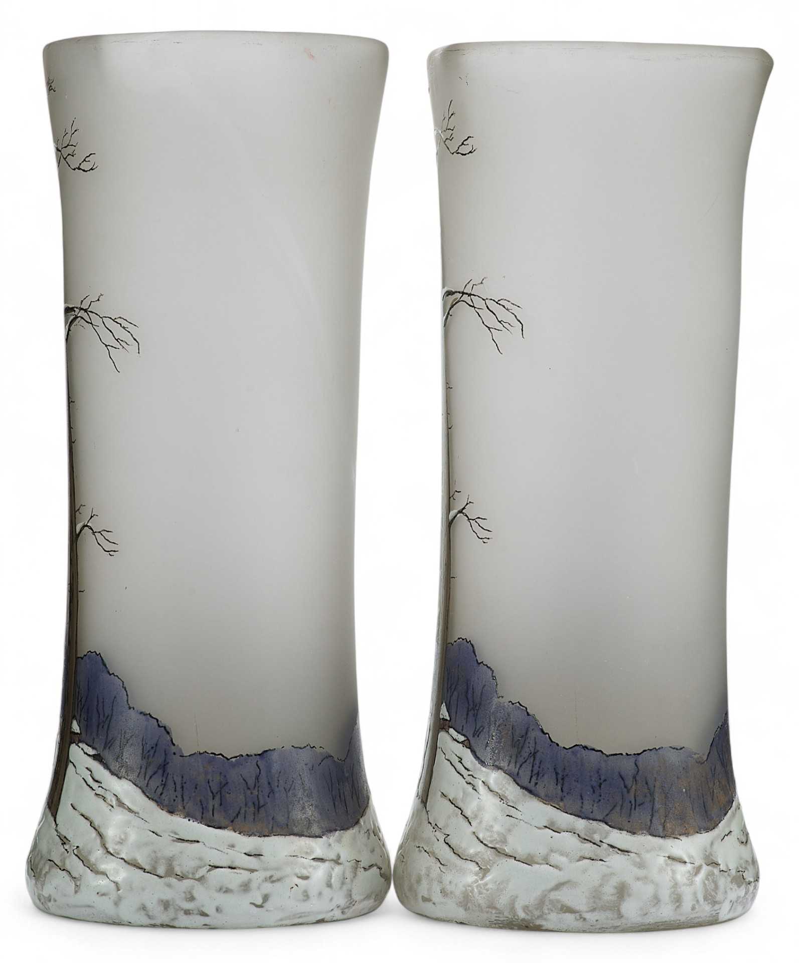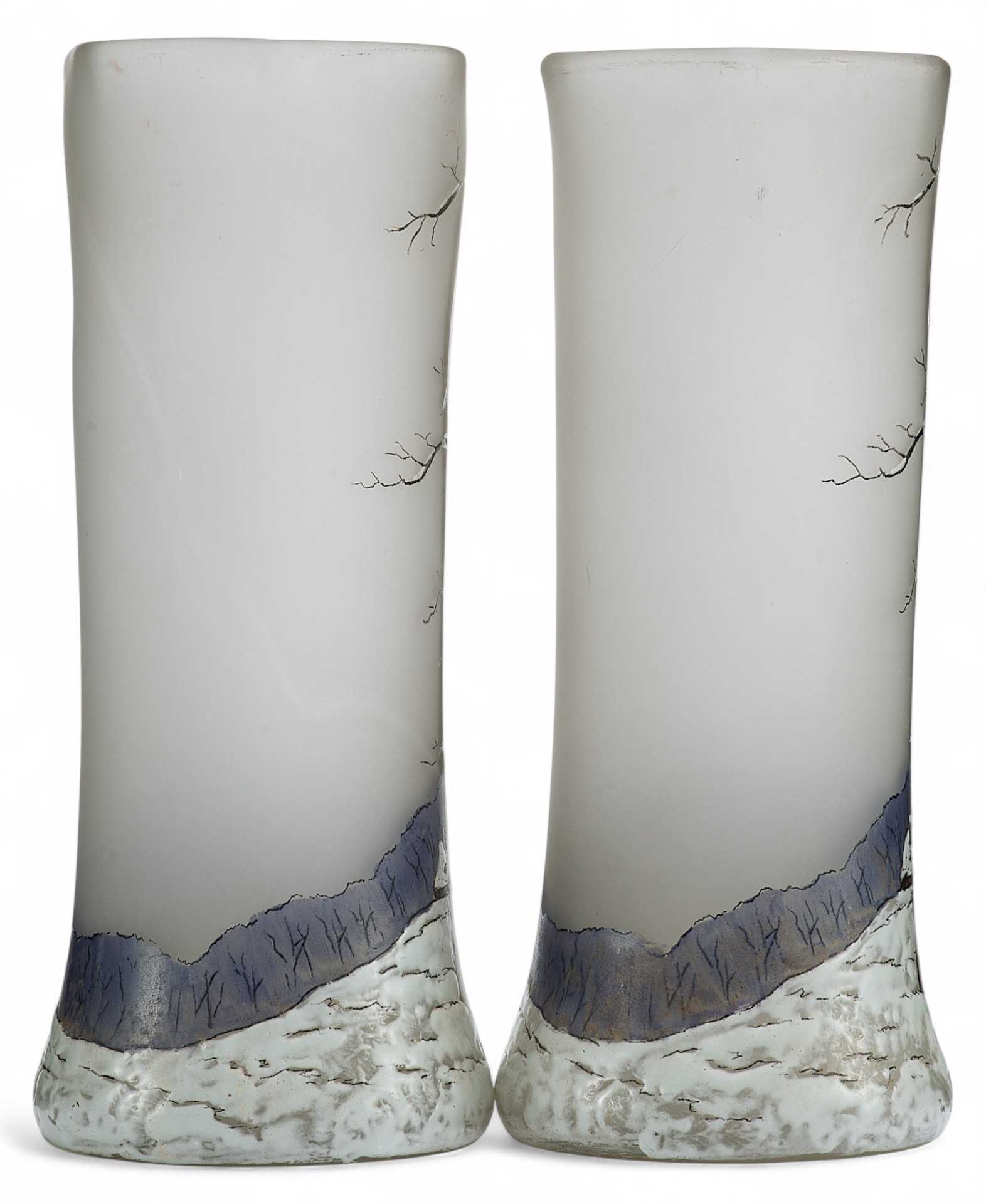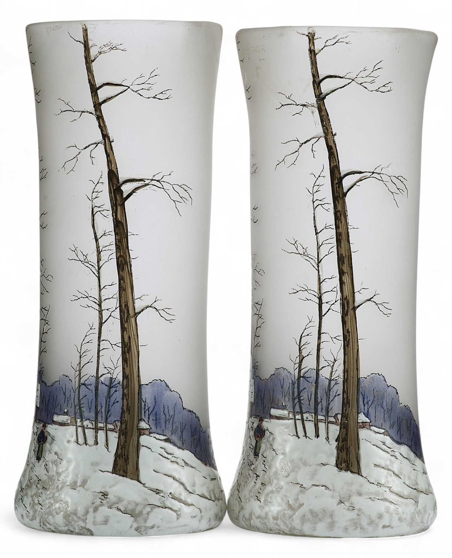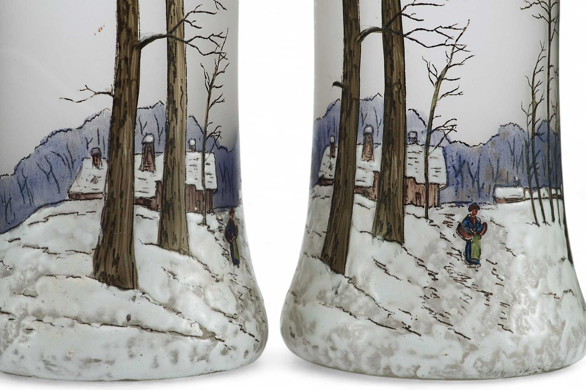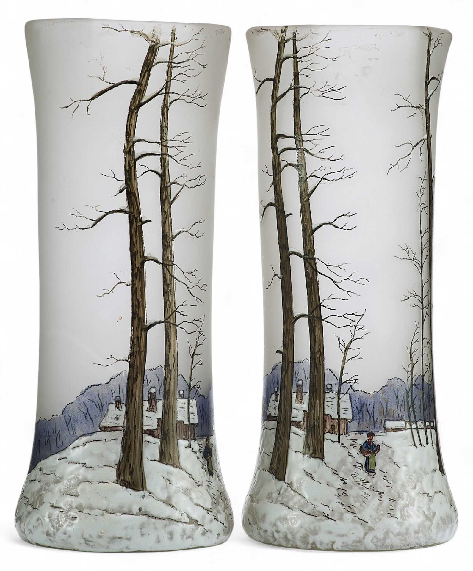 Парные вазы из белого матового стекла с росписью, где изображена зимняя лесная дорожка, ведущая от дома и одинокого путника на ней. Вазы изготовлены в соответствии с канонами стиля ар-нуво на одной из европейских частных стекольных фабрик.
