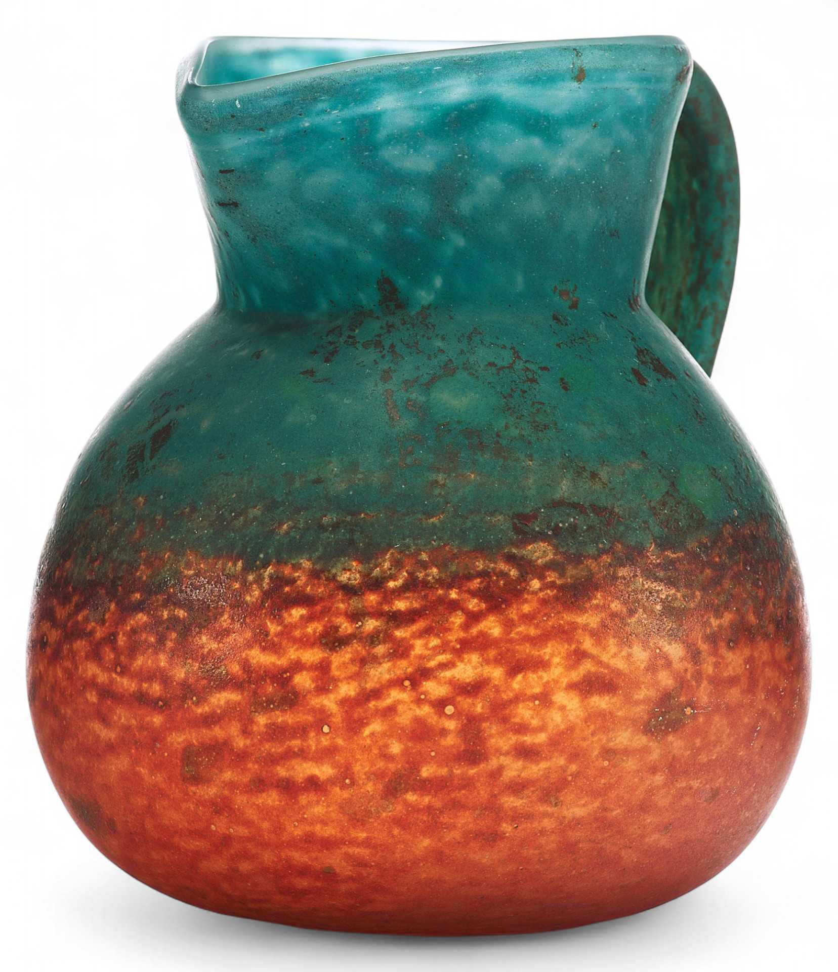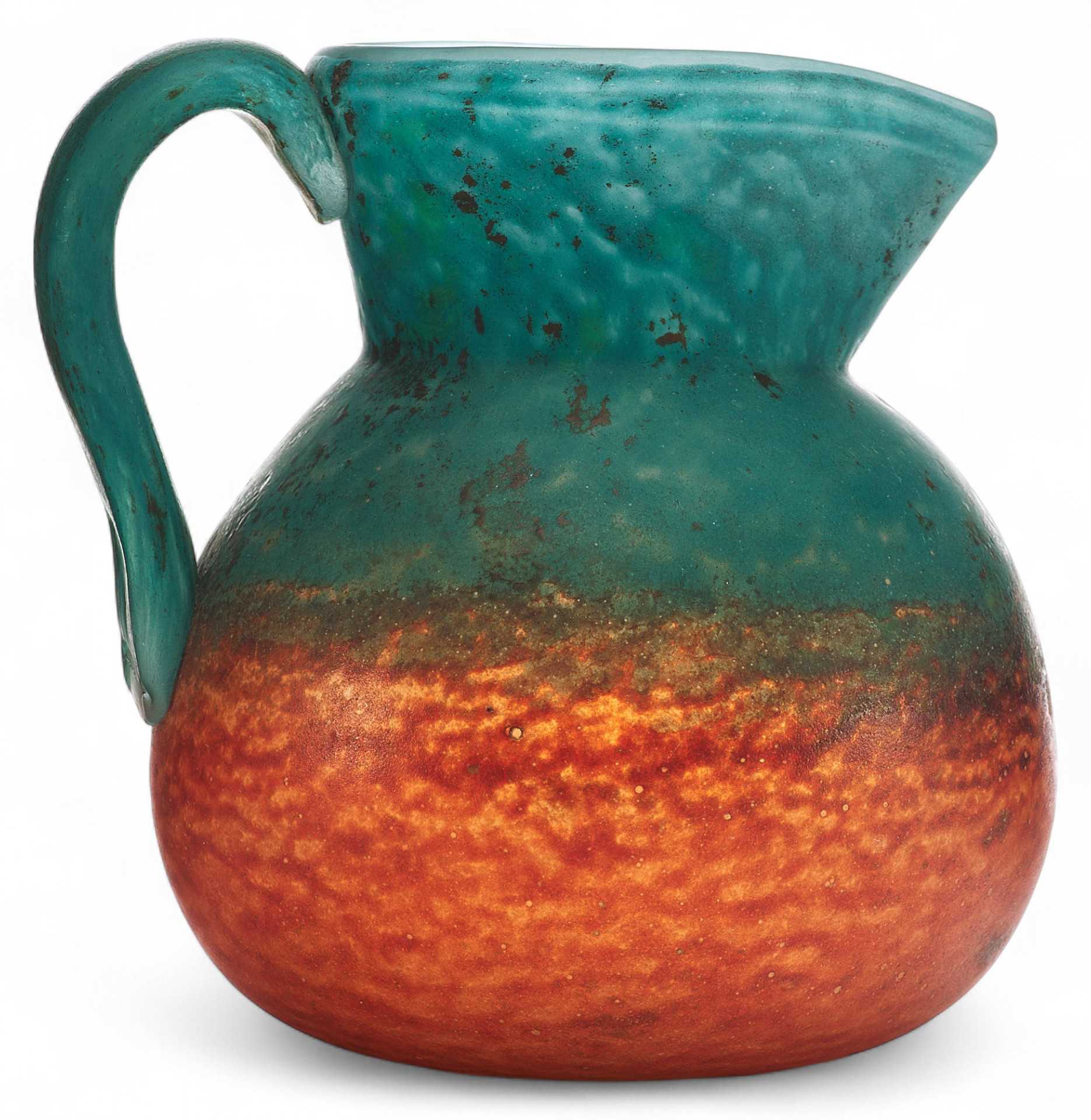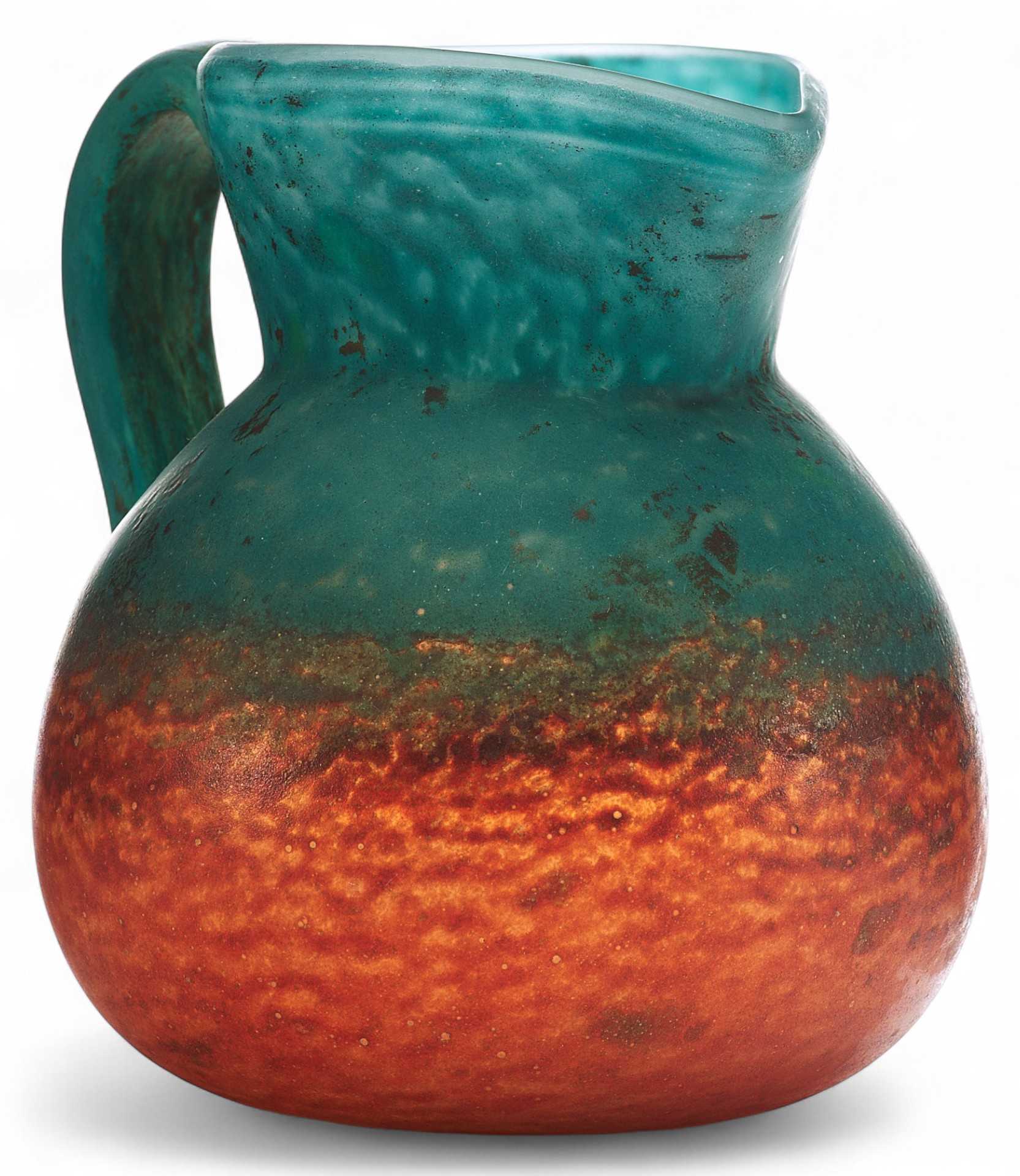 Стеклянный кувшин, украшенный двухцветной росписью, характерной для художественного оформления ваз и предметов быта в стиле модерн. В частности подобные изделия из матового не прозрачного цветного стекла широко изготавливались на