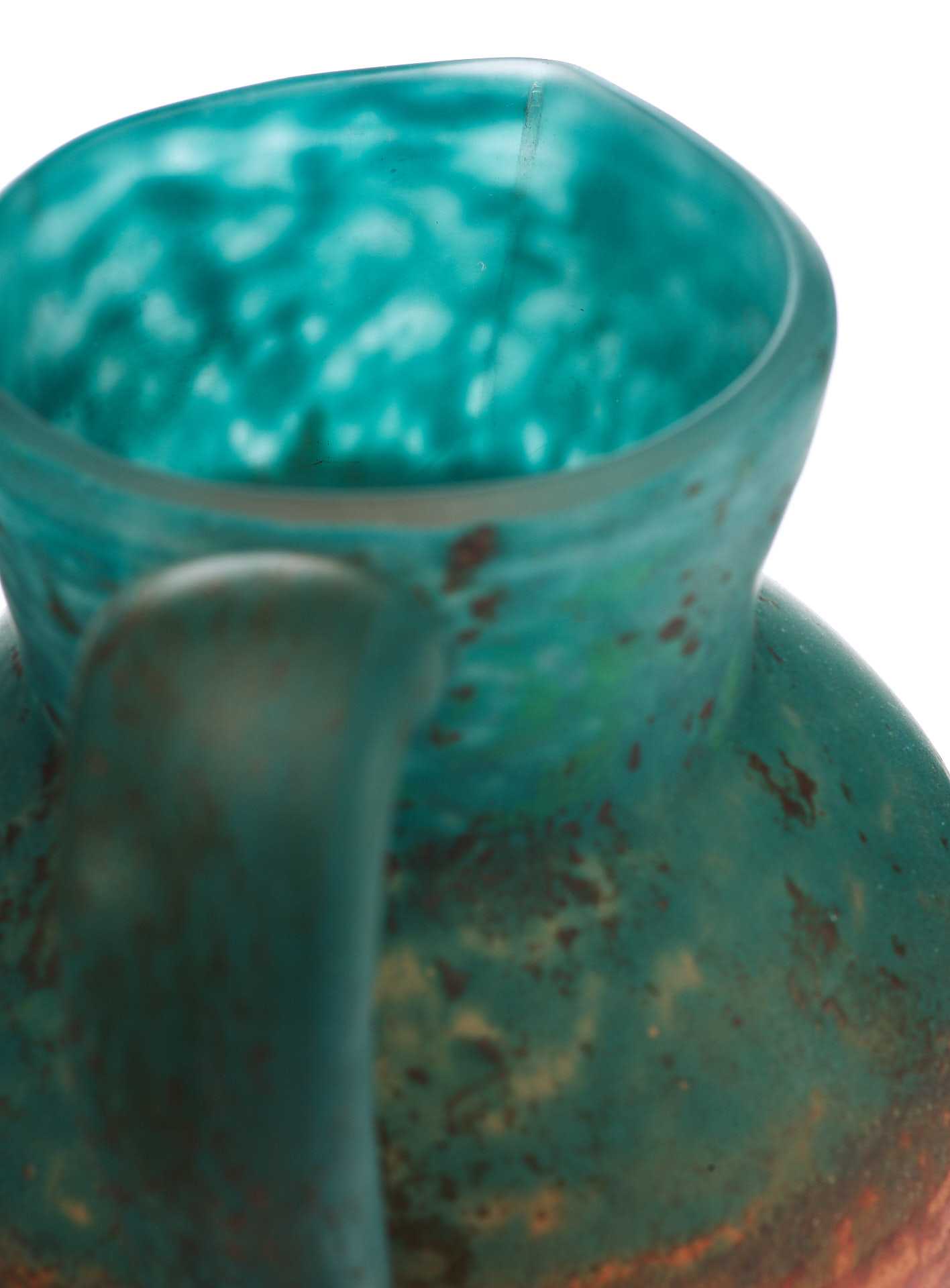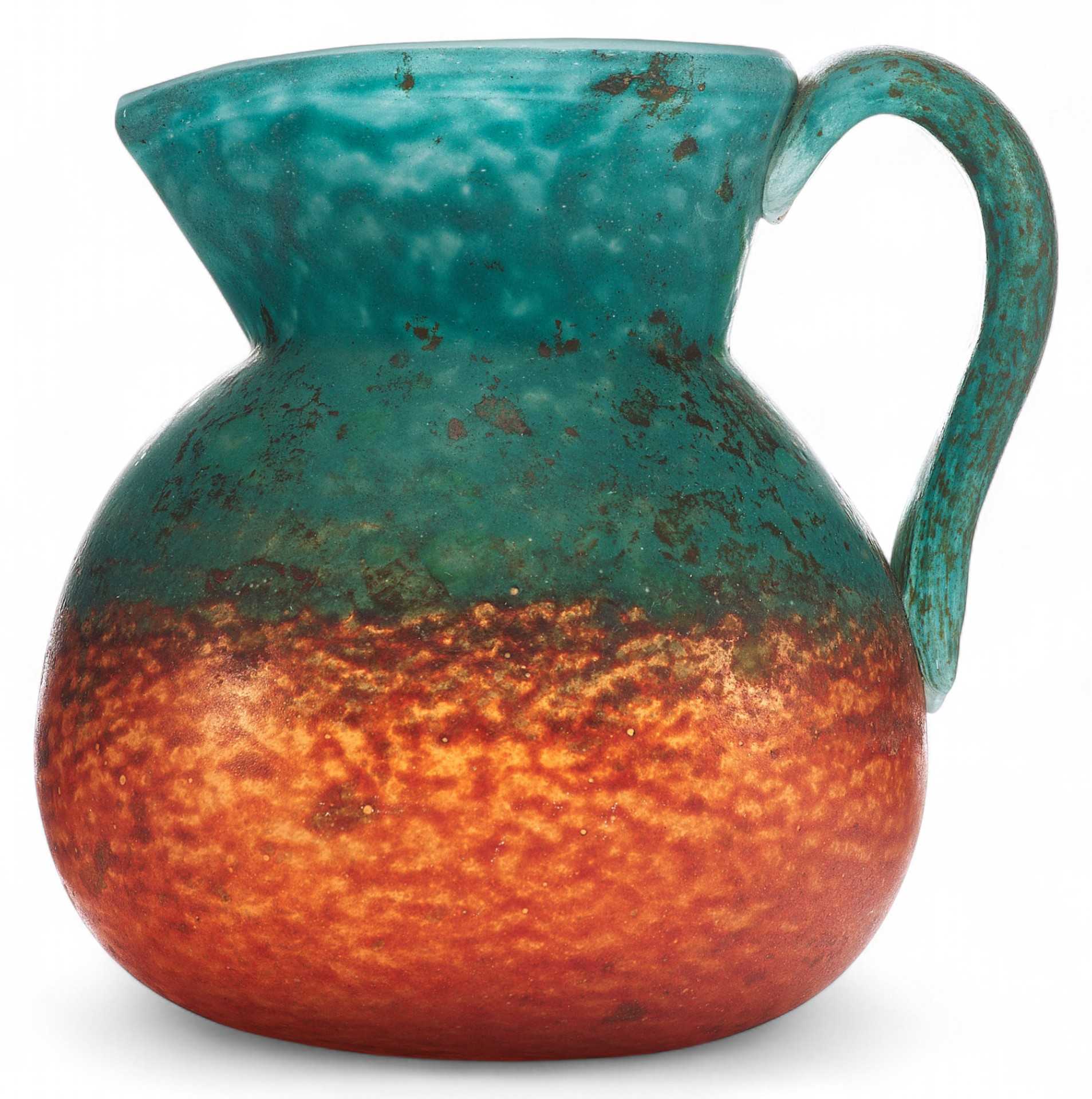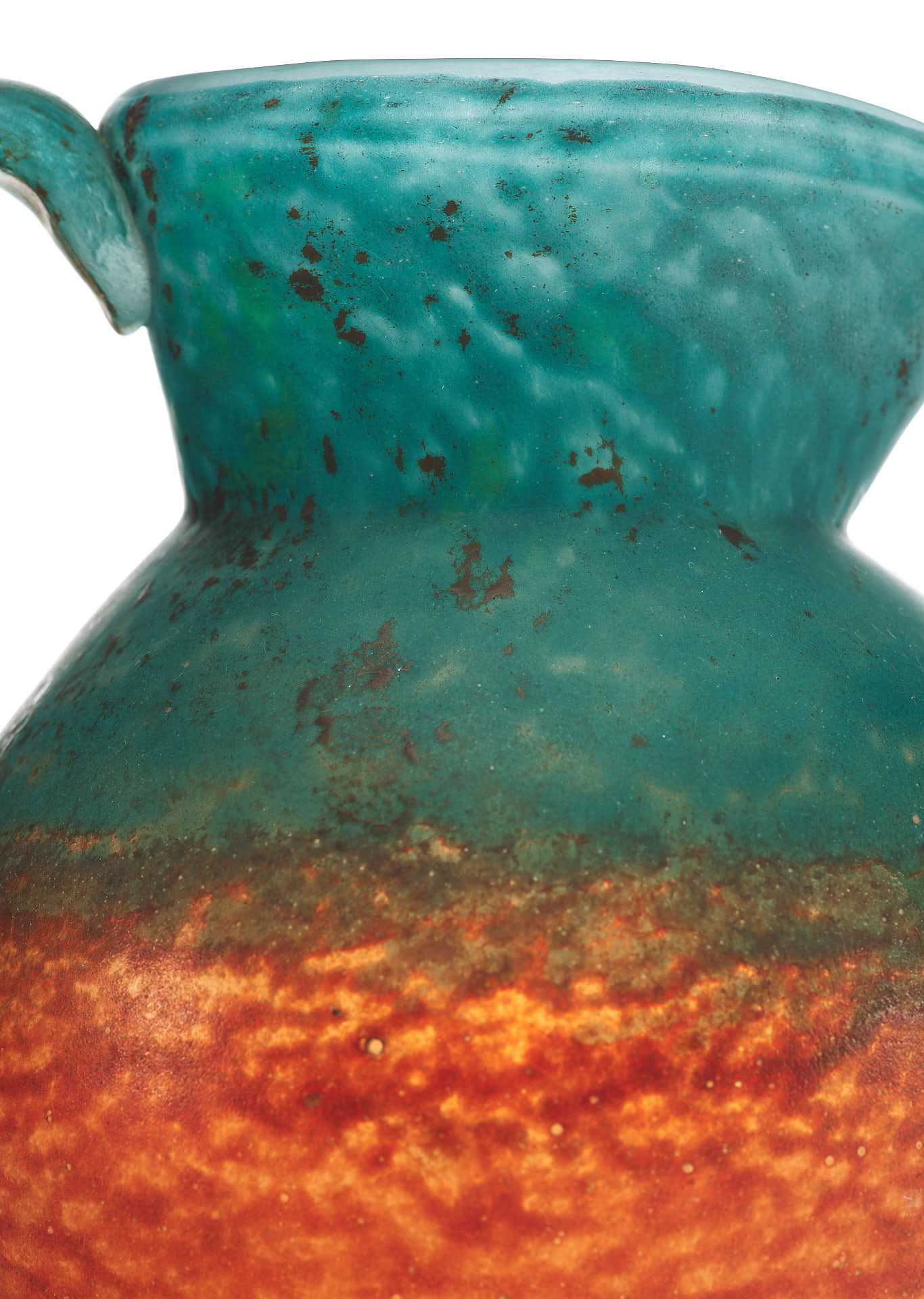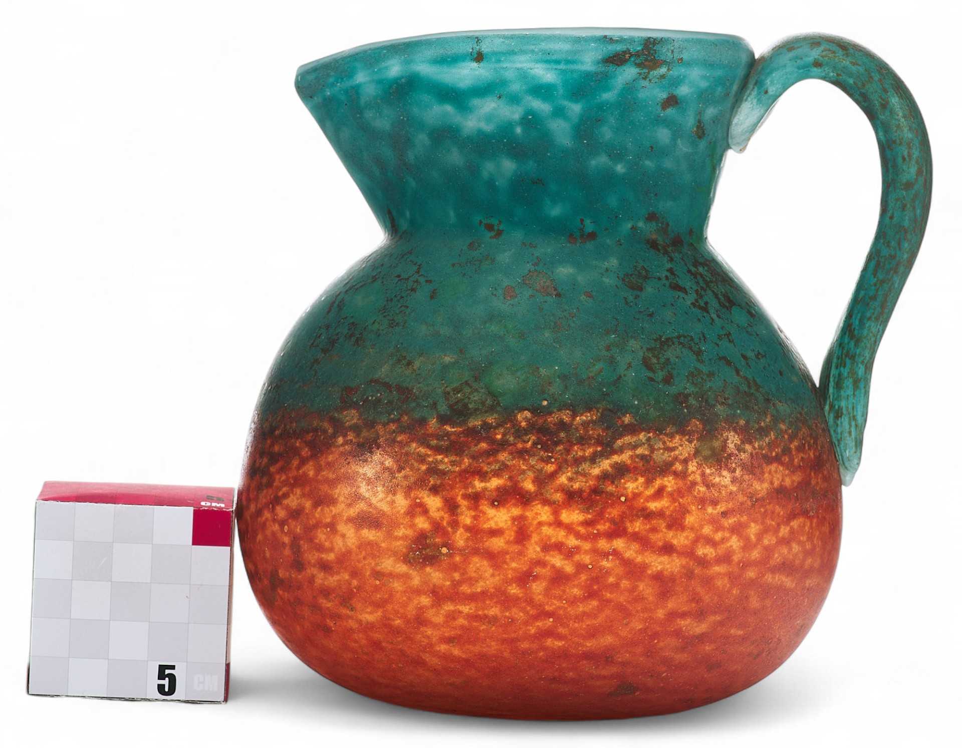 Стеклянный кувшин, украшенный двухцветной росписью, характерной для художественного оформления ваз и предметов быта в стиле модерн. В частности подобные изделия из матового не прозрачного цветного стекла широко изготавливались на
