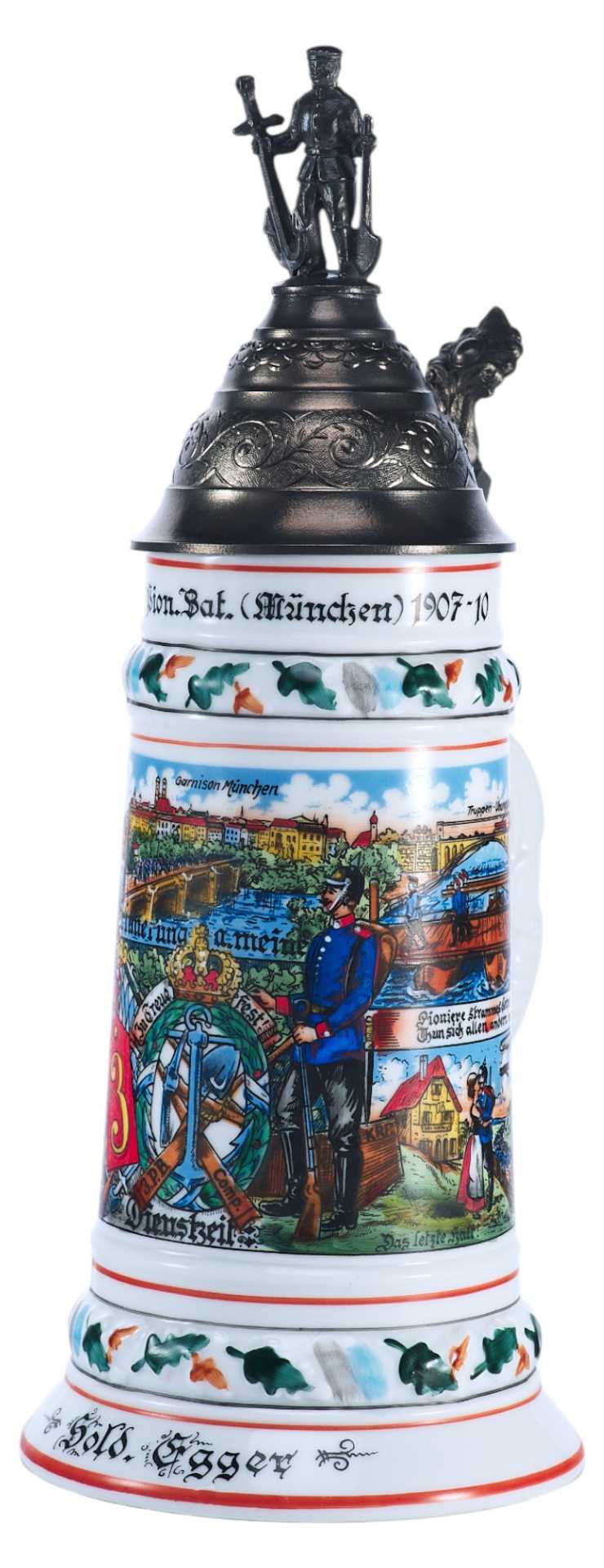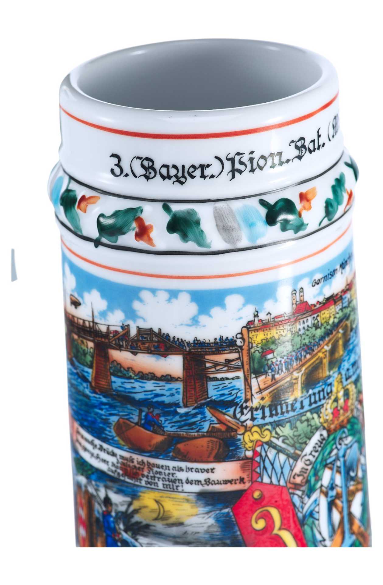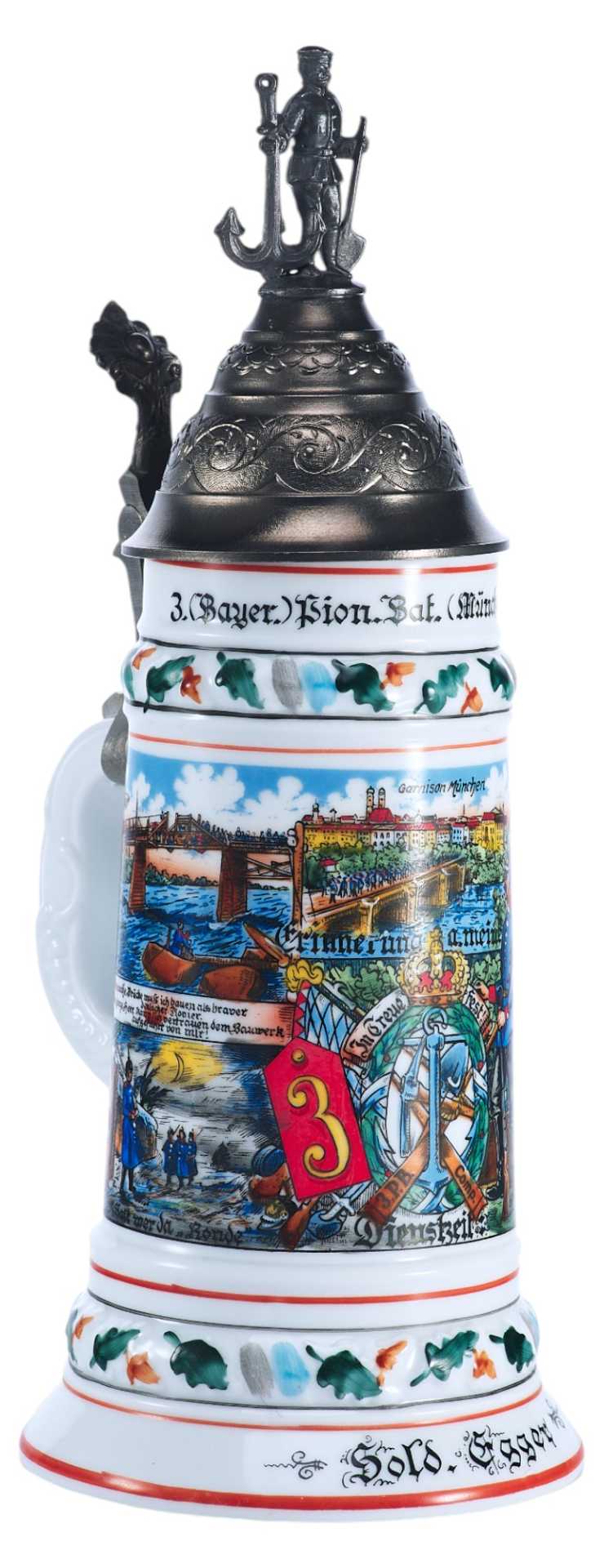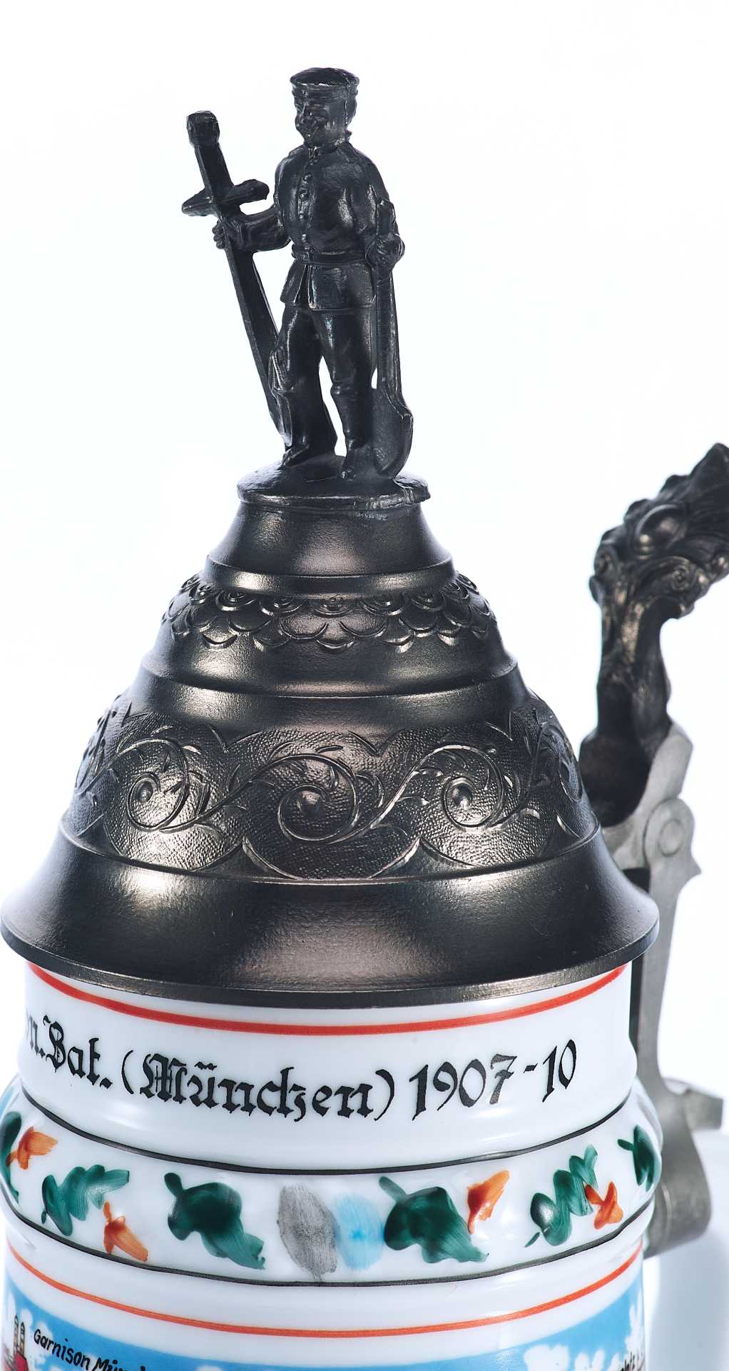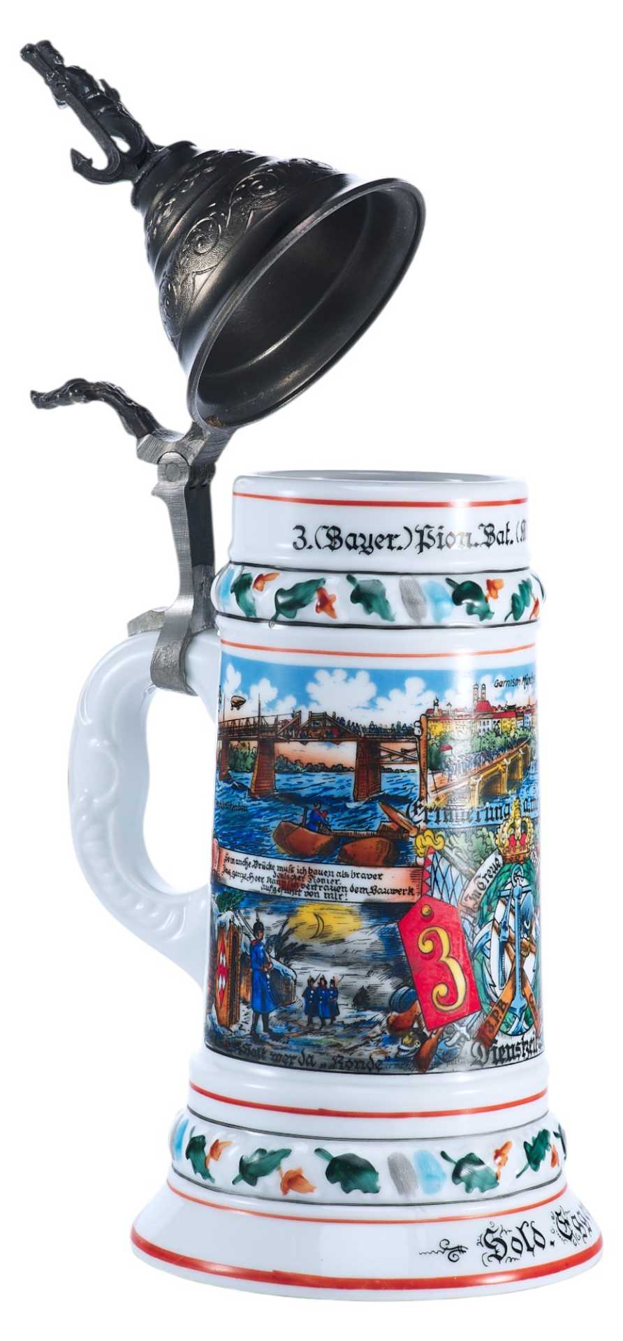 У края кружки надпись: 3. (Bayer.) Bion. Bat. (München) 1907-10 -период, когда указанный полк являлся мюнхенским гарнизоном, что указано на кружке. В конце ХІХ-го века в Германской империи был очень развит патриотический порыв: все граждане мужского пола хотели отслужить в армии (хотя это было и необязательно) — и "на память" о службе обзаводились рядом предметов, которые потом показывали бы всем, что их обладатель действительно служил в армии. Основным предметом была пивная кружка — по возвращении из армии эта пивная кружка оставлялась в виде "кружки штаммгаста" (постоянного гостя) в ближайшей пивной, и тогда все видели, что из неё пьёт настоящий вояка. Кружки резервистов приобретались ими на свои деньги, причём стоимость кружки была сопоставима с месячным довольствием резервиста. Ведь все эти кружки расписывались только вручную и у неё была обычно очень "вычурная" крышка, показывающая на род войск и место службы резервиста.