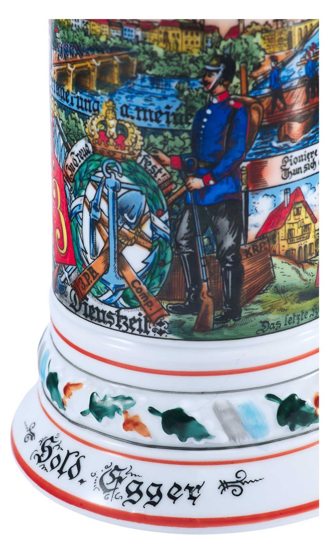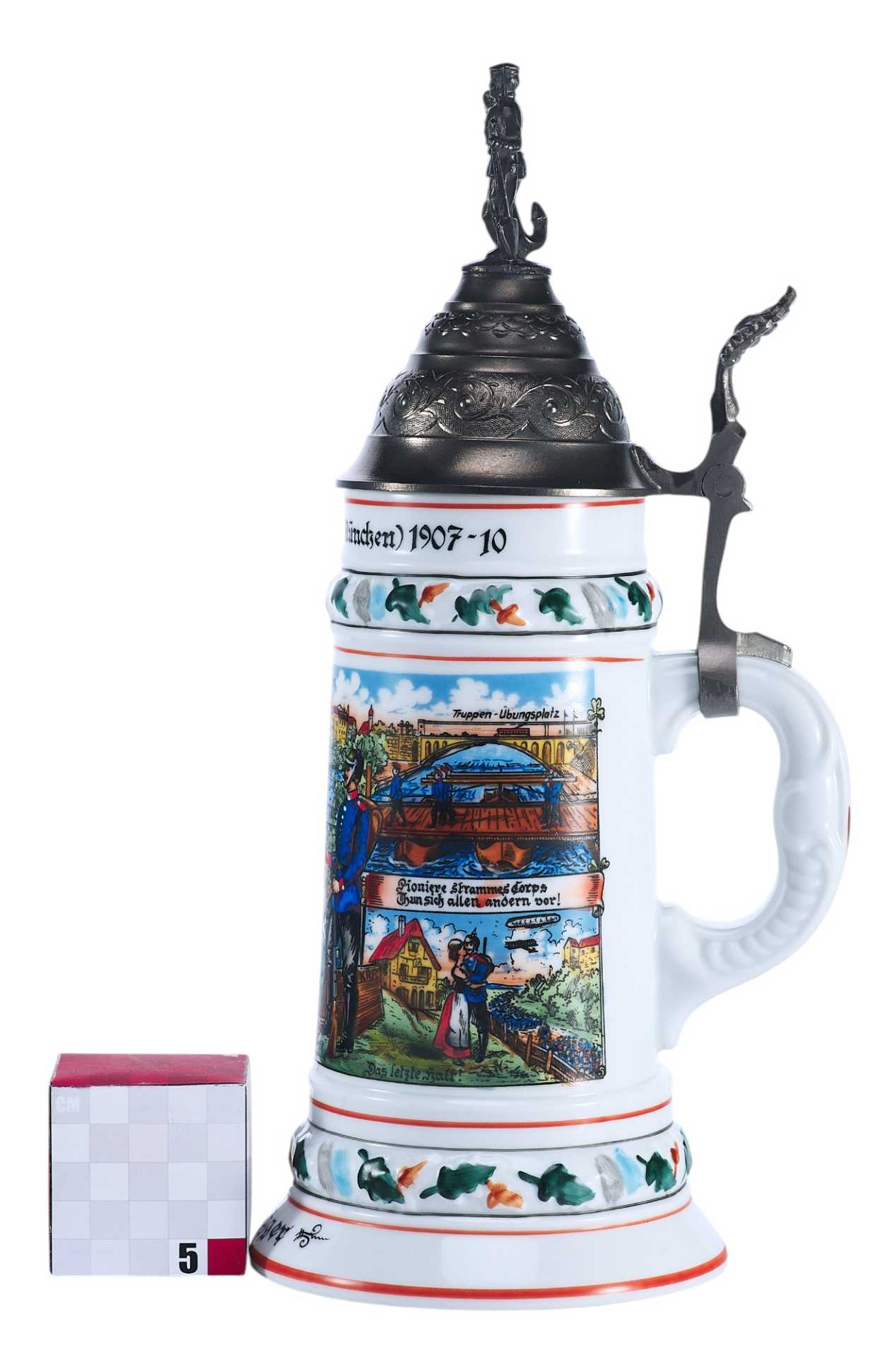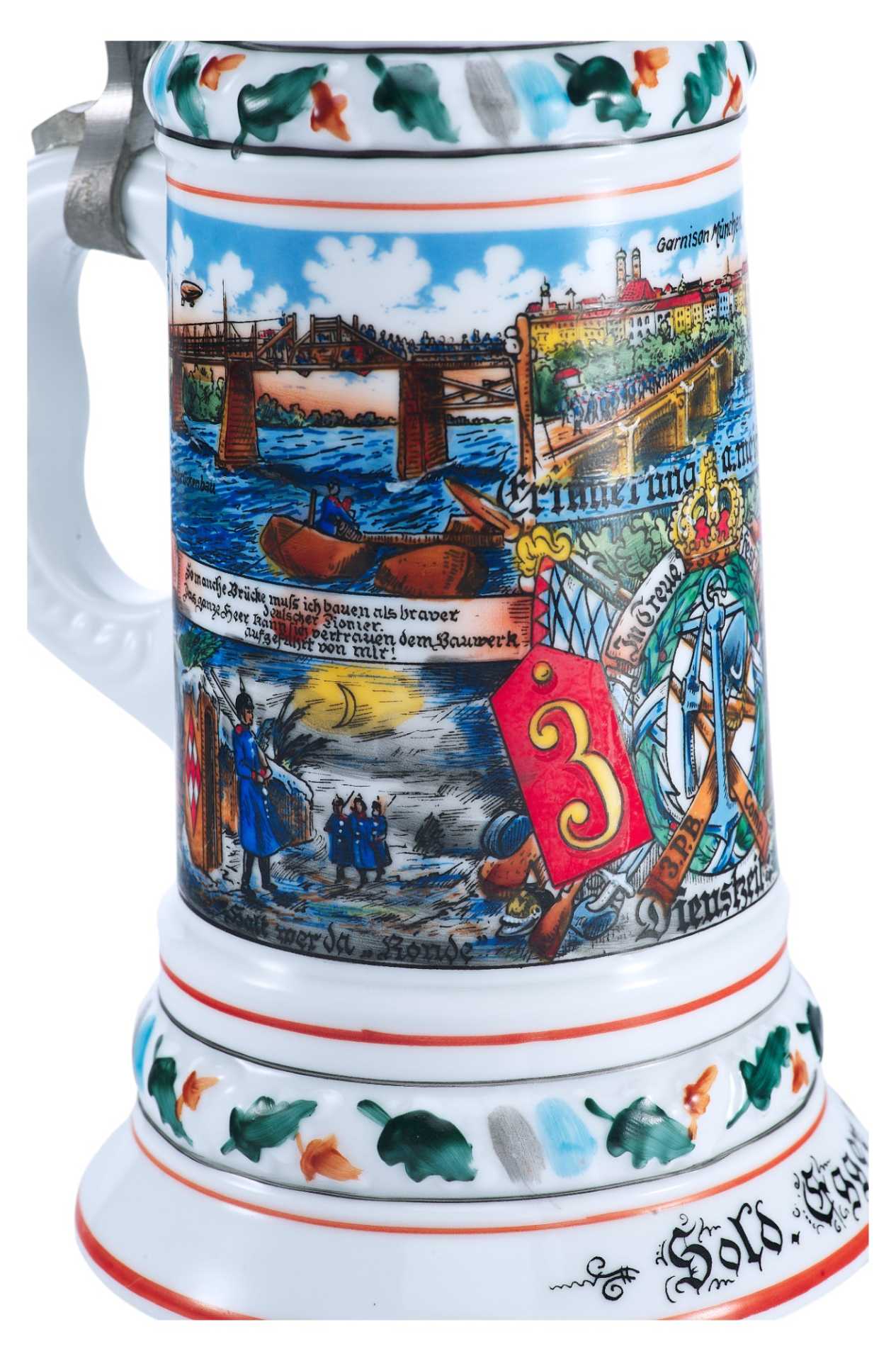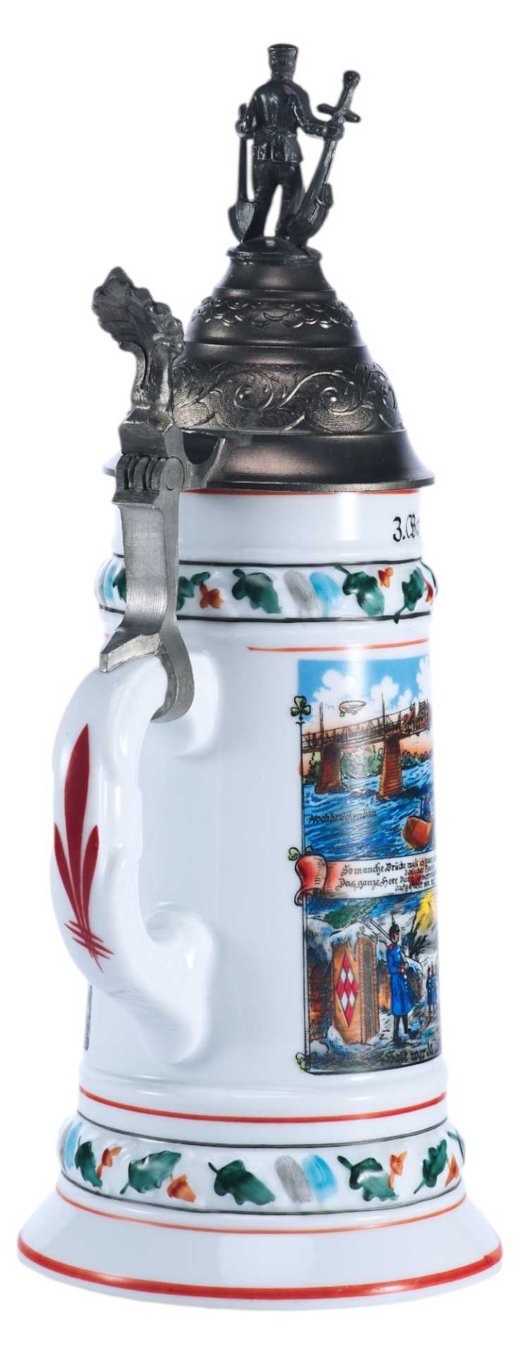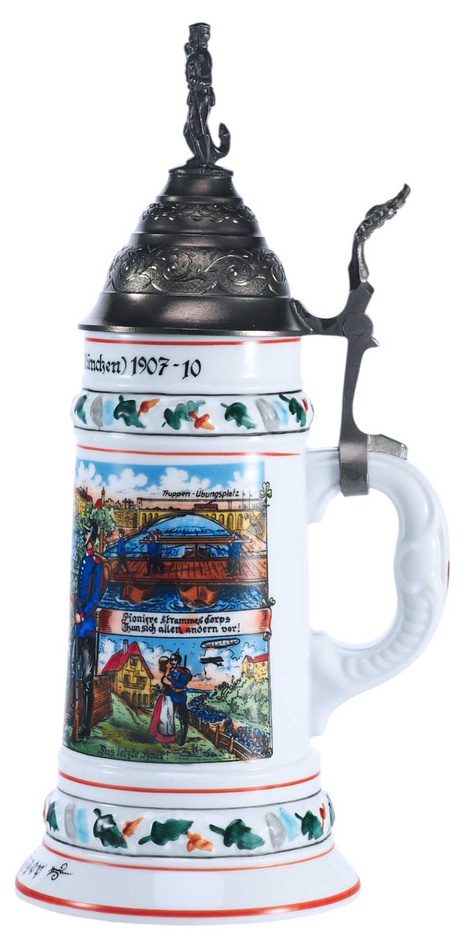 Фарфоровая пивная кружка, распространенного в Германии типа для резервистов с композицией составленной из сцен службы в полку (на данном предмете — в 3-м Баварском инженерном). Крышка и ручка выполнены из оловянного