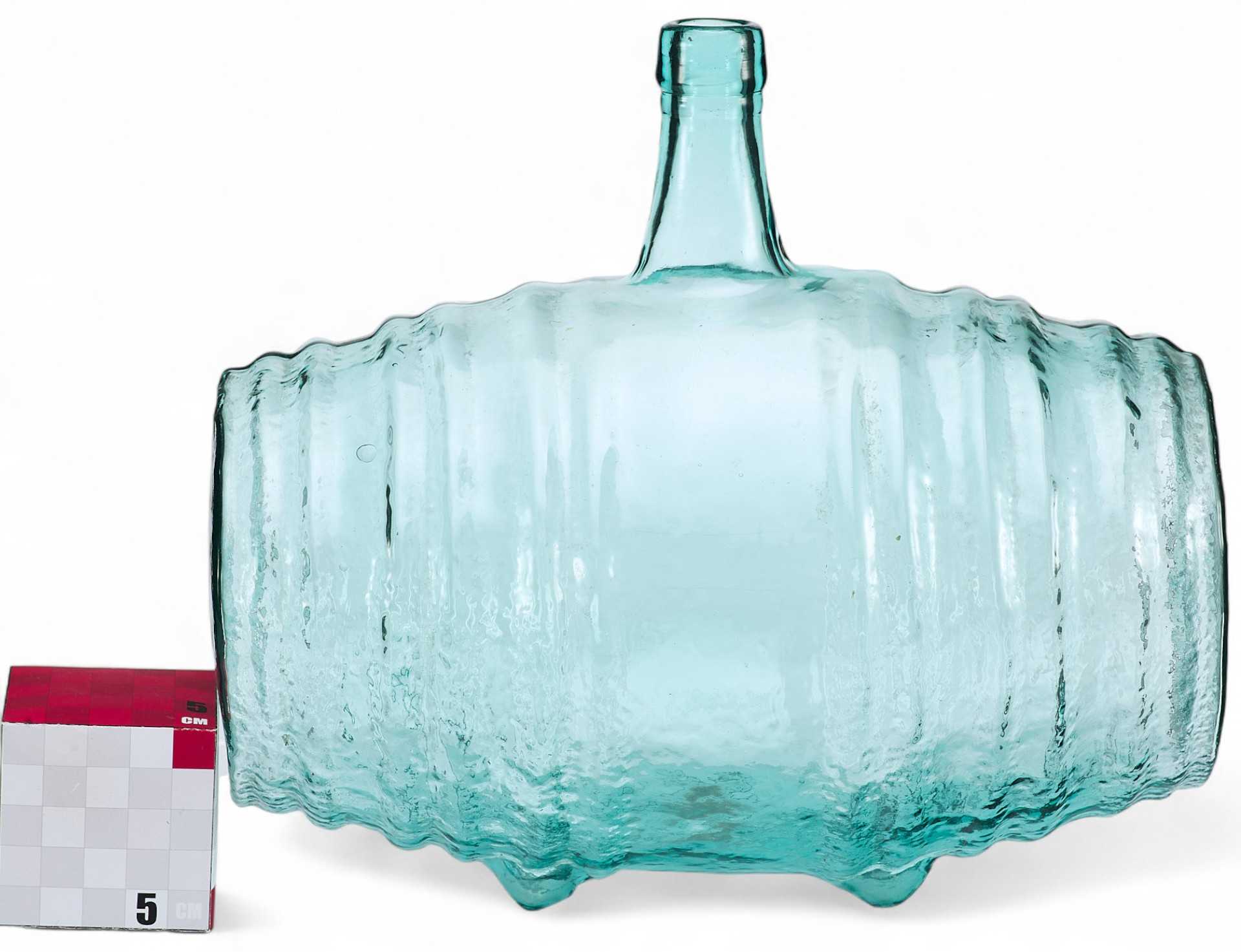 Представленный предмет – необычный водочный штоф из прозрачного бутылочного стекла зеленоватого оттенка, выполненный под влиянием неорусского модерна. Сосуд в форме бочонка, поставленного на бок, завершается стандартным узким горлышком, а снизу поддерживается четырьмя маленькими литыми ножками. Оригинальное оформление при традиционном назначении придает предмету очарование легкого неорусского стиля, стремившегося к возвращению культурного наследия прошлого как в праздничную, светскую, так и в бытовую, повседневную жизнь.