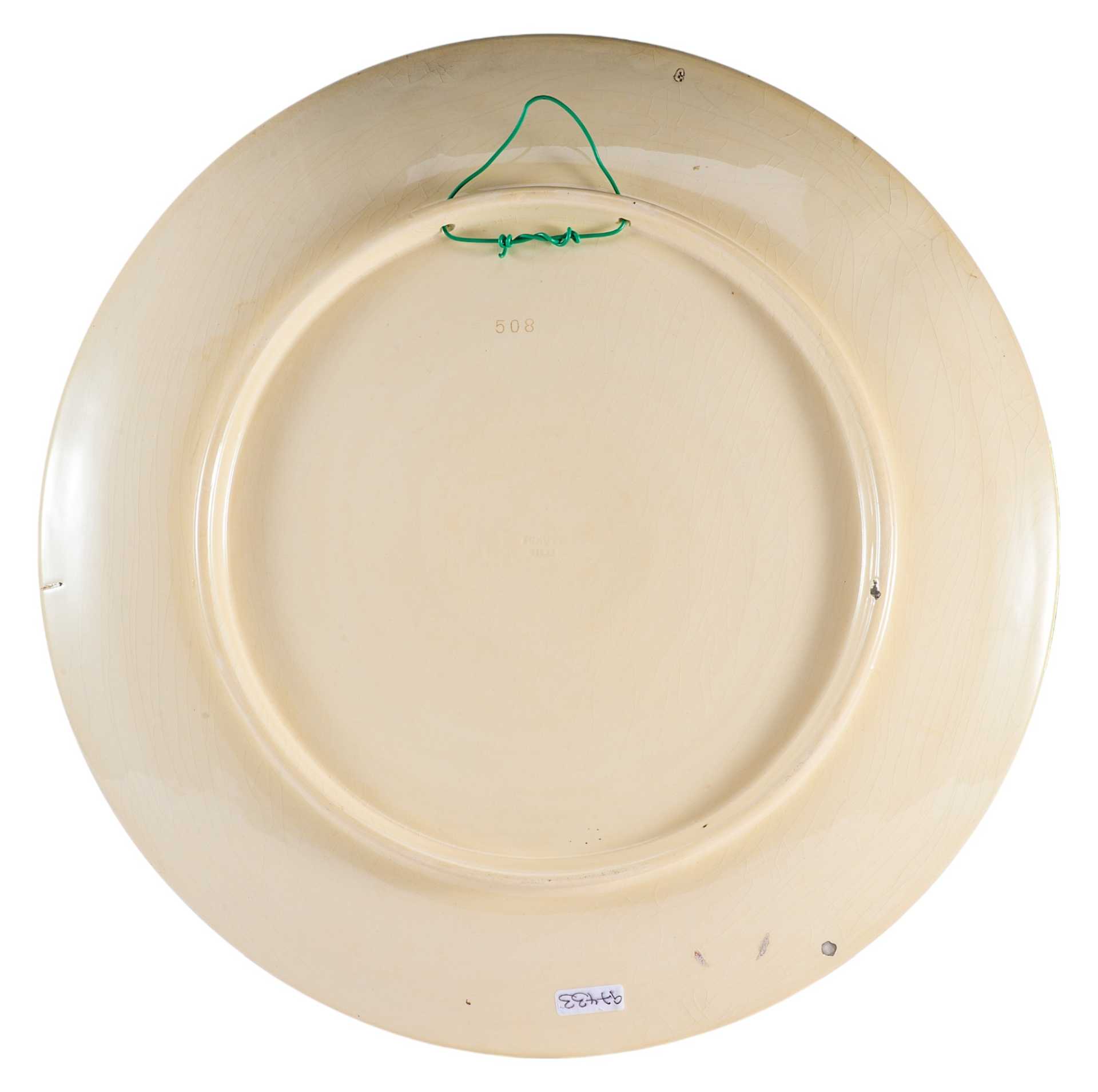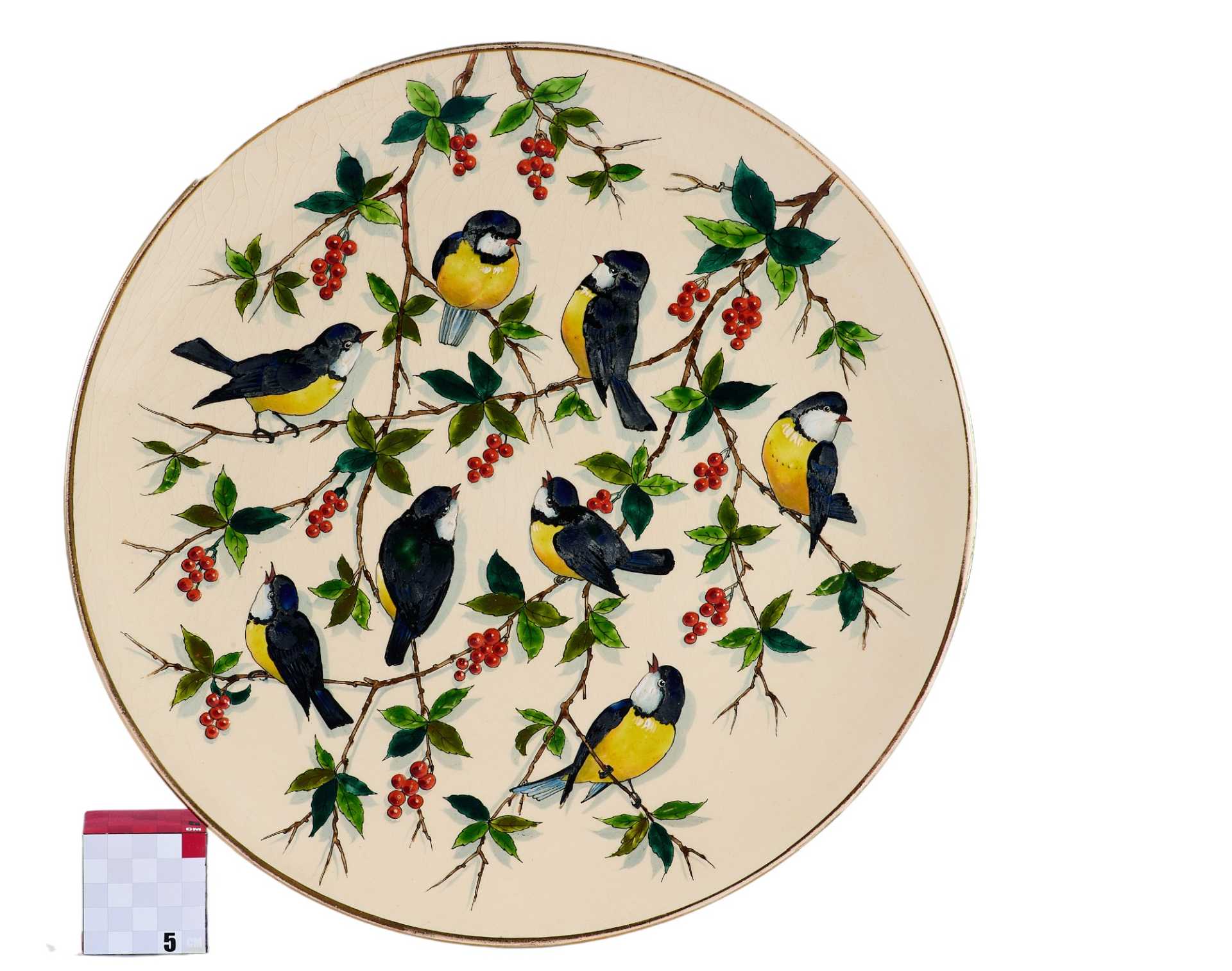 Представлена фаянсовая тарелка с изображением синиц на ветках дерева. Тарелка изготовлена на фаянсовой фабрике братьев Арнольда и Людвига Рихарда Шютцев, о чем говорит клеймо на обороте. Клеймо фабрики соответствует .