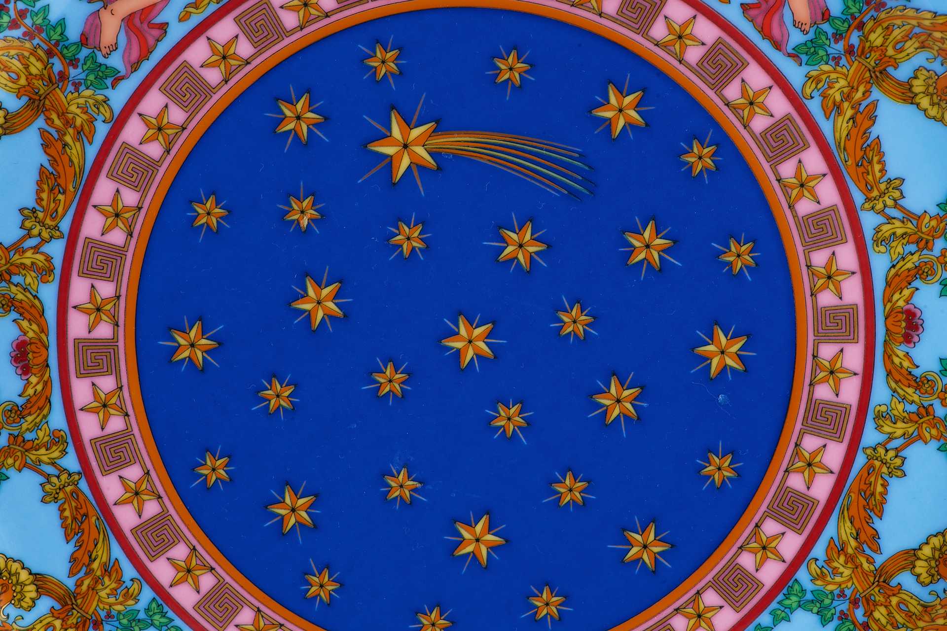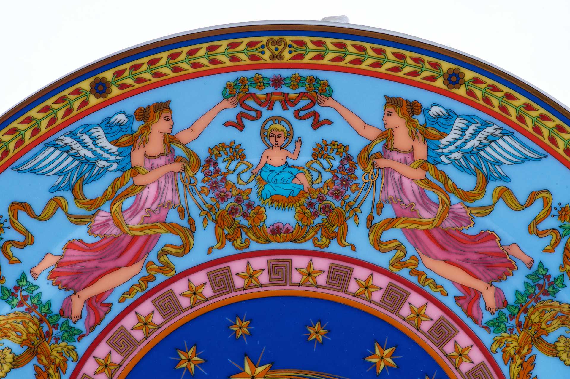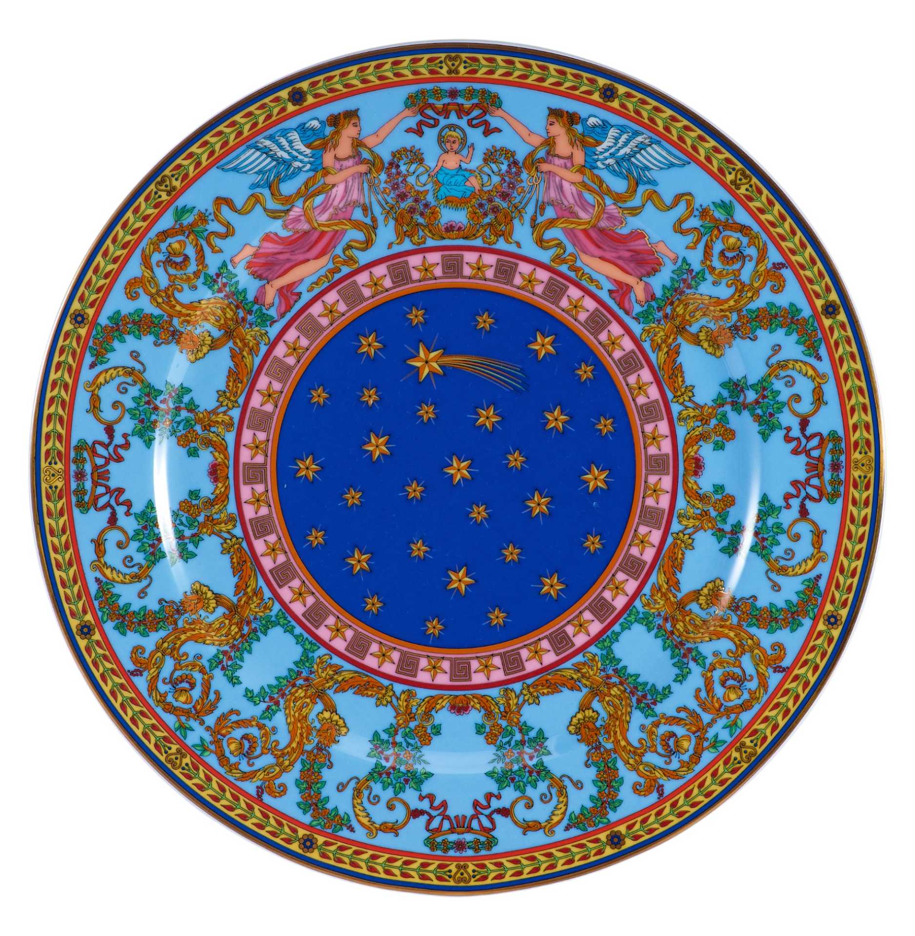 Декоративное панно с изображением звездного неба и Вифлеемской звезды в центре. По периметру-гирлянды цветов на голубом фоне и две фигуры ангелов, возлагающих венок на голову новорожденного младенца-Иисуса. На обратной стороне -две марки Rosenthal Factory и модный дом Versace. А также год выпуска «1997».