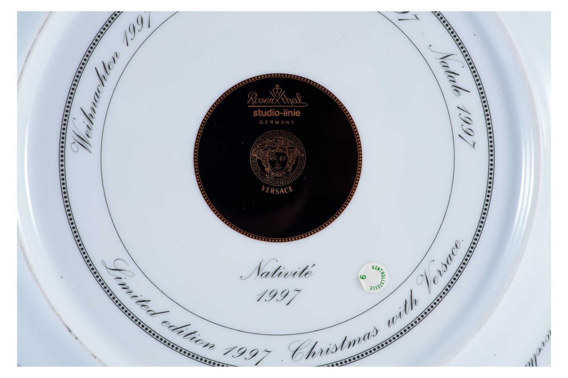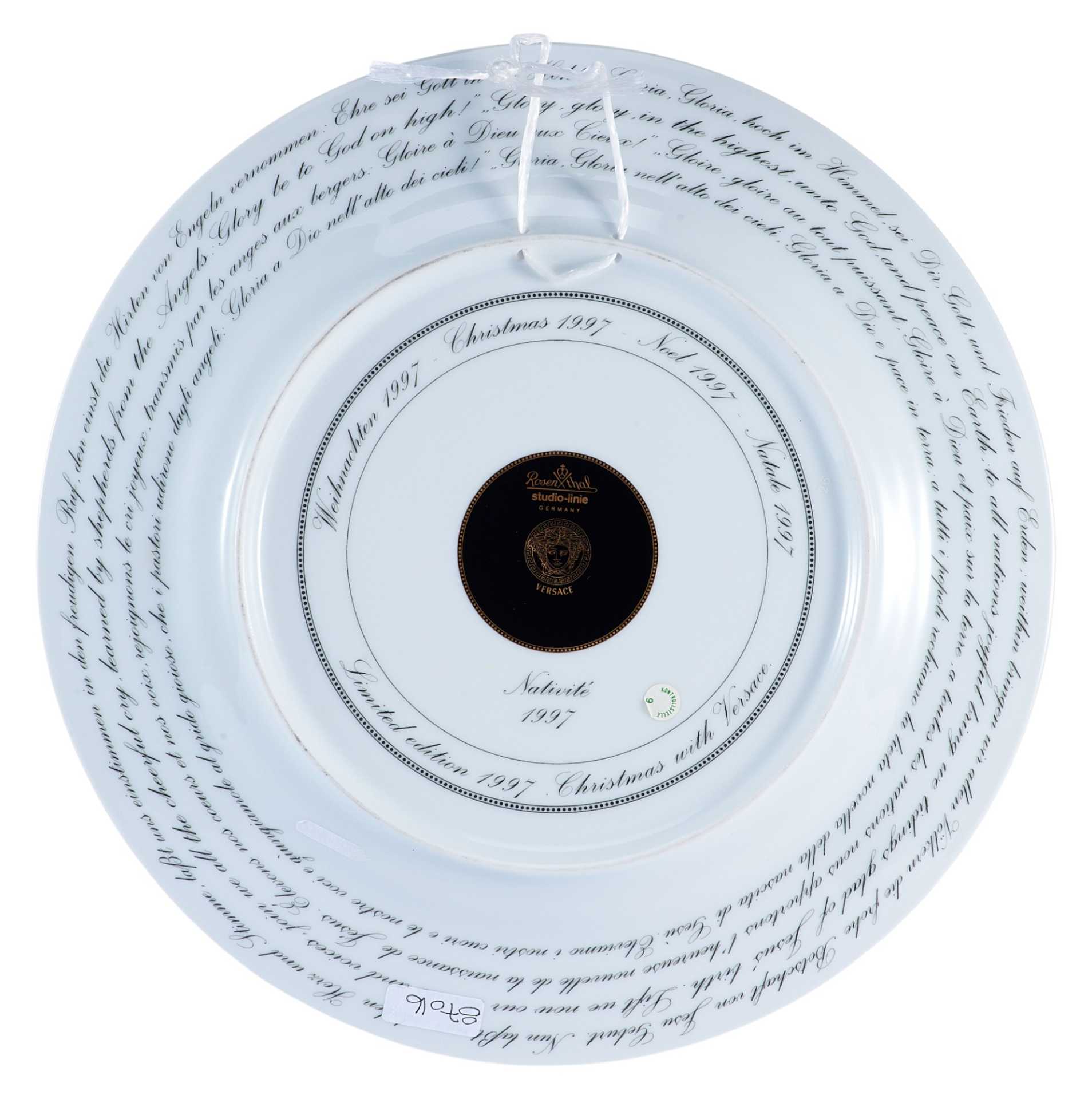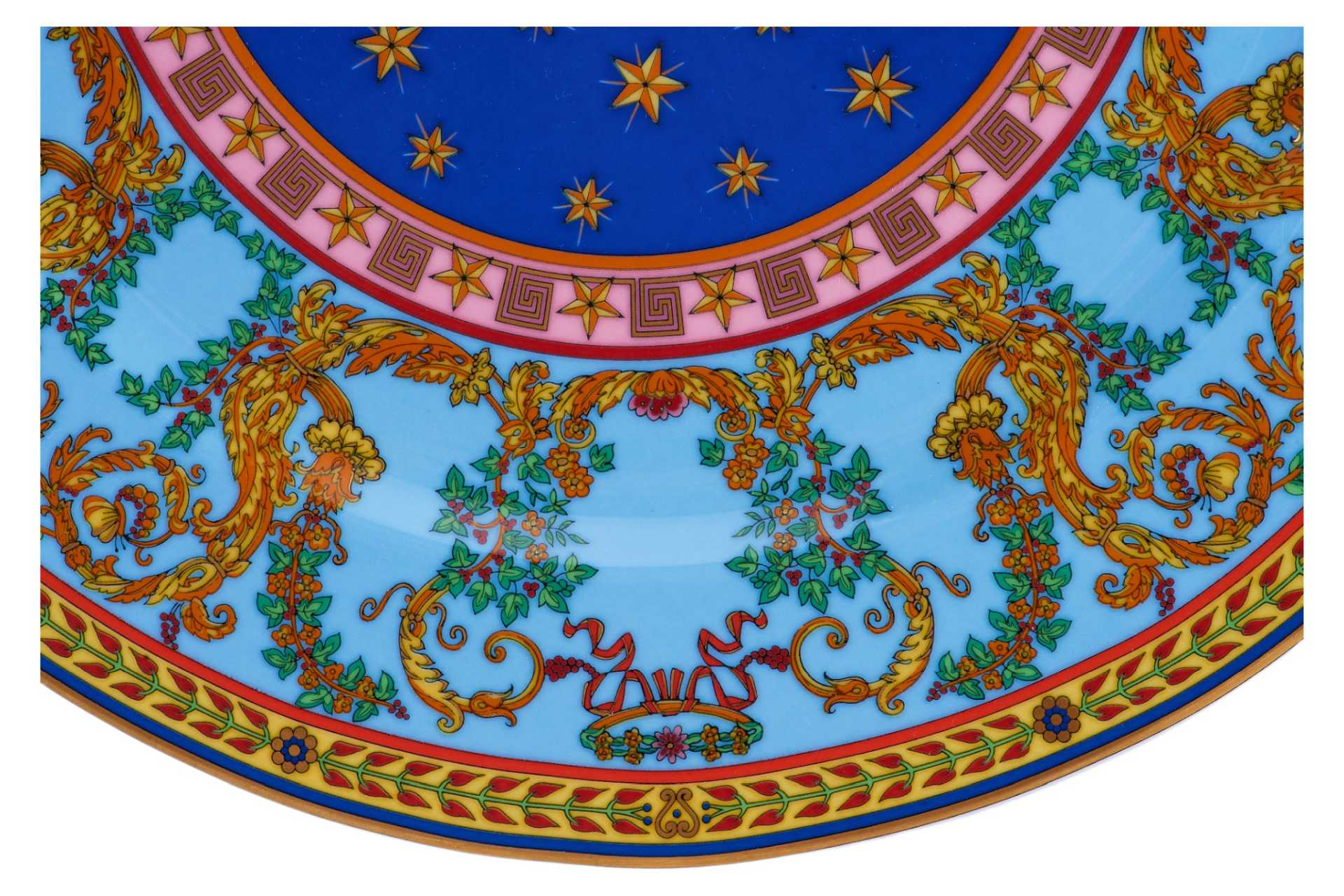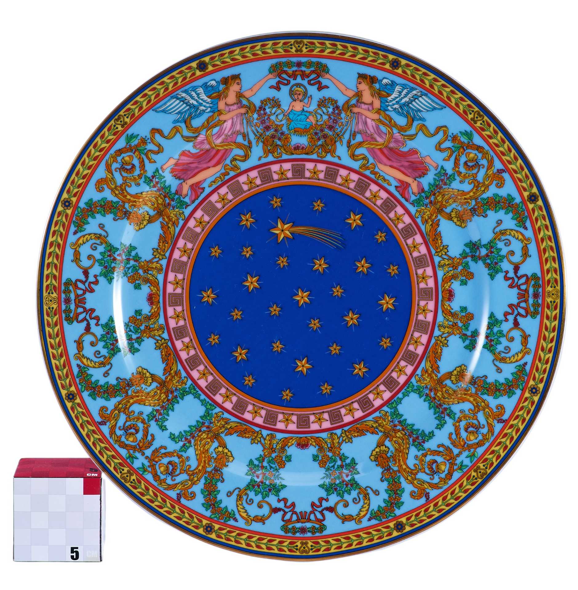 Декоративное панно с изображением звездного неба и Вифлеемской звезды в центре. По периметру-гирлянды цветов на голубом фоне и две фигуры ангелов, возлагающих венок на голову новорожденного младенца-Иисуса. На обратной стороне -две марки Rosenthal Factory и модный дом Versace. А также год выпуска «1997».
