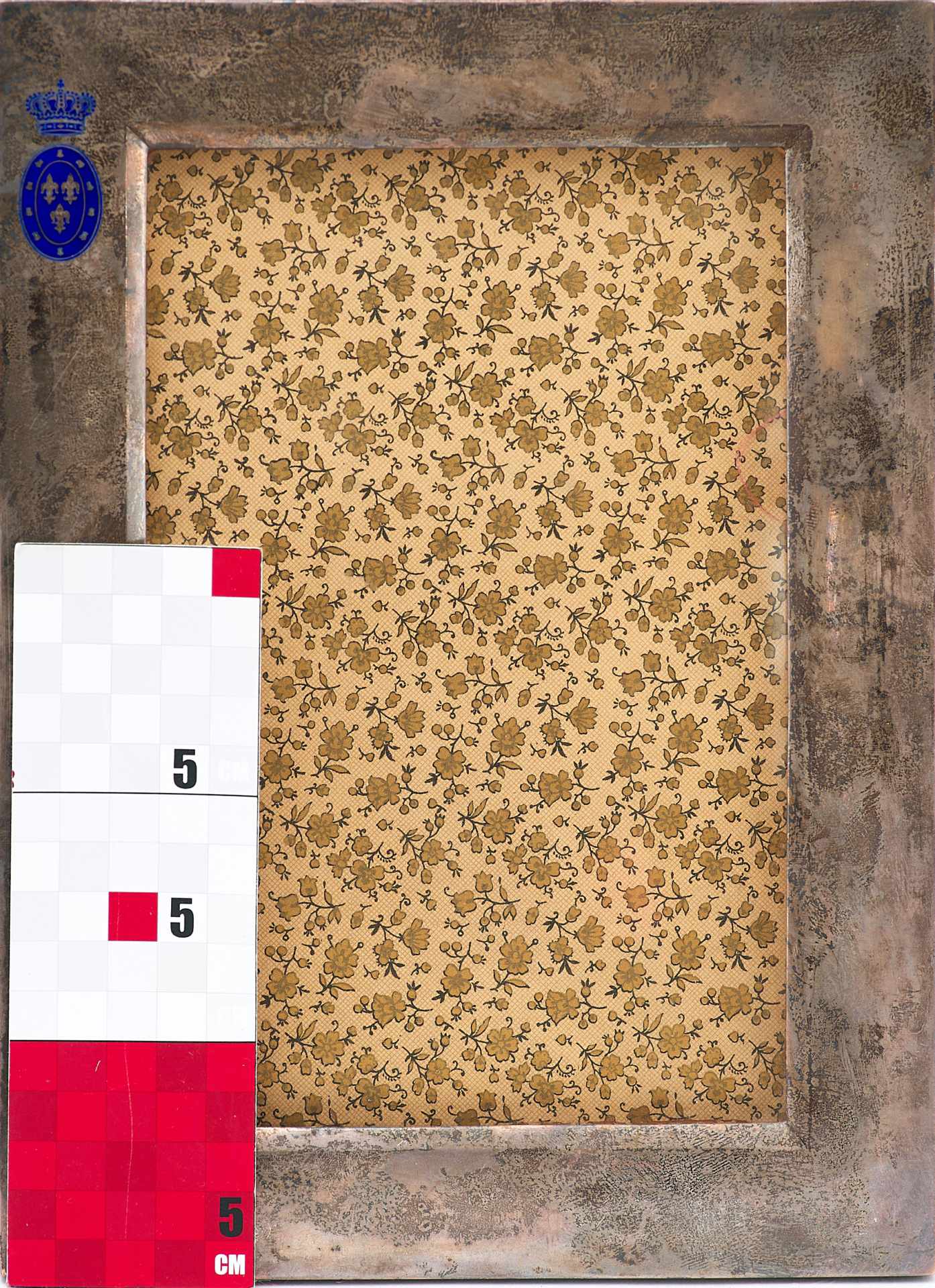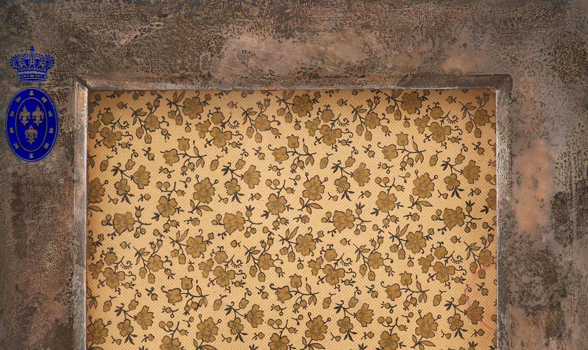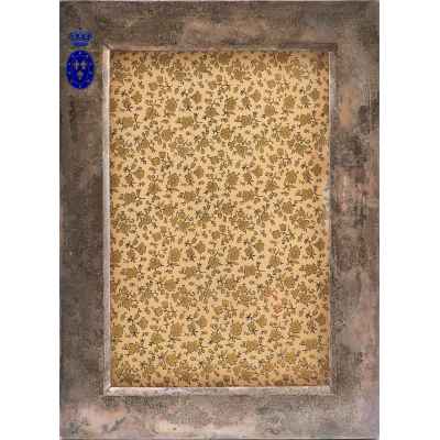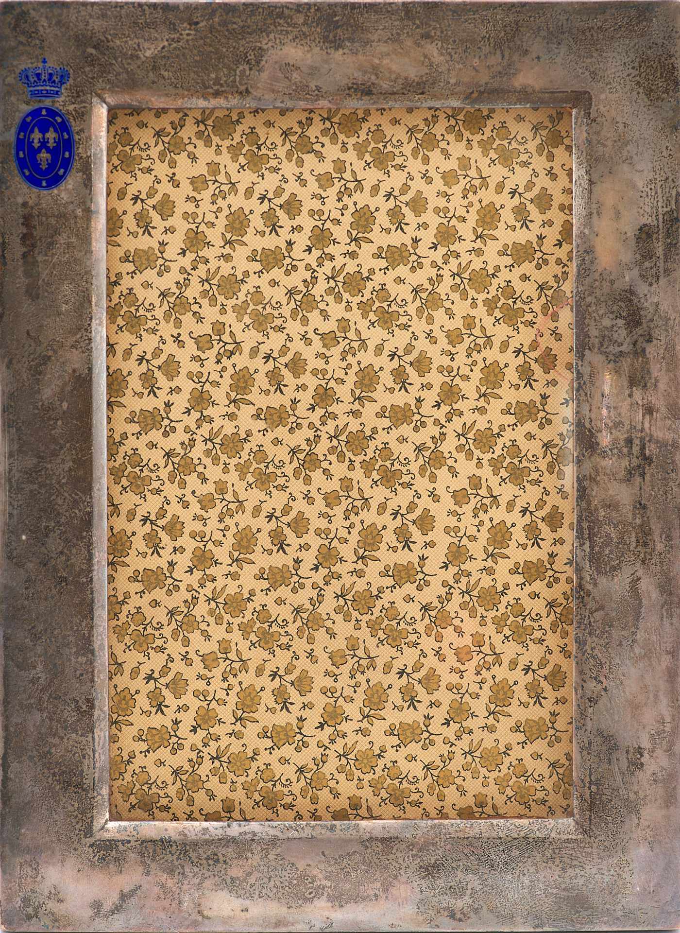 Представлена плоская серебряная рамка для фото с тисненым рельефным рисунком, покрытым синей эмалью, изображающим овальный геральдический щит с тремя французскими лилиями по центру. Щит увенчивает императорская корона.