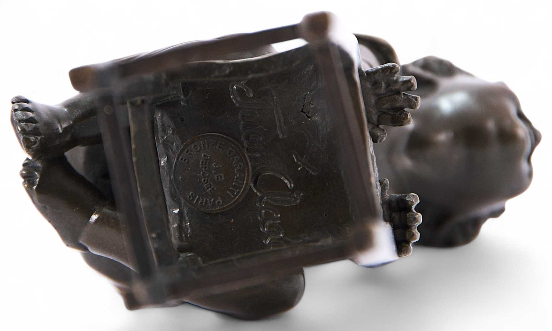 Детская тема была наиглавнейшей в творчестве этого скульптора. На основании скульптуры воспроизведена подпись автора: «Juan Clara». Рядом круглое клеймо стандарта качества: «Bronze Garanti Paris», «J.B DEPOSE». Juan Clara (1875-1958)