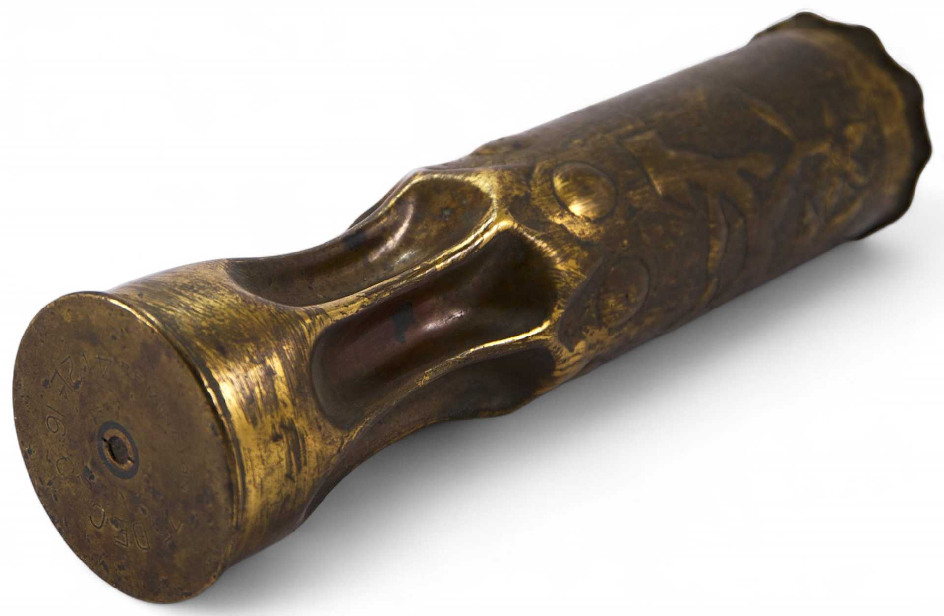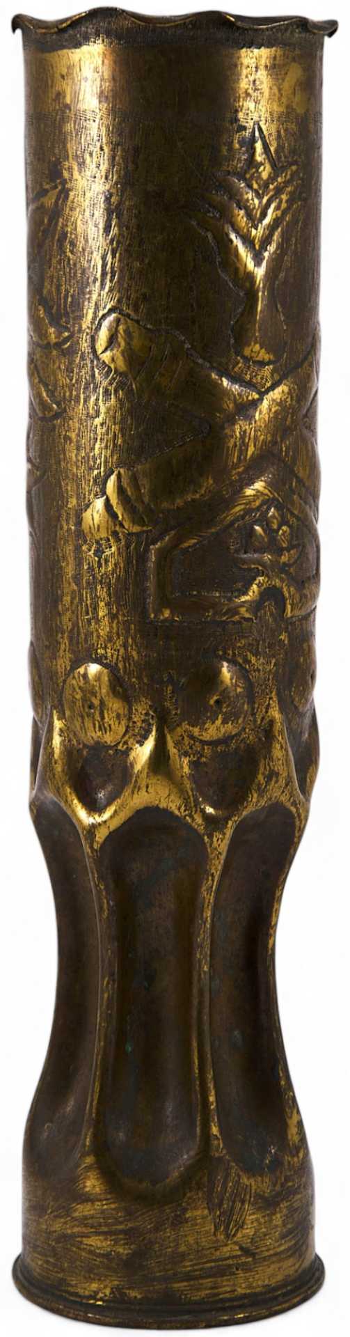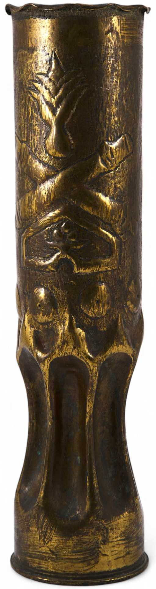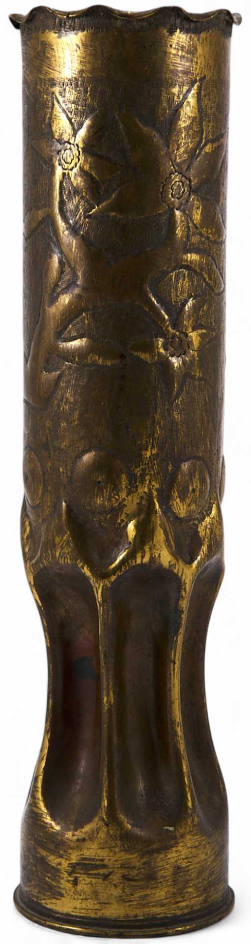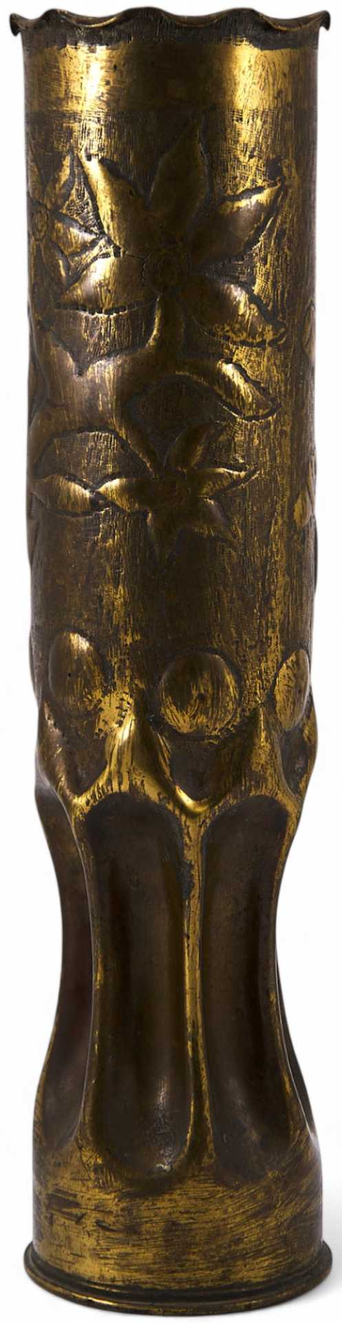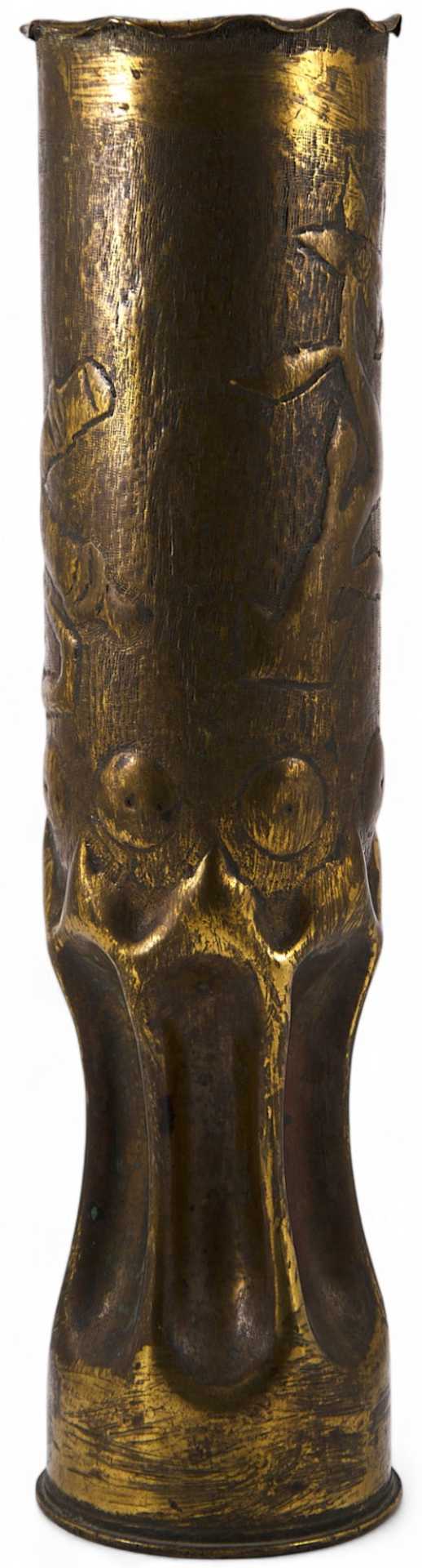 Ваза, изготовленная из гильзы от боевого артиллерийского снаряда. Поверхность вазы украшена чеканкой, изображающей две перекрещенных пушечных стволІ», бомбу и цветок чертополоха (символ страдания). Подобные вазы, изготовленные из гильз снарядов разных калибров, распространены в европейских частных коллекциях.