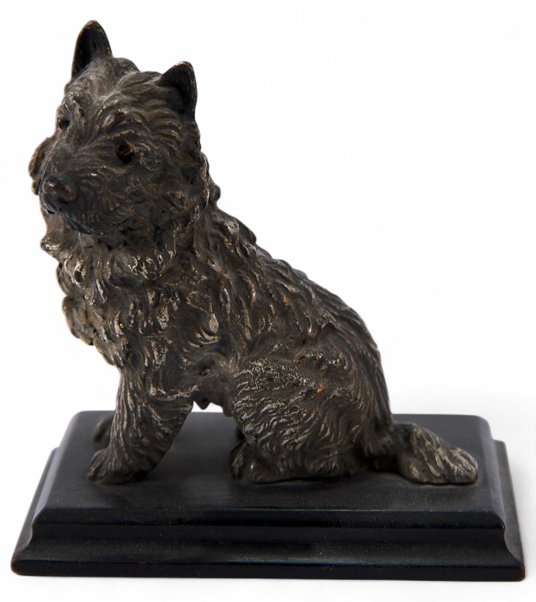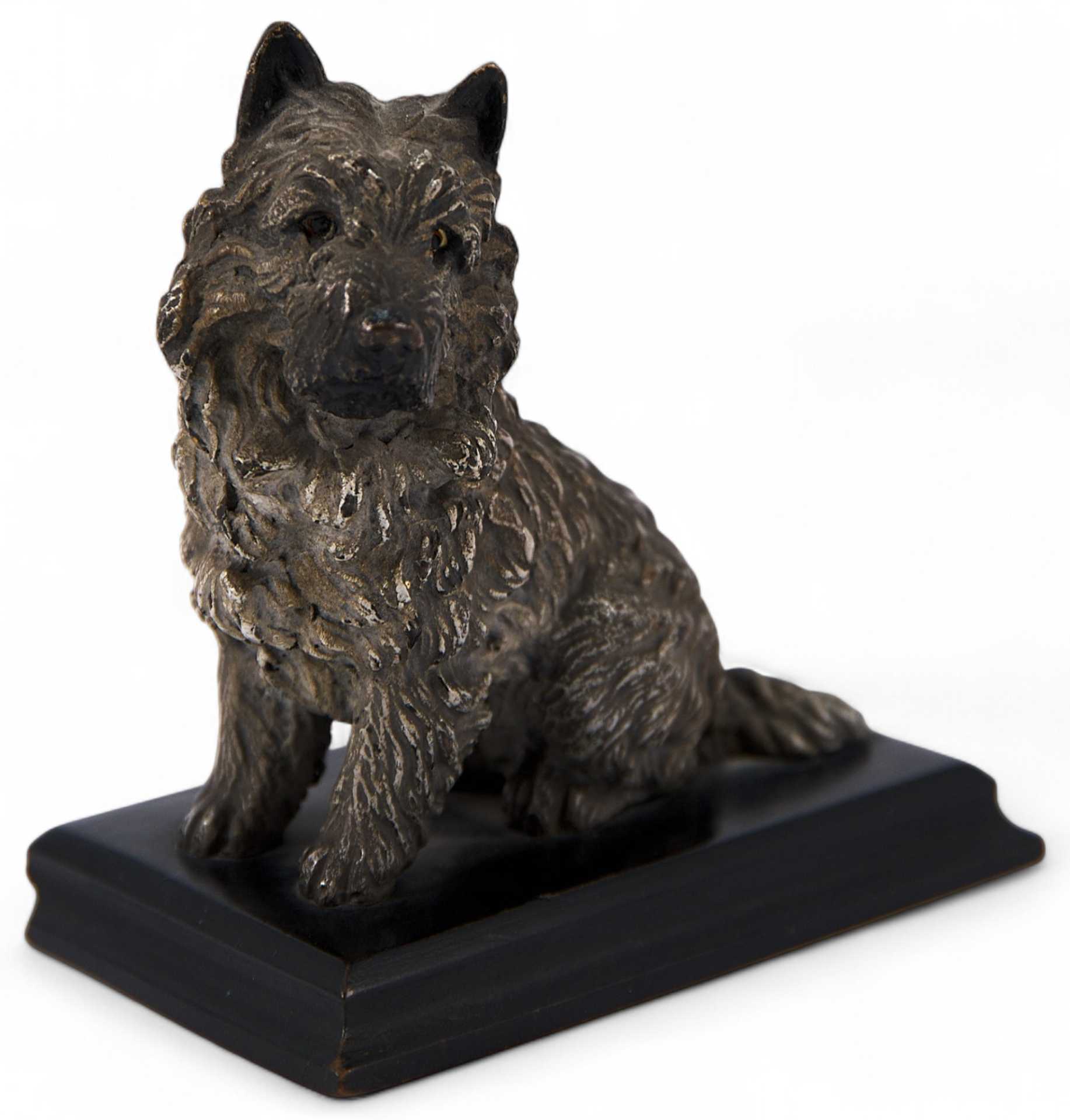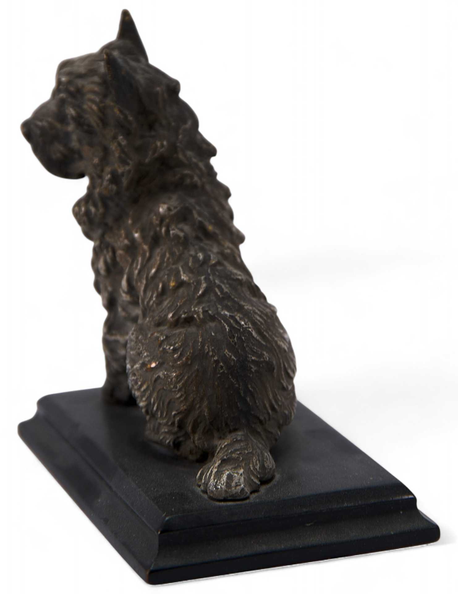 Представленная скульптура выполнена в анималистическом жанре и изображает сидящую собаку породы терьер. Собака реалистична, скульптором умело передано ощущение длинной, волнистой и мягкой шерсти животного, удачно выбрана поза: голова собачки повернута в сторону, она выглядит заинтересованной – это придает образу внутренней естественности, внешне же реалистичность образа подчеркнута окрасом. Кабинетная скульптура подобного рода пользовалась большим