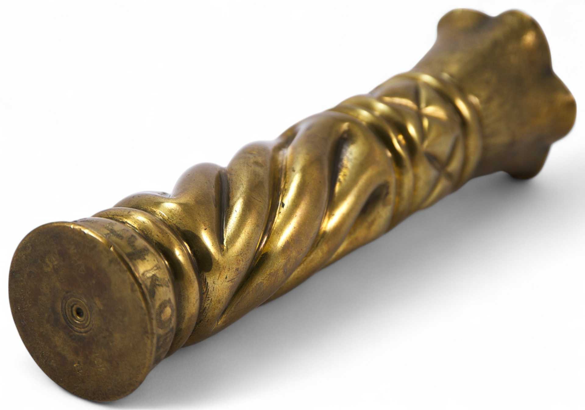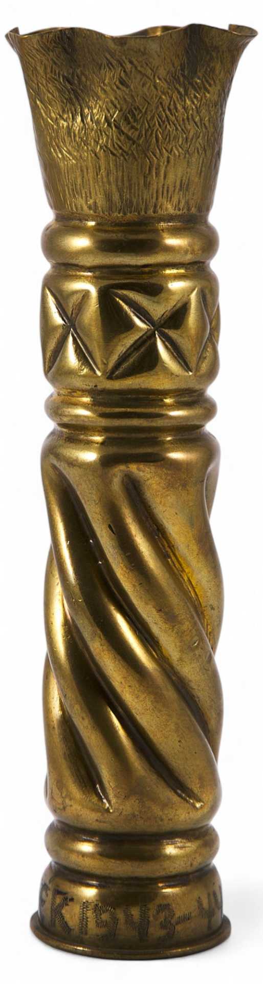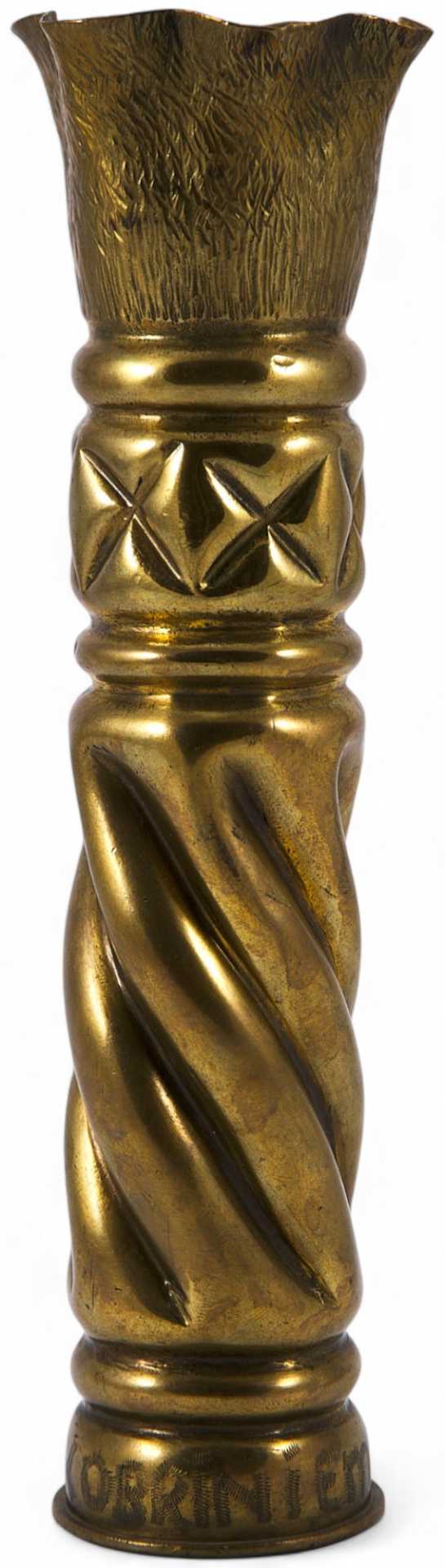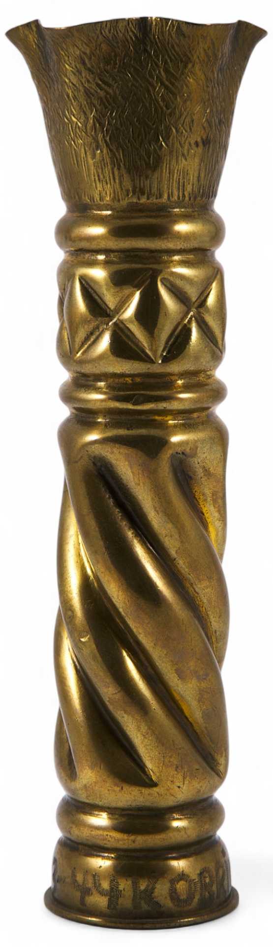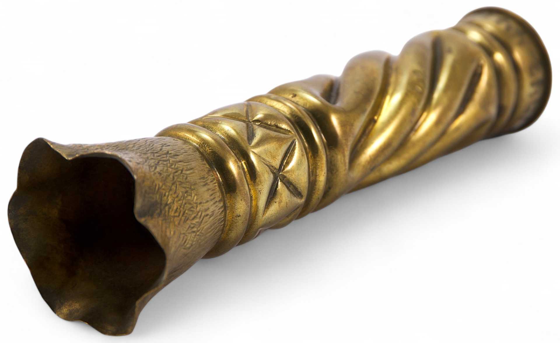 Представлена ваза в виде горящего факела, изготовленная из гильзы от боевого артиллерийского снаряда. Подобные вазы, изготовленные из гильз снарядов разных калибров, распространены в европейских частных коллекциях.
