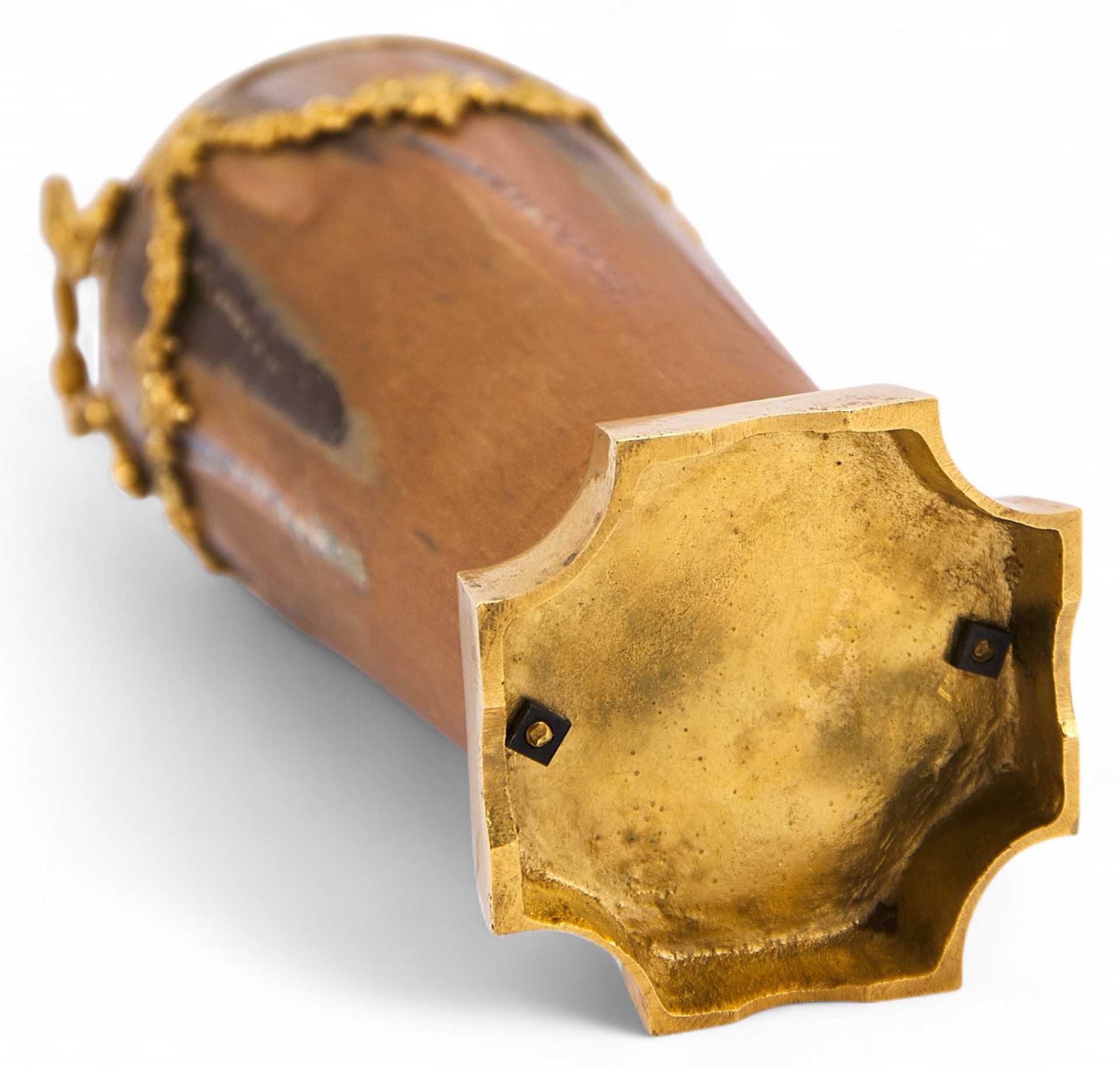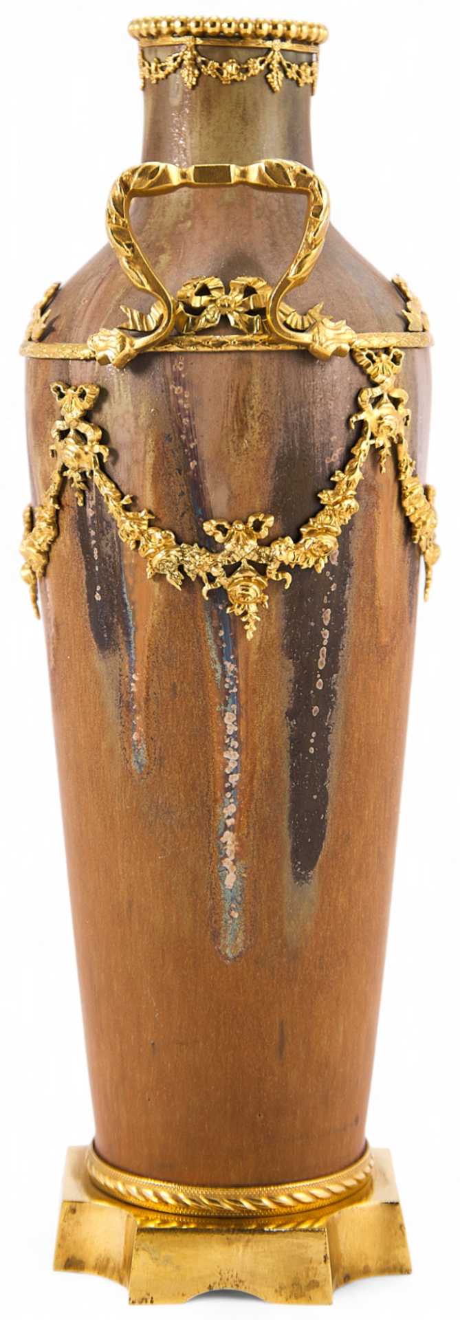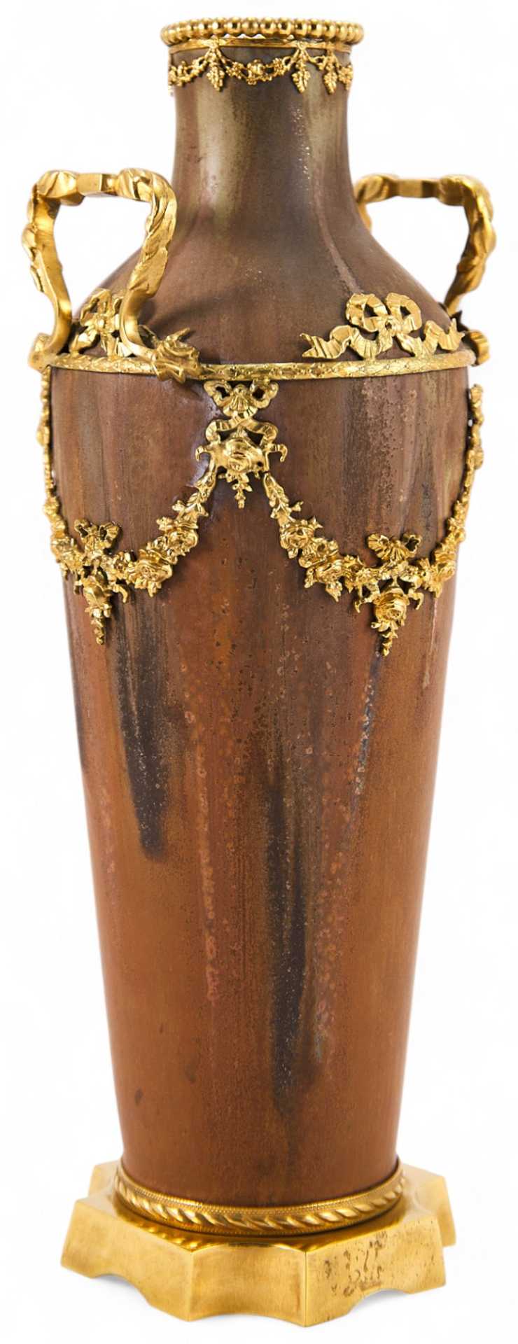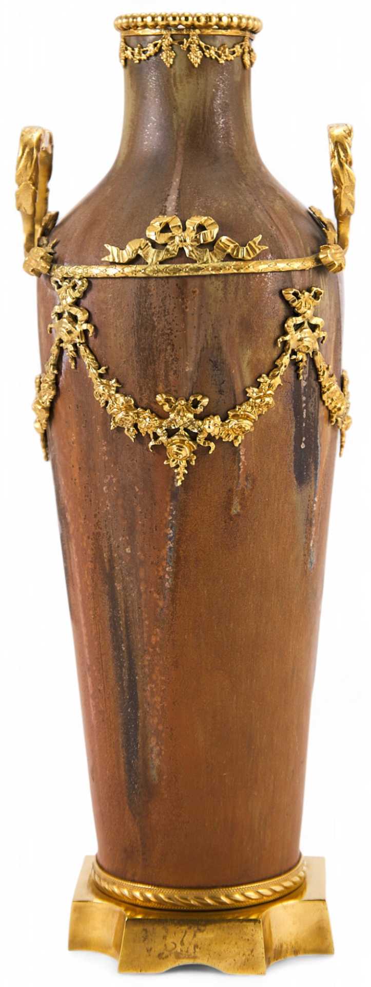 Ваза в форме вытянутой амфоры выполнена из керамики, оформлена бронзой. Из бронзы выполнено квадратное основание с вырезанными углами, накладка на тулово в виде цветочных гирлянд, украшенных бантами, фигурные ручки и кант на горлышке вазы. Стилистически предмет можно отнести к интернациональному модерну, популярному на рубеже XIX — XX веков. Изделие выполнено на высоком техническом уровне и является прекрасным образцом органичного слияния различных материалов и техник в декоративноприкладном искусстве стиля модерн. Модерн (от фр. modeme — новейший, современный) или Ар Нуво (Art Nouveau) — стиль в европейском и американском искусстве конца 19 в. — 1910-х гг. Отличается динамикой и текучестью форм, виртуозной игрой крупных или же хрупких линий и силуэтов. Модерн стремился стать единым синтетическим стилем, в котором все элементы из окружения человека были выполненные в одном ключе. Вследствие этого в этот период возрос интерес к прикладным искусствам: дизайну интерьеров, керамике, книжной графике. Отличительными особенностями техники модерна являются: отказ от прямых линий и углов в пользу более естественных, натуральных линий. Модерн стремился сочетать художественные и утилитарные функции создаваемых произведений, вовлечь в сферу прекрасного все сферы деятельности человека.