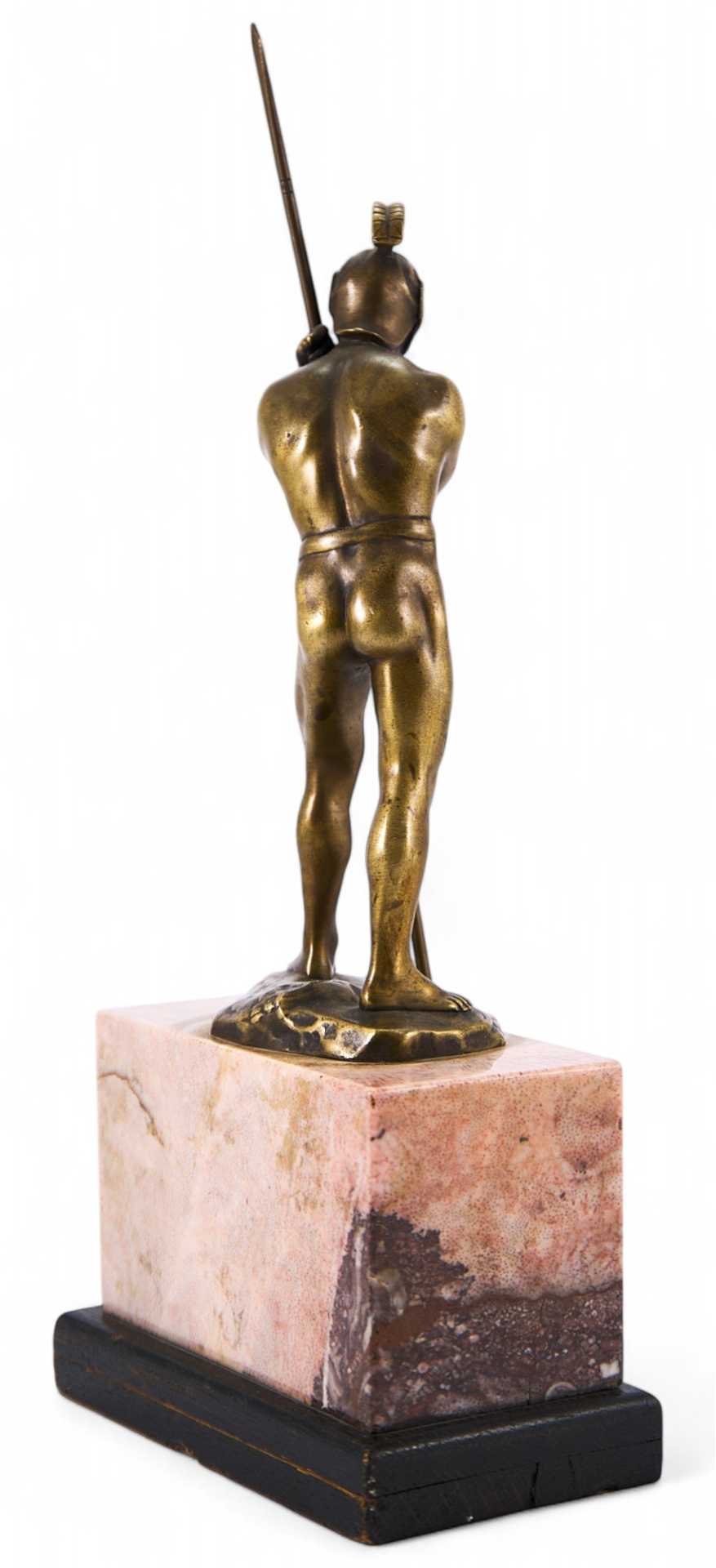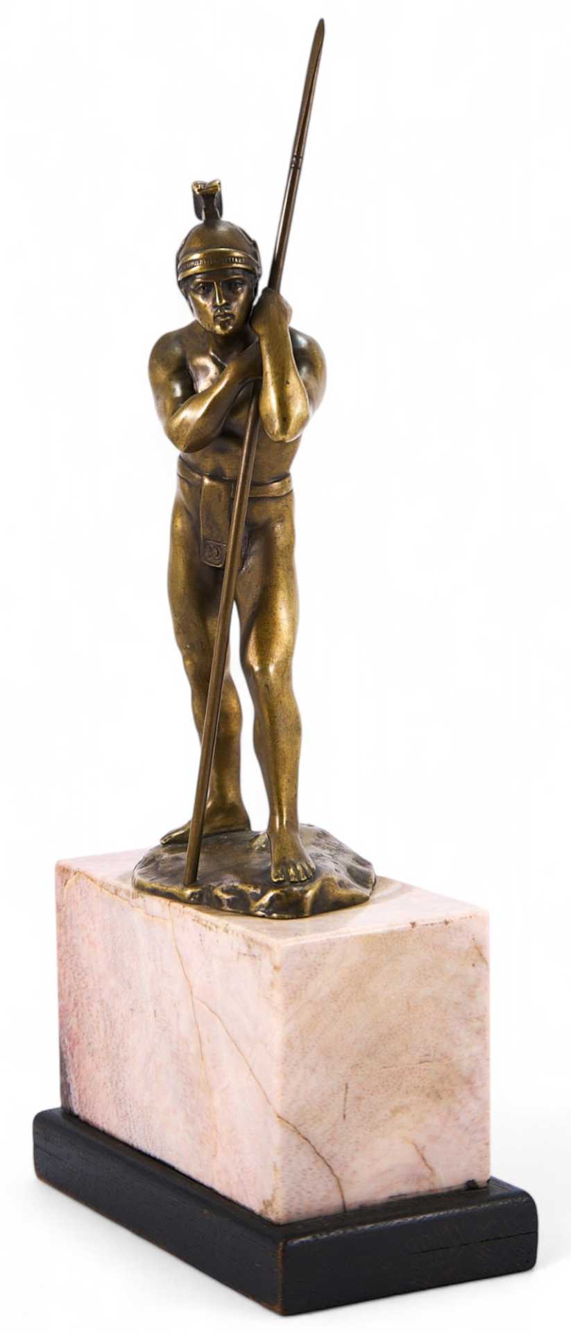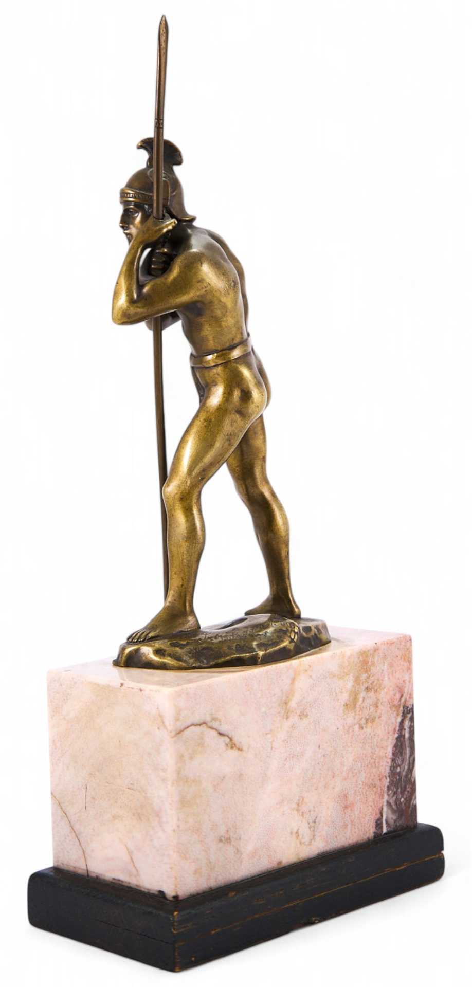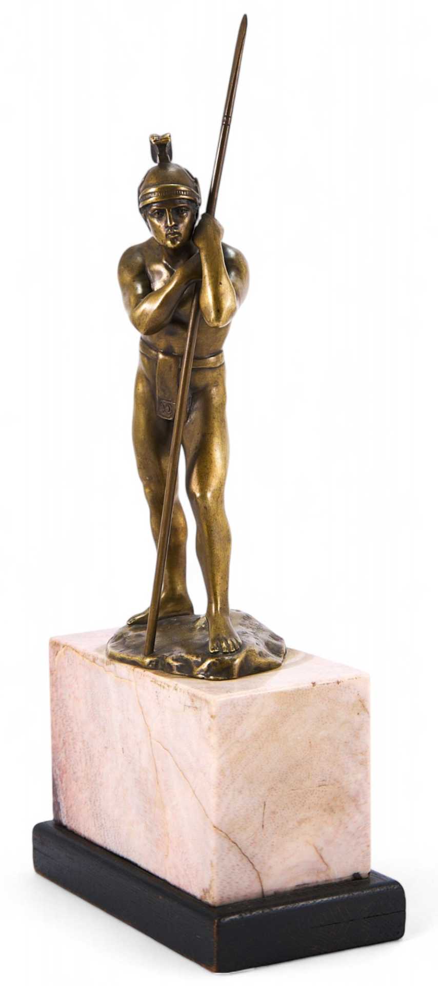На скульптуре присутствует авторское клеймо (вдавлено в массу изделия): «Schmidt». Скульптурная композиция изображает античного воина, опирающегося на копье и смотрящего вдаль. Фигура полуобнажена —из облачения присутствуют лишь шлем и набедренная повязка, что говорит о стремлении автора показать не столько историческую значимость, сколько идеальную красоту тела античного воина.