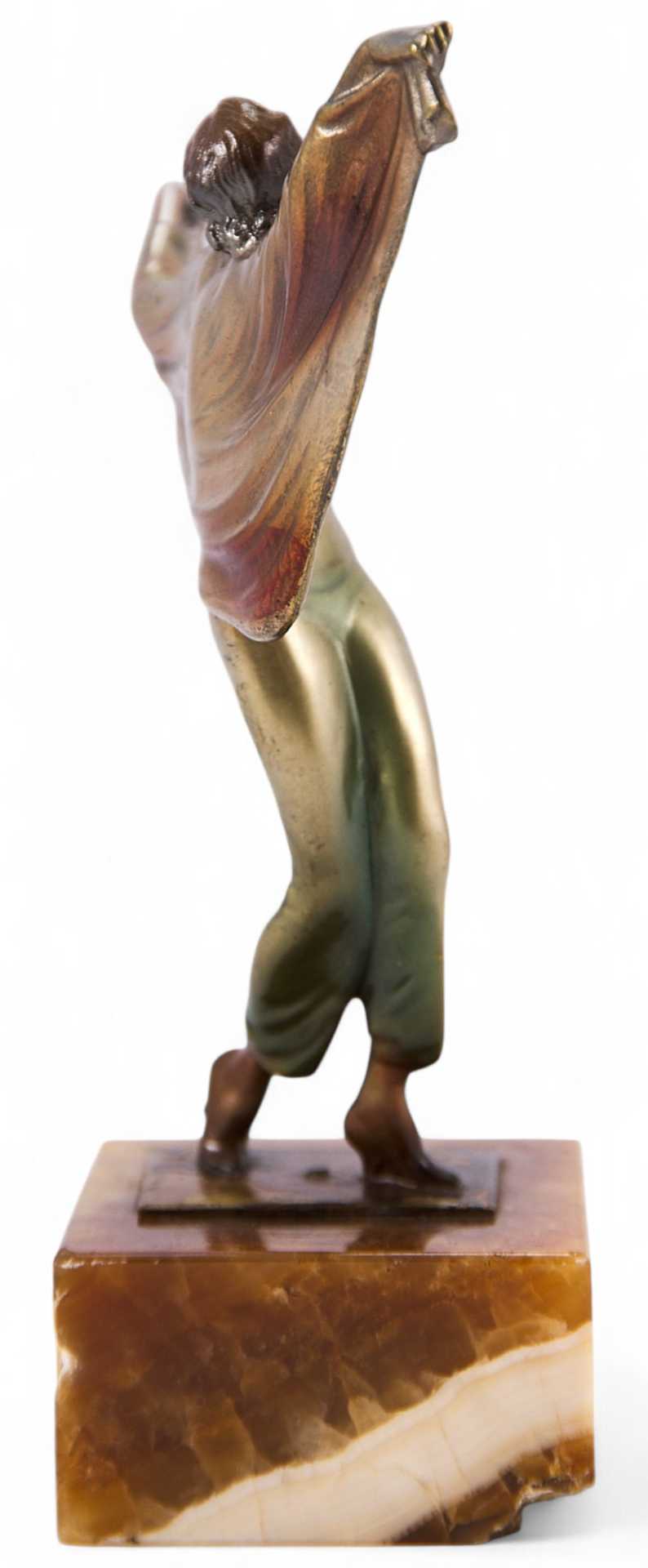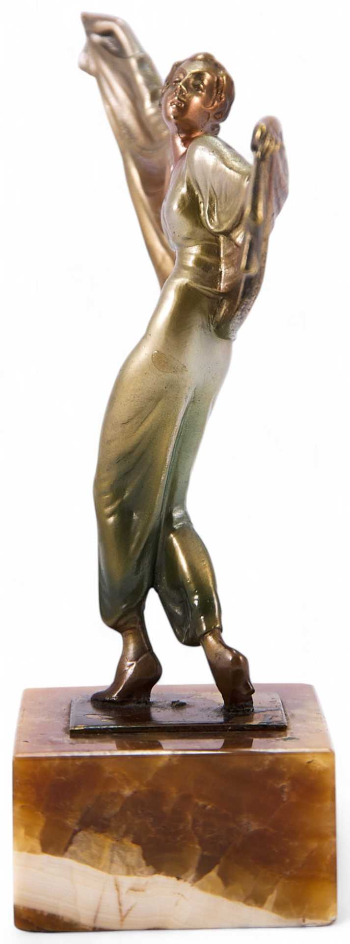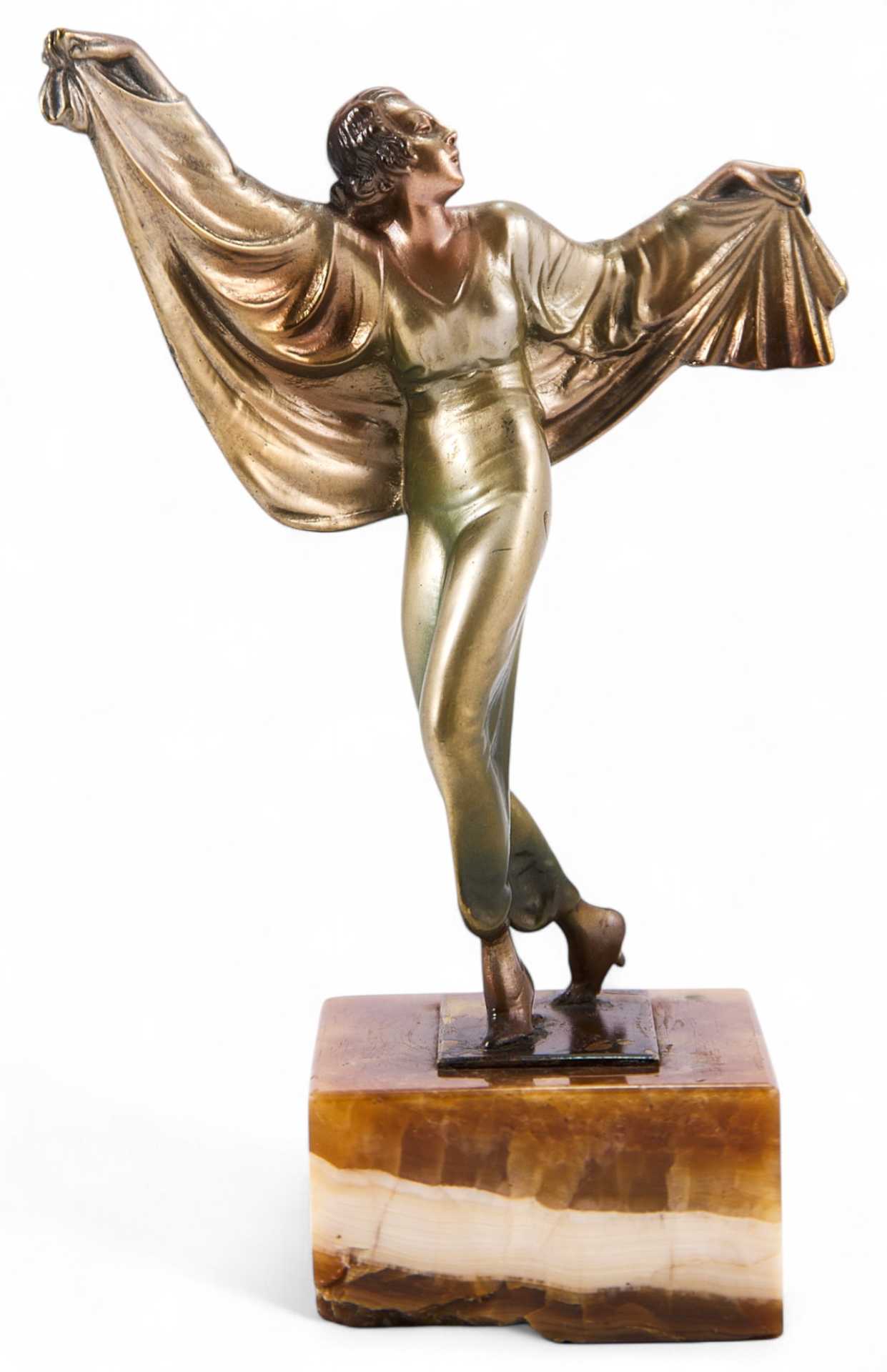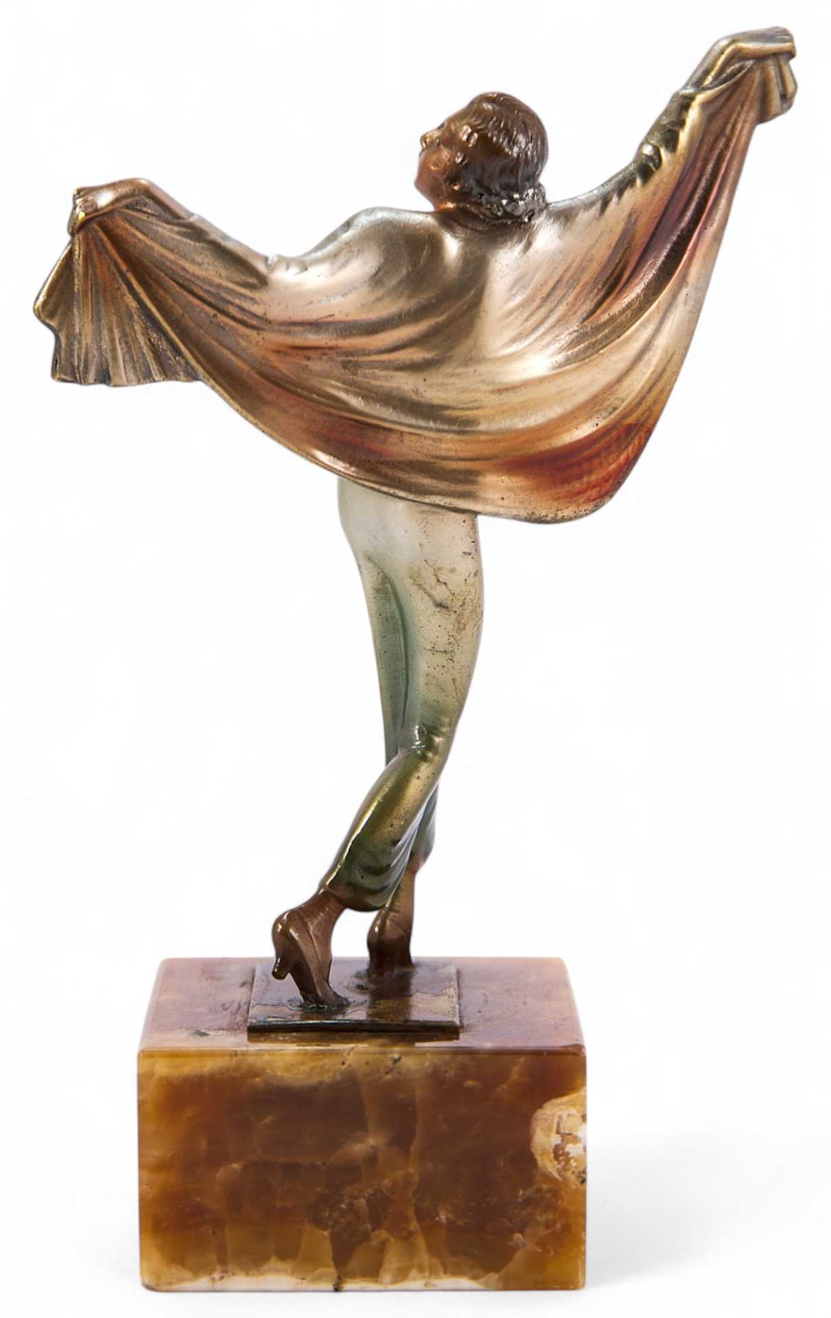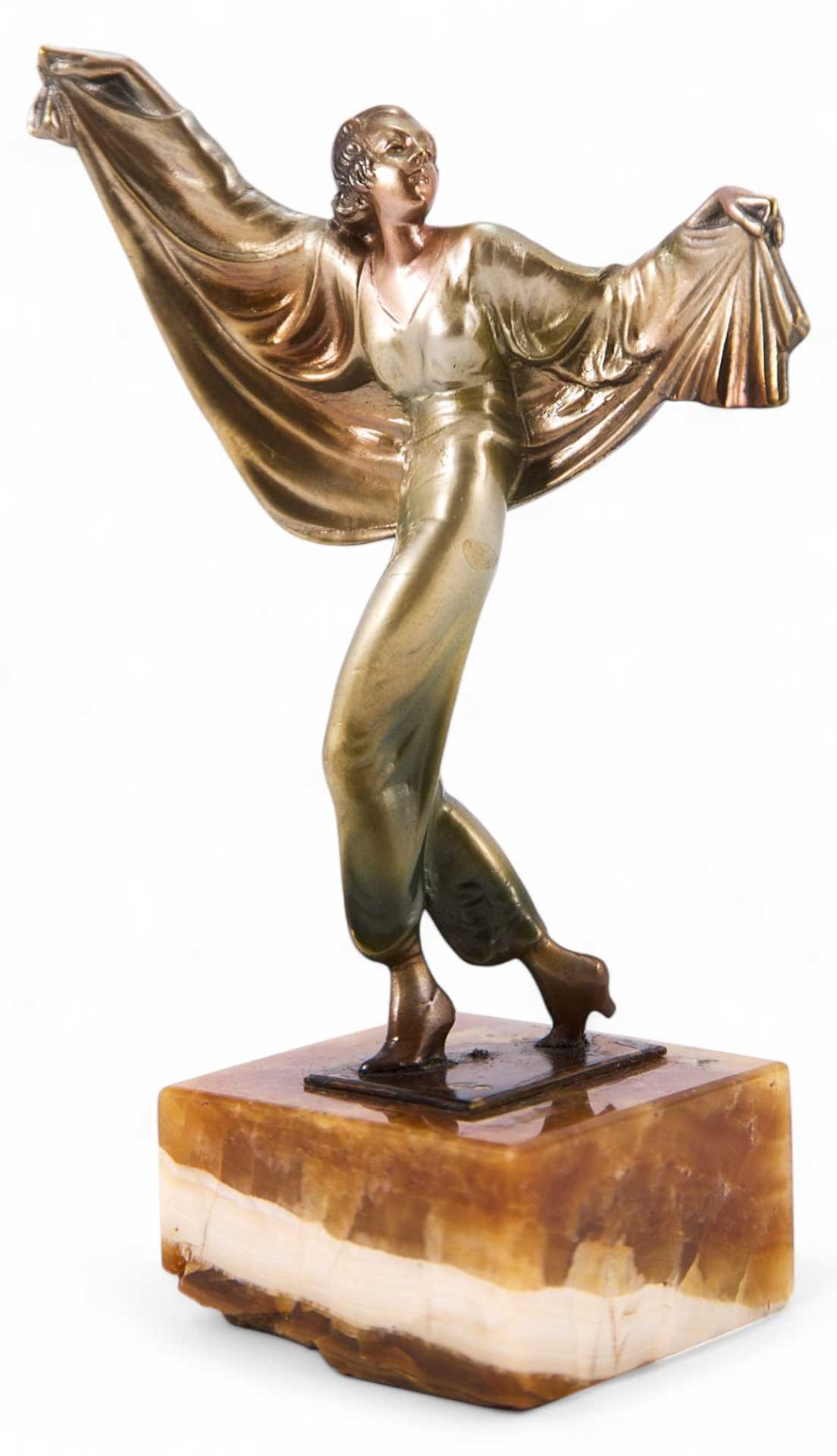 Скульптура танцующей дамы, одетой в оригинальное платье с большими рукавами, находящаяся на подставке из бразильского оникса. Скульптура представляет собой типичный пример мелкой пластики 1920-1930-х гг. довольно популярной в Европе и получившей название в широких кругах искусствоведов и коллекционеров — «венская бронза». Венскую бронзу — скульптурную миниатюру, анималистику, небольшого размера жанровые композиции в духе «ориенталь», «кабинетную» эротическую бронзу «с секретом» — искренне любили и коллекционировали самые широкие слои населения с начала ее производства в Австрии, с середины XIX века. Раскрашенные латунные скулъптурки зверей, людей, растений и даже бабочек, жуков, мушек или кузнечиков —все эти сувенирного характера предметы, из которых можно было составить очень потешные жанровые сценки, являлись во второй половине XIX века актуальными предметами для украшения домашнего быта. Знаменитая во всем мире, несмотря на свой малый размер, и весьма не дешевая венская мелкая пластика часто преподносится в качестве дорогого престижного подарка. Особенно ценятся подписные изделия венской бронзы — с авторской подписью и клеймами известных австрийских производителей, таких как Берман и Бергман, Петр Терещук и Йозеф Лоренцль. В венской камерной пластике наиболее ценятся изделия не столько в стилевой манере европейской