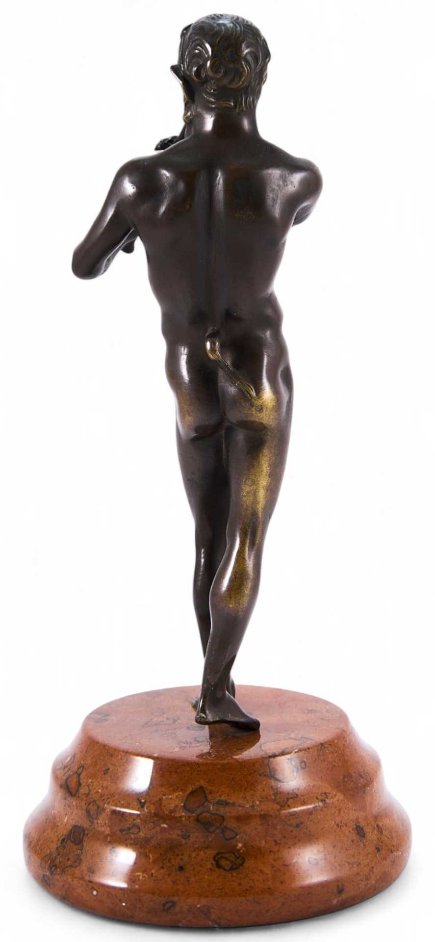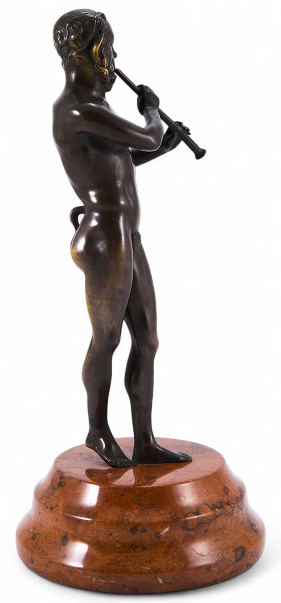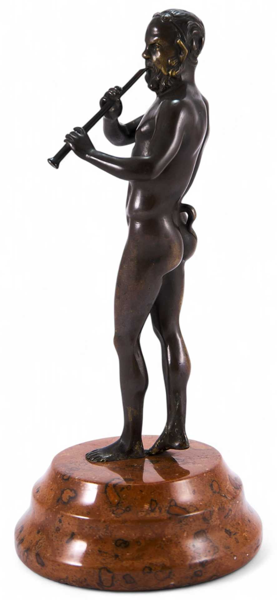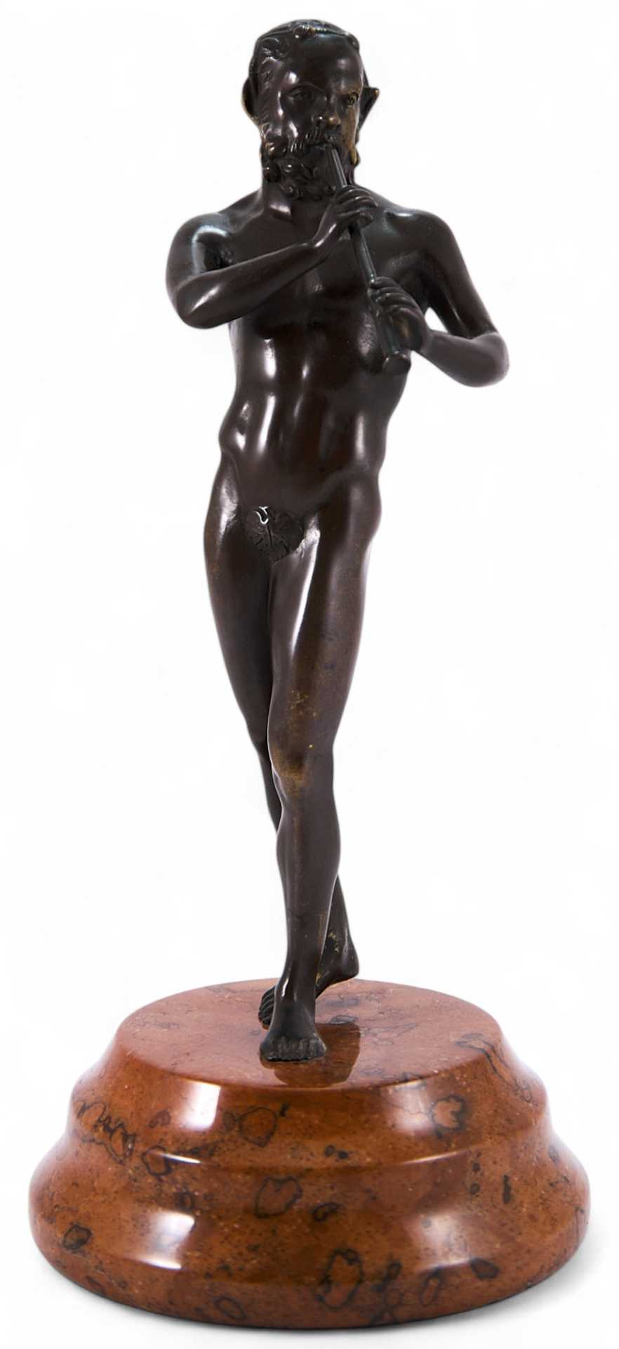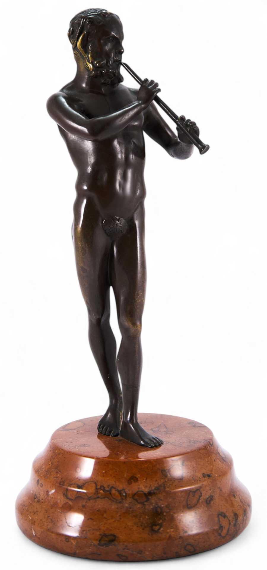Скульптура играющего на дудочке сатира, установленного на мраморном основании. Первые упоминания о сатирах - лесных существах, полулюдях-полукозлах, относятся к VIII столетию до н. э. Мифы о них связаны с культом Диониса, бога виноделия и веселья, которого римляне называли Вакхом (Бахусом). В греческих и римских легендах сатиры и их двойники - фавны, сильваны, силены, паны -выступали чаще всего как проказники, шуты, трусишки, пьяницы, сластолюбцы, обманщики и развратники. Скульптура представляет собой типичный пример кабинетной бронзовой пластики первой трети XX в. довольно популярной в Европе.