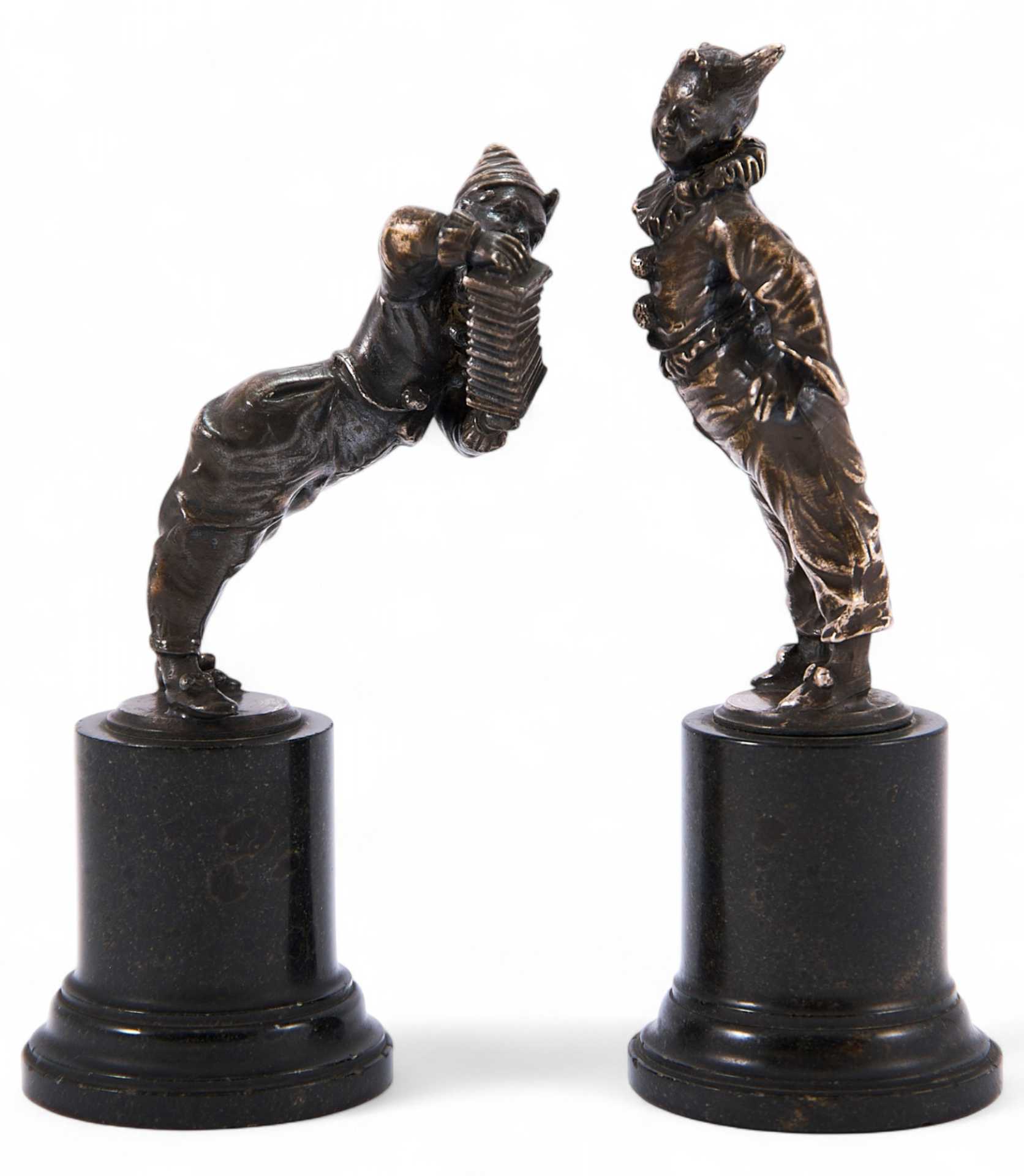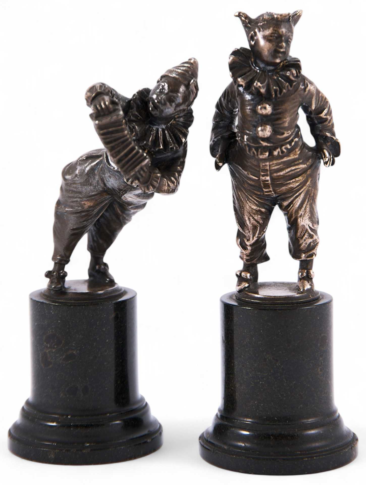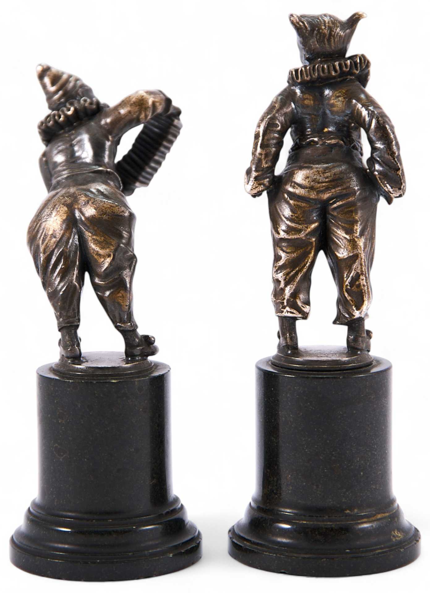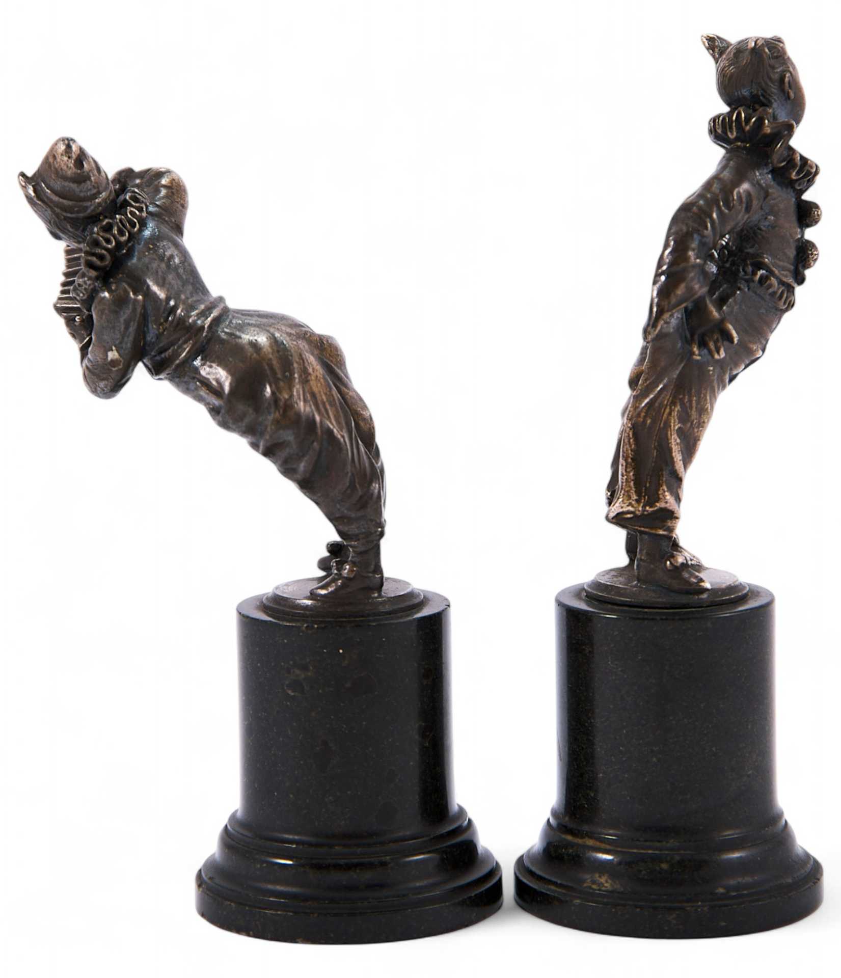Представлены две парные скульптуры представляющие цирковых клоунов на мраморных подставках. Скульптура представляет собой типичный пример кабинетной бронзовой пластики начала XX в. довольно популярной в Европе.