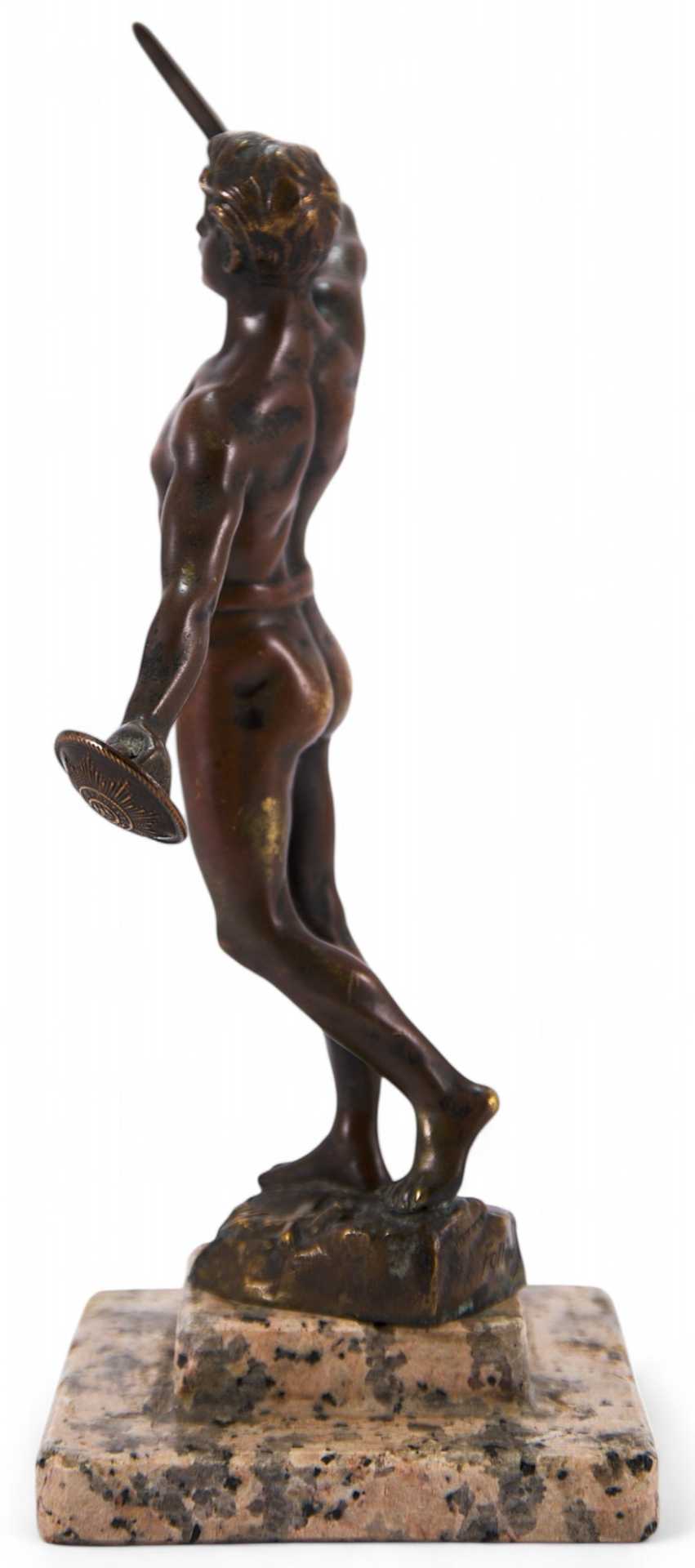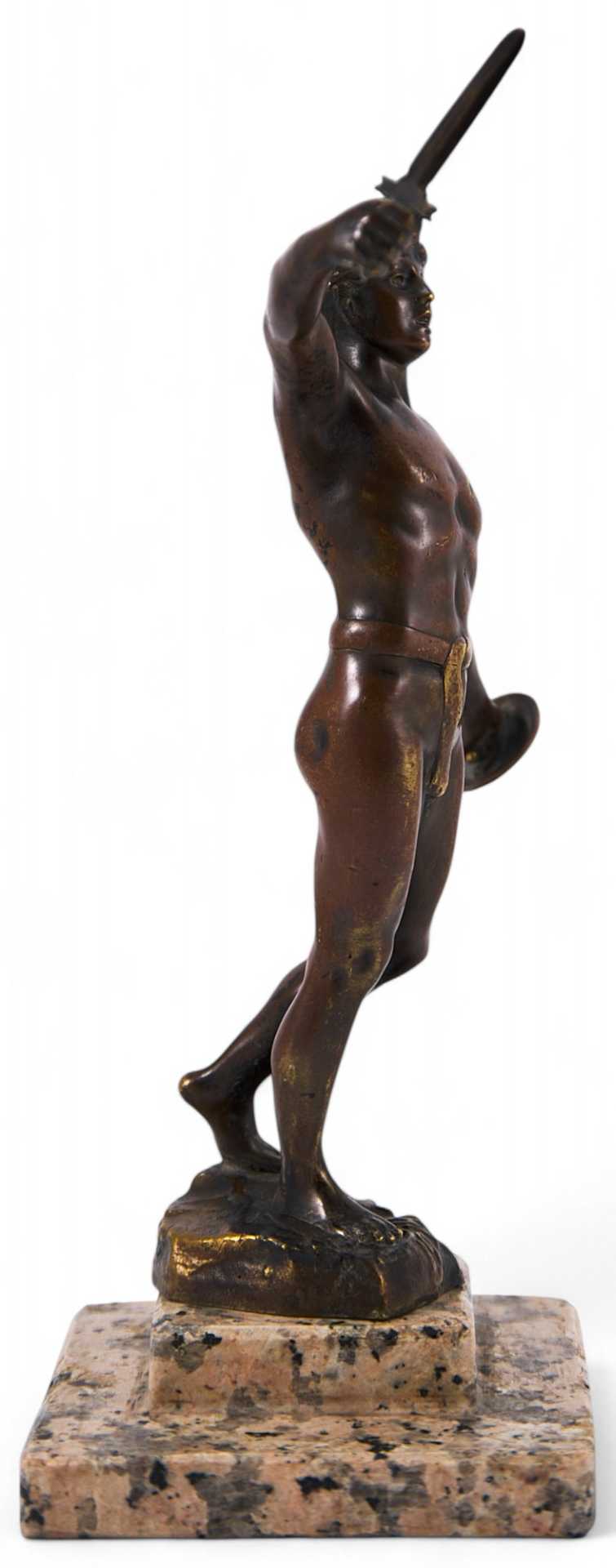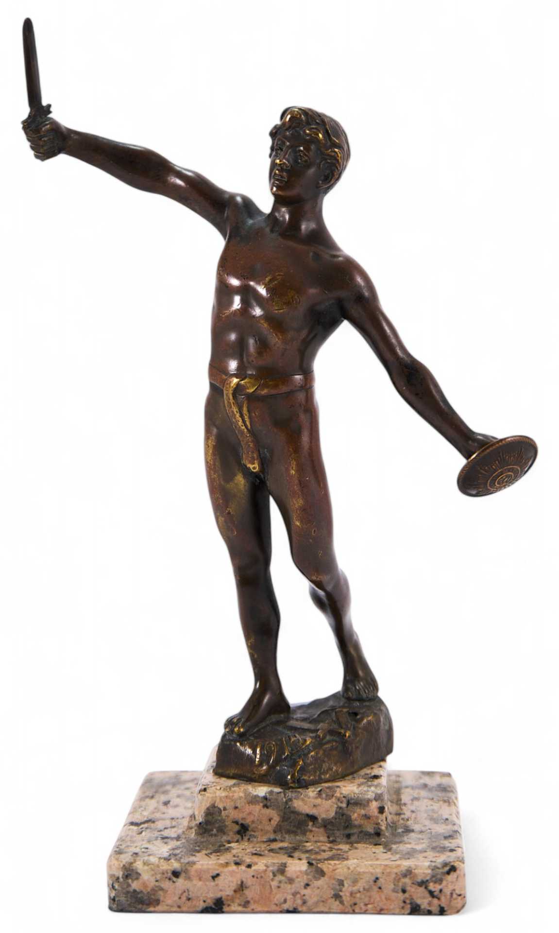 коротким мечом в правой. Фигура практически обнажена - из облачения присутствует лишь набедренная повязка, что говорит о стремлении автора показать не столько историческую значимость, сколько идеальную красоту тела античного юноши. Пропорции фигуры близки к идеальным; несмотря на малый размер, композиция производит впечатление монументальной; выбранный же материал —бронза — позволил скульптору еще более усилить эффект пластичности и рельефности мужского тела. Представленная скульптура является превосходным образцом европейского академического искусства начала XX века.